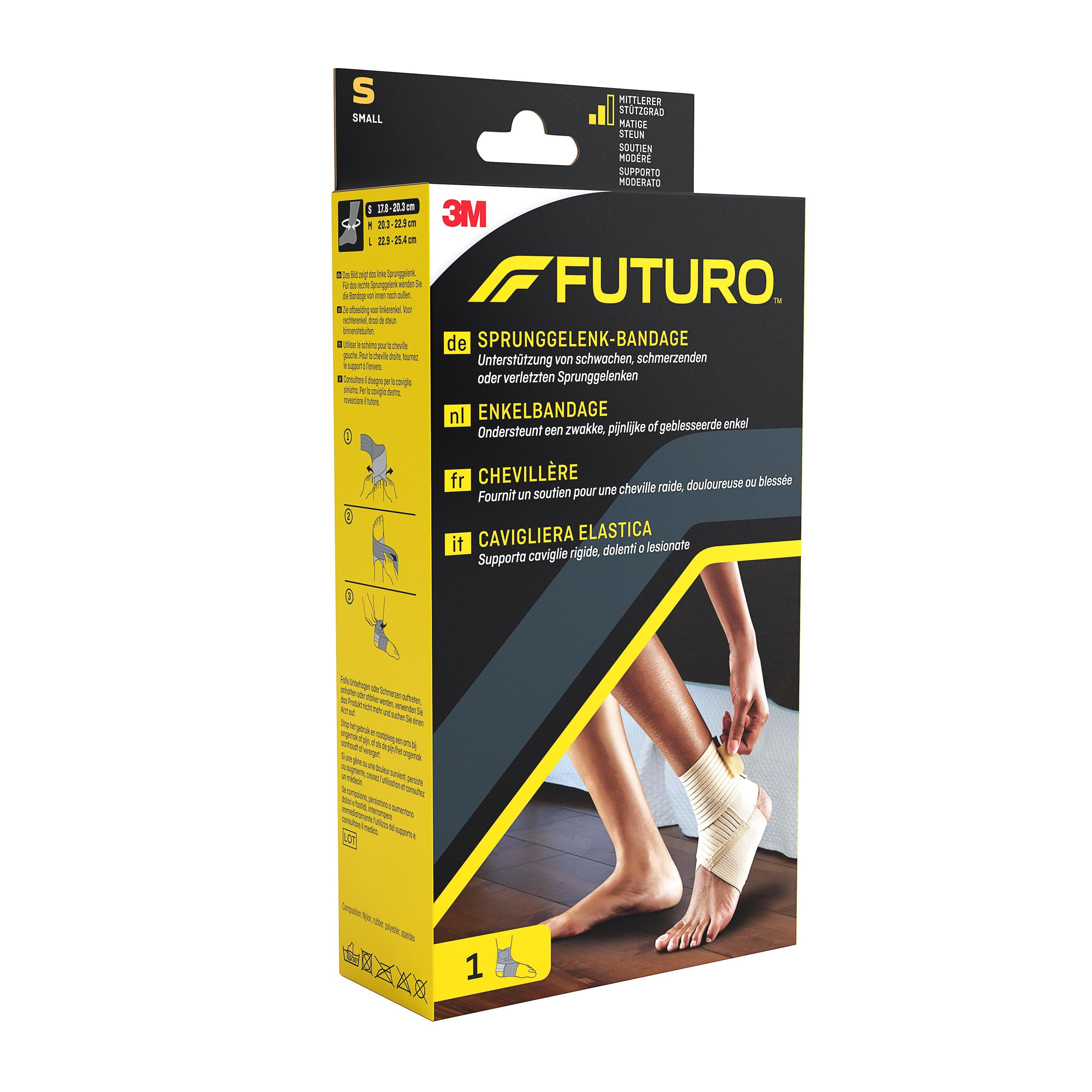 Die Futuro Sprunggelenkbandage ist konzipiert worden um verletzte Sprunggelenke zu entlasten. Diese Sprunggelenkbandage verfügt über einen anpassbaren Gurt für die individuelle Stabilisierung des Sprunggelenks, wobei das hautfreundliche, atmungsaktive Material für einen optimalen Tragekomfort sorgt. Das Material der Bandage trägt im Schuh kaum auf und lässt sich daher gut mit einem herkömmlichen Schuh tragen. Mithilfe eines Klettverschlusses kann die Kompression zudem angepasst werden. Die Bandage vermag den Knöchel zu stabilisieren und hilft so bei Schmerzen, Verstauchungen und instabielem Knöchel die Überbelastungen zu mindern.