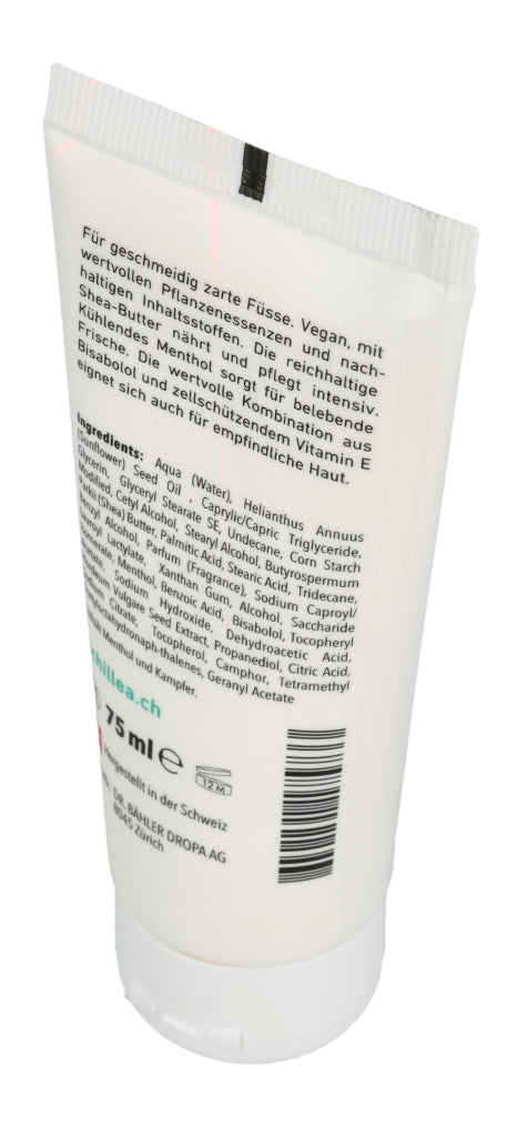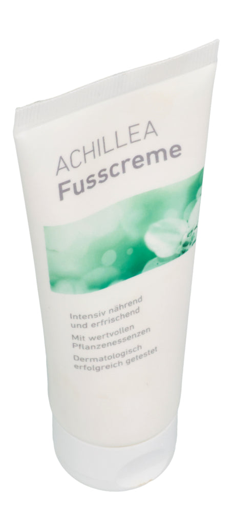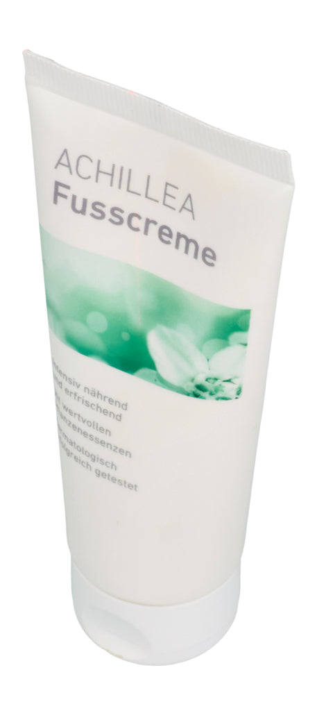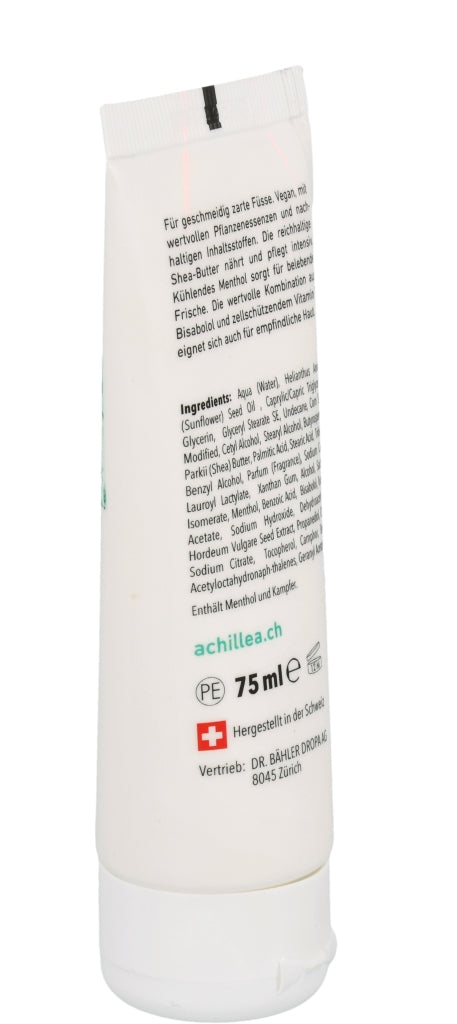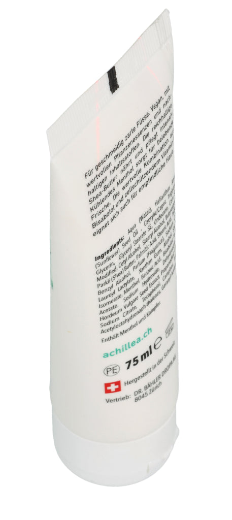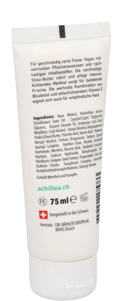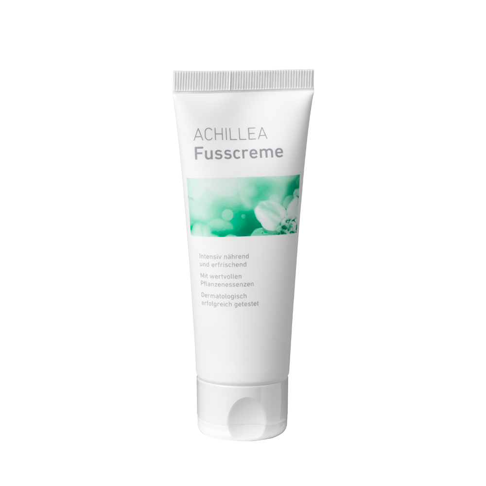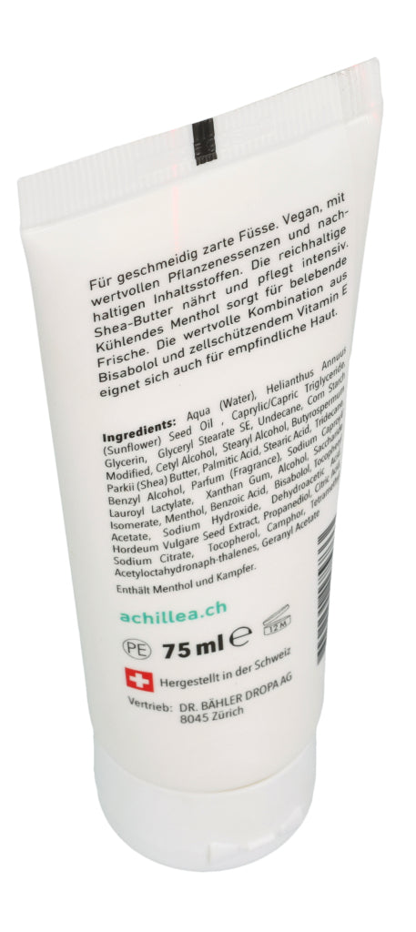 Die ACHILLEA Fusscreme sorgt auch bei rauer und empfindlicher Haut für geschmeidig zarte Füsse. Die vegane Formulierung enthält wertvolle Pflanzenessenzen, die pflegen und regenerieren. Kühlendes Menthol steuert angenehm belebende Frische bei.
