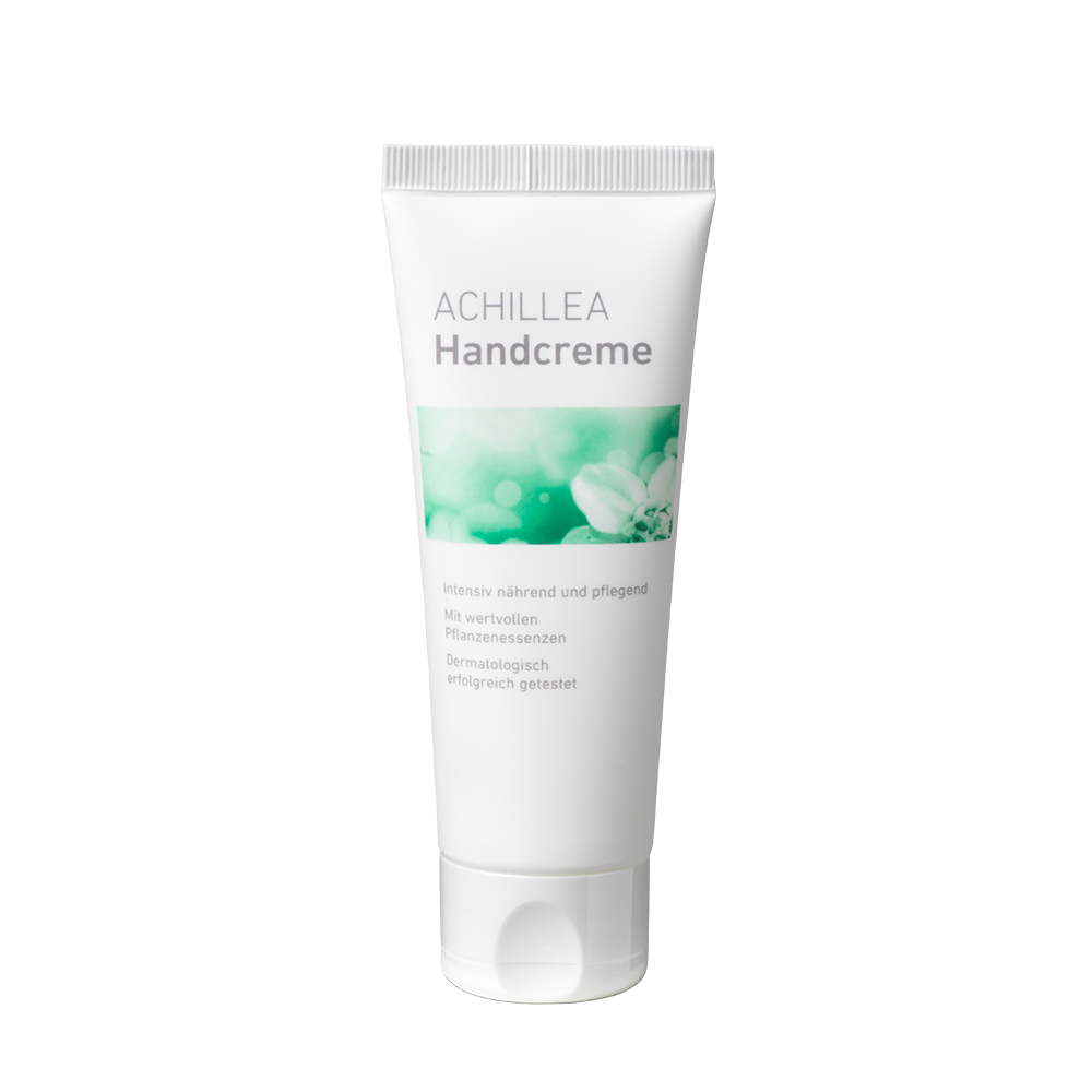 Die zart duftende ACHILLEA Handcreme pflegt stark beanspruchte Hände mit rissiger und aufgesprungener Haut. Neben den pflanzlichen Stoffen wie Schafgarbe, Kamille und Sonnenblumenöl enthält die ACHILLEA Handcreme auch Vitamin E, es unterstützt die natürliche Schutzbarriere der Haut. Zur Anwendung genügt eine erbsengrosse Menge: Auftragen und einmassieren, bis die Creme vollständig eingezogen ist.