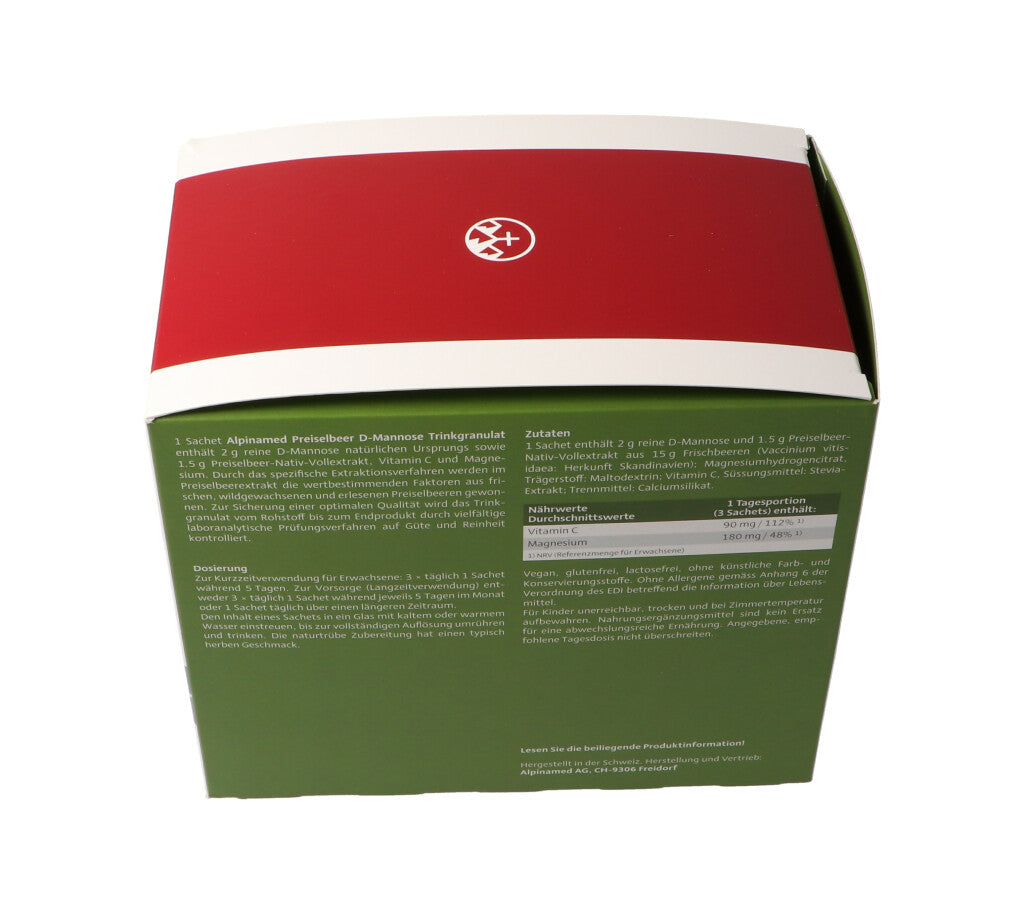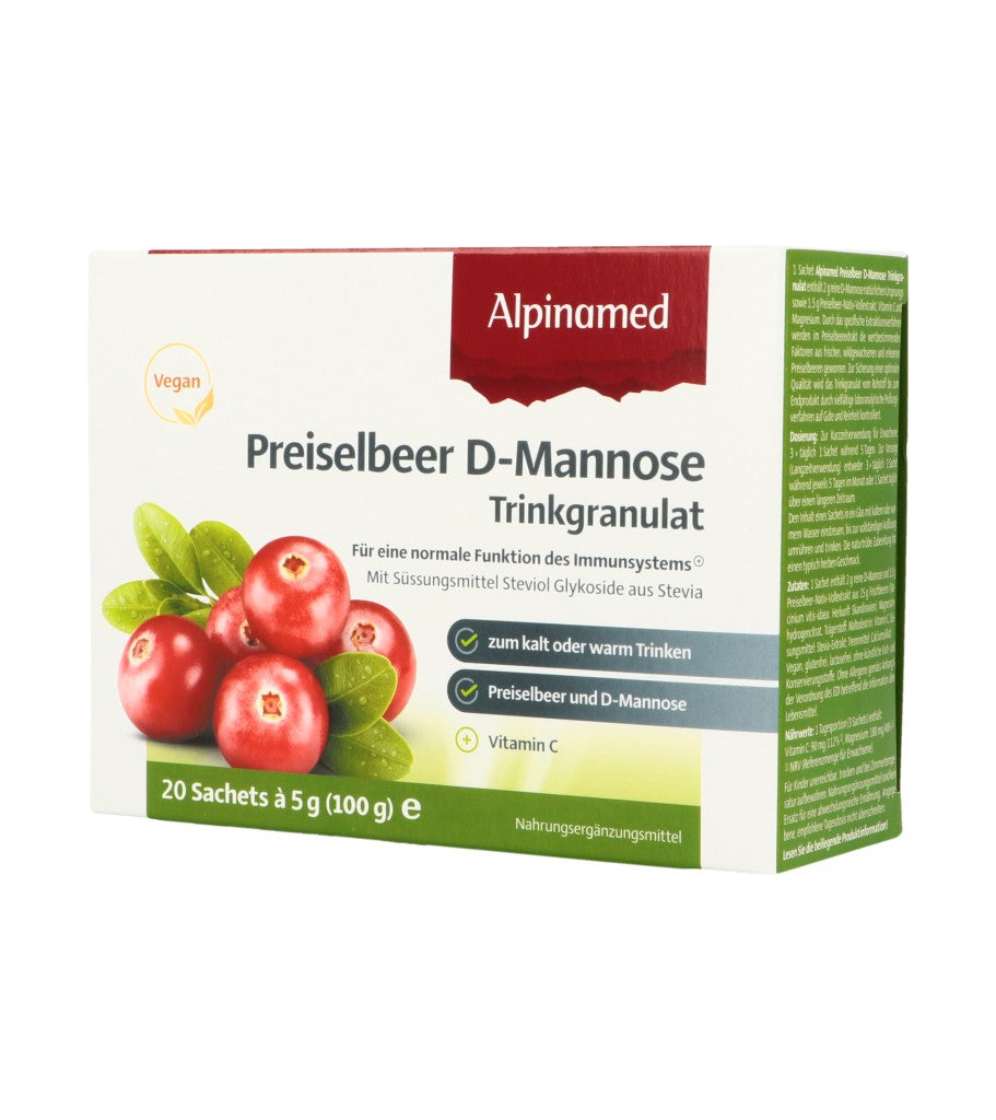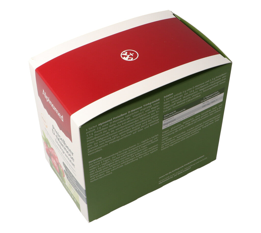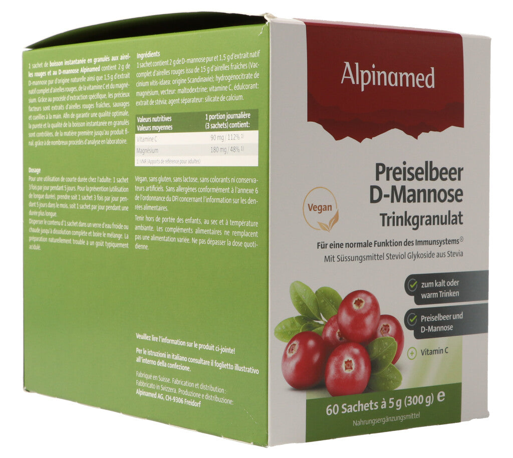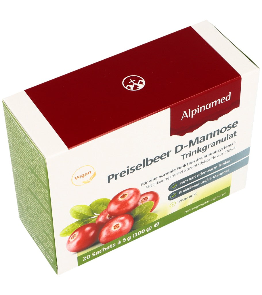 Im Gegensatz zu klassischen D-Mannose Produkten enthält Alpinamed Preiselbeer D-Mannose Trinkgranulat zusätzlich zur D-Mannose einen besonderen Spezialextrakt aus der frischen europäischen Preiselbeere, sowie Vitamin C und Magnesium. Hochkonzentrierter nativer Preiselbeerextraktund D-Mannose bilden eine ideale Synergie.