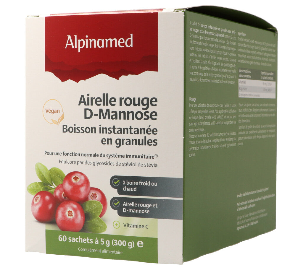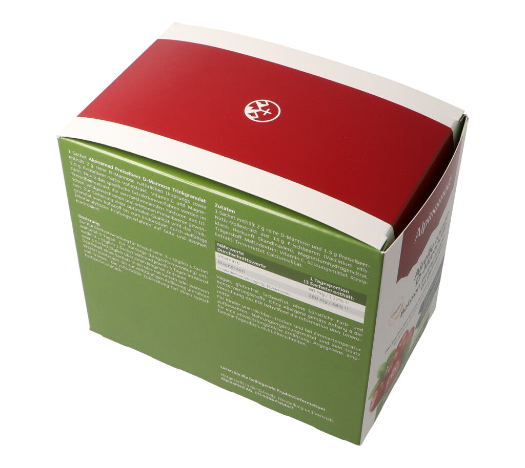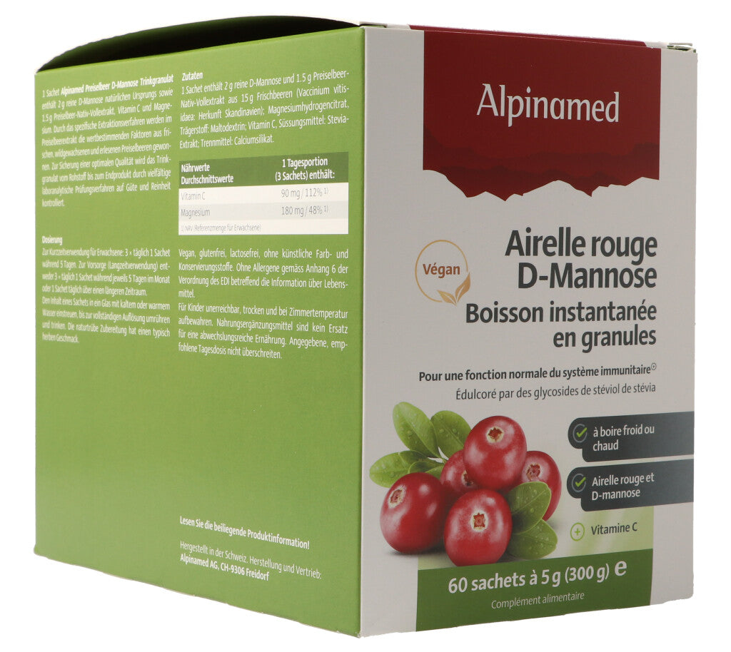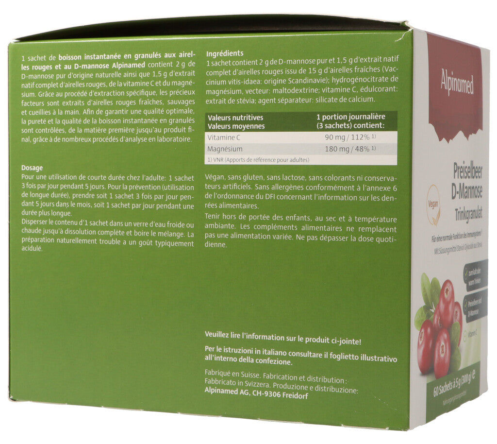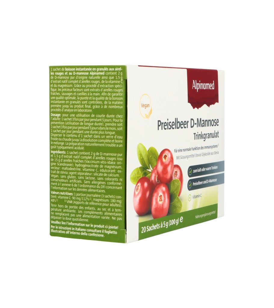 Im Gegensatz zu klassischen D-Mannose Produkten enthält Alpinamed Preiselbeer D-Mannose Trinkgranulat zusätzlich zur D-Mannose einen besonderen Spezialextrakt aus der frischen europäischen Preiselbeere, sowie Vitamin C und Magnesium. Hochkonzentrierter nativer Preiselbeerextraktund D-Mannose bilden eine ideale Synergie.