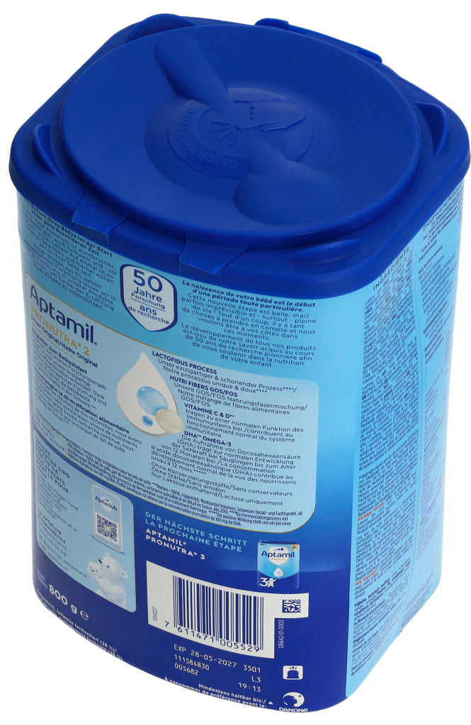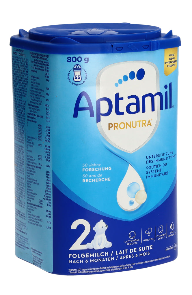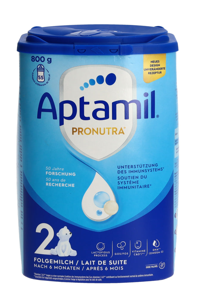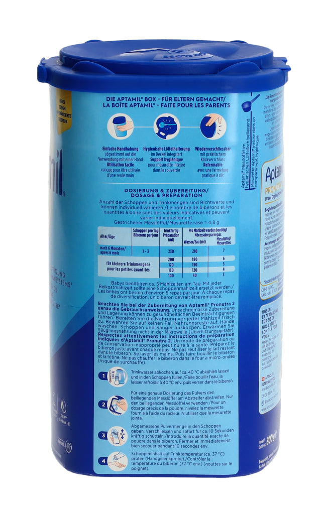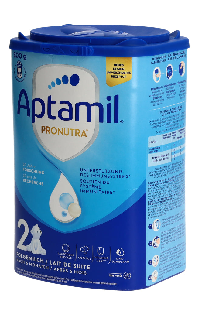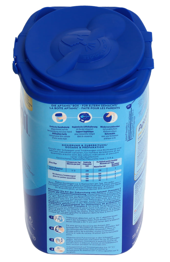 Aptamil Pronatura 2 eignet sich für Säuglinge nach 6 Monaten im Rahmen einer gemischten Kost, im Anschluss an Aptamil Pronatura 1 oder jede andere Säuglingsnahrung.