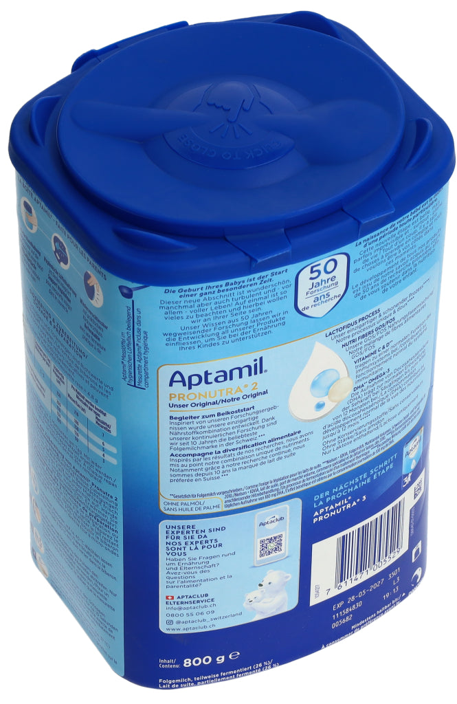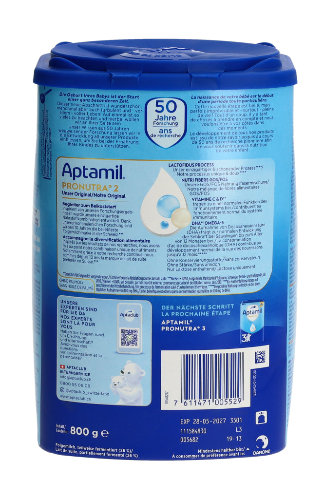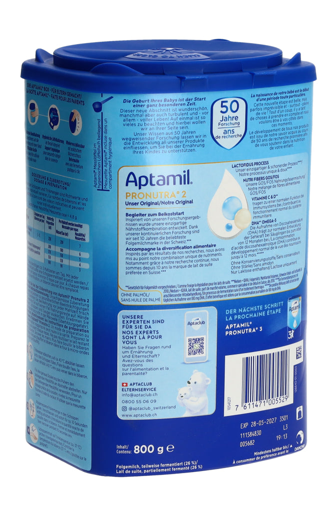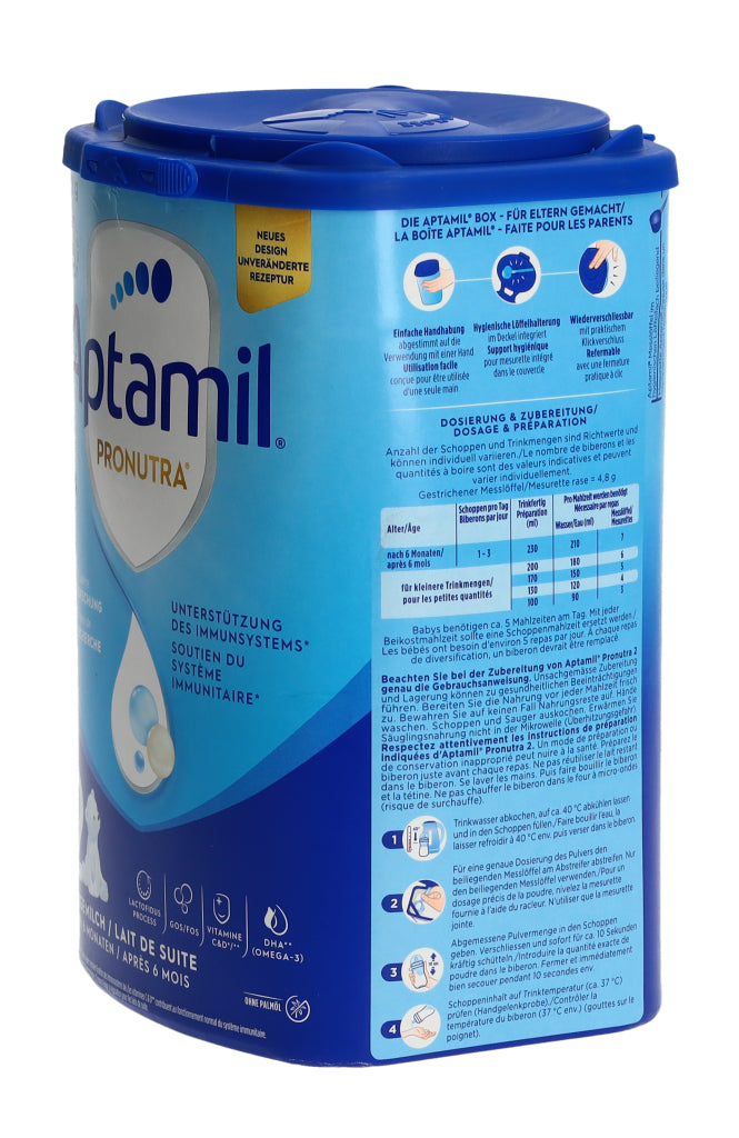 Aptamil Pronutra Folgemilch - Unser Original. Seit 10 Jahren die Nr. 1 bei Schweizer Eltern* und stets weiterentwickelt. Aptamil Pronutra Folgemilch - Unser stets weiterentwickeltes, bewährtes und beliebtes Original enthält wichtige Nährstoffe für dein Baby nach dem Stillen. Basierend auf 50 Jahren Muttermilchforschung: Aptamil Pronutra X ist hergestellt mit unserem schonendem Lactofidus® Prozess und natürlich mit unserer besonderen Aptamil-Rezeptur mit Nutri-Fibers GOS/FOS und allen wichtigen Nährstoffen, wie u.a. Vitamin C & D**. Ohne Stärke & ohne Palmöl. *Nielsen + IQVIA, Folgemilch, Marktanteil Volumen, Schweizer Detail- und Fachhandel, ab 2010 **Gesetzlich für Folgenahrung vorgeschrieben. Wichtiger Hinweis: Stillen ist ideal für Ihr Kind. Folgemilch eignet sich nur für Kinder ab 6 Monaten. Lassen Sie sich beraten. Eure Milchmomente sind so individuell wie ihr. Jedes Baby, jede Familie und wie sie das Elternsein erlebt, all das ist einzigartig. Es gibt keine «Einheitslösung» und keine «Formel». Jede Familie hat eine andere Geschichte. Inspiriert von 50 Jahren Muttermilchforschung bietet Aptamil daher hochwertige Folgemilchen an, die auf eure individuellen Bedürfnisse abgestimmt sind. Darüber hinaus ist unser Aptaclub Expertenteam immer für euch da, so wie ihr für euer Baby. Mit individueller Beratung rund um Schwangerschaft, Geburt und Baby – kostenlos und ohne Anmeldung. Wir freuen uns auf eure Kontaktaufnahme (Telefon: 0800 55 06 09 | Mail: info@aptaclub.ch). Aptamil - Euer Leben. Unsere Wissenschaft.