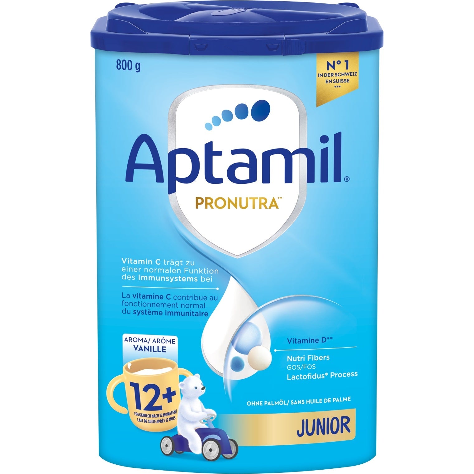 Aptamil Pronutra Junior - Unser Original. Seit 10 Jahren die Nr. 1 bei Schweizer Eltern* und stets weiterentwickelt. Aptamil Pronutra Junior Folgemilch, 800g als Pulver (ergibt ca. 34 Tassen mit je 170ml) - Unsere weiterentwickelte Rezeptur schmeckt kleinen Entdeckern, als Teil einer ausgewogenen und abwechslungsreichen Ernährung, am Abend und zum Frühstück. Basierend auf 50 Jahren Muttermilchforschung: Aptamil Pronutra Junior ist auf die Ernährungsbedürfnisse von Kleinkindern abgestimmt. Sie ist hergestellt mit unserem schonendem Lactofidus® Prozess und natürlich mit unserer besonderen Aptamil-Rezeptur mit Nutri-Fibers GOS/FOS und allen wichtigen Nährstoffen, wie u.a. Vitamin C & D**. Ohne Stärke & ohne Palmöl. *Nielsen + IQVIA, Folgemilch, Marktanteil Volumen, Schweizer Detail- und Fachhandel, ab 2010 **Gesetzlich für Folgenahrung vorgeschrieben. Wichtiger Hinweis: Stillen ist ideal für Ihr Kind. Folgemilch eignet sich nur für Kinder ab 6 Monaten. Lassen Sie sich beraten. Eure Milchmomente sind so individuell wie ihr. Von Tag zu Tag werden Kleinkinder immer aktiver, machen ständig neue Erfahrungen und lernen Neues. Bei diesem rasanten körperlichen, sozialen und geistigen Wachstum ist eine altersgerechte Nährstoffversorgung essenziell. Deshalb bleiben auch gemeinsame Milchmomente weiter wichtig. Darüber hinaus ist unser Aptaclub Expertenteam immer für euch da, so wie ihr für euer Baby. Mit individueller Beratung – kostenlos und ohne Anmeldung. Wir freuen uns auf eure Kontaktaufnahme (Telefon: 0800 55 06 09 | Mail: info@aptaclub.ch). Aptamil - Euer Leben. Unsere Wissenschaft.