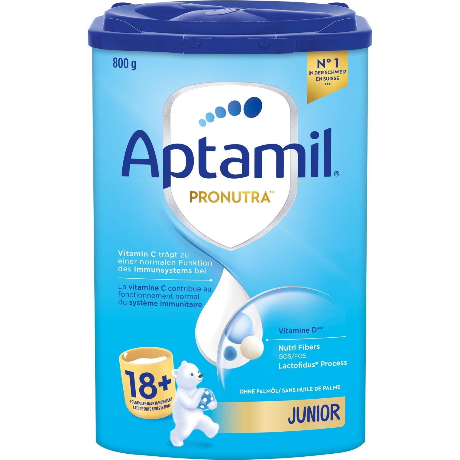 Aptamil Pronutra Junior - Unser Original. Seit 10 Jahren die Nr. 1 bei Schweizer Eltern* und stets weiterentwickelt. Aptamil Pronutra Junior Folgemilch, 800g als Pulver (ergibt ca. 34 Tassen mit je 170ml) - Unsere weiterentwickelte Rezeptur schmeckt kleinen Entdeckern, als Teil einer ausgewogenen und abwechslungsreichen Ernährung, am Abend und zum Frühstück. Basierend auf 50 Jahren Muttermilchforschung: Aptamil Pronutra Junior ist auf die Ernährungsbedürfnisse von Kleinkindern abgestimmt. Sie ist hergestellt mit unserem schonendem Lactofidus® Prozess und natürlich mit unserer besonderen Aptamil-Rezeptur mit Nutri-Fibers GOS/FOS und allen wichtigen Nährstoffen, wie u.a. Vitamin C & D**. Ohne Stärke & ohne Palmöl. *Nielsen + IQVIA, Folgemilch, Marktanteil Volumen, Schweizer Detail- und Fachhandel, ab 2010 **Gesetzlich für Folgenahrung vorgeschrieben. Wichtiger Hinweis: Stillen ist ideal für Ihr Kind. Folgemilch eignet sich nur für Kinder ab 6 Monaten. Lassen Sie sich beraten. Eure Milchmomente sind so individuell wie ihr. Von Tag zu Tag werden Kleinkinder immer aktiver, machen ständig neue Erfahrungen und lernen Neues. Bei diesem rasanten körperlichen, sozialen und geistigen Wachstum ist eine altersgerechte Nährstoffversorgung essenziell. Deshalb bleiben auch gemeinsame Milchmomente weiter wichtig. Darüber hinaus ist unser Aptaclub Expertenteam immer für euch da, so wie ihr für euer Baby. Mit individueller Beratung – kostenlos und ohne Anmeldung. Wir freuen uns auf eure Kontaktaufnahme (Telefon: 0800 55 06 09 | Mail: info@aptaclub.ch). Aptamil - Euer Leben. Unsere Wissenschaft.