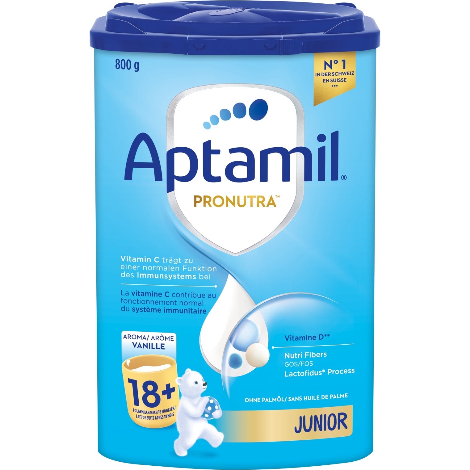 Aptamil Pronutra Junior - Unser Original. Seit 10 Jahren die Nr. 1 bei Schweizer Eltern* und stets weiterentwickelt. Aptamil Pronutra Junior Folgemilch, 800g als Pulver (ergibt ca. 34 Tassen mit je 170ml) - Unsere weiterentwickelte Rezeptur schmeckt kleinen Entdeckern, als Teil einer ausgewogenen und abwechslungsreichen Ernährung, am Abend und zum Frühstück. Basierend auf 50 Jahren Muttermilchforschung: Aptamil Pronutra Junior ist auf die Ernährungsbedürfnisse von Kleinkindern abgestimmt. Sie ist hergestellt mit unserem schonendem Lactofidus® Prozess und natürlich mit unserer besonderen Aptamil-Rezeptur mit Nutri-Fibers GOS/FOS und allen wichtigen Nährstoffen, wie u.a. Vitamin C & D**. Ohne Stärke & ohne Palmöl. *Nielsen + IQVIA, Folgemilch, Marktanteil Volumen, Schweizer Detail- und Fachhandel, ab 2010 **Gesetzlich für Folgenahrung vorgeschrieben. Wichtiger Hinweis: Stillen ist ideal für Ihr Kind. Folgemilch eignet sich nur für Kinder ab 6 Monaten. Lassen Sie sich beraten. Eure Milchmomente sind so individuell wie ihr. Von Tag zu Tag werden Kleinkinder immer aktiver, machen ständig neue Erfahrungen und lernen Neues. Bei diesem rasanten körperlichen, sozialen und geistigen Wachstum ist eine altersgerechte Nährstoffversorgung essenziell. Deshalb bleiben auch gemeinsame Milchmomente weiter wichtig. Darüber hinaus ist unser Aptaclub Expertenteam immer für euch da, so wie ihr für euer Baby. Mit individueller Beratung – kostenlos und ohne Anmeldung. Wir freuen uns auf eure Kontaktaufnahme (Telefon: 0800 55 06 09 | Mail: info@aptaclub.ch). Aptamil - Euer Leben. Unsere Wissenschaft.