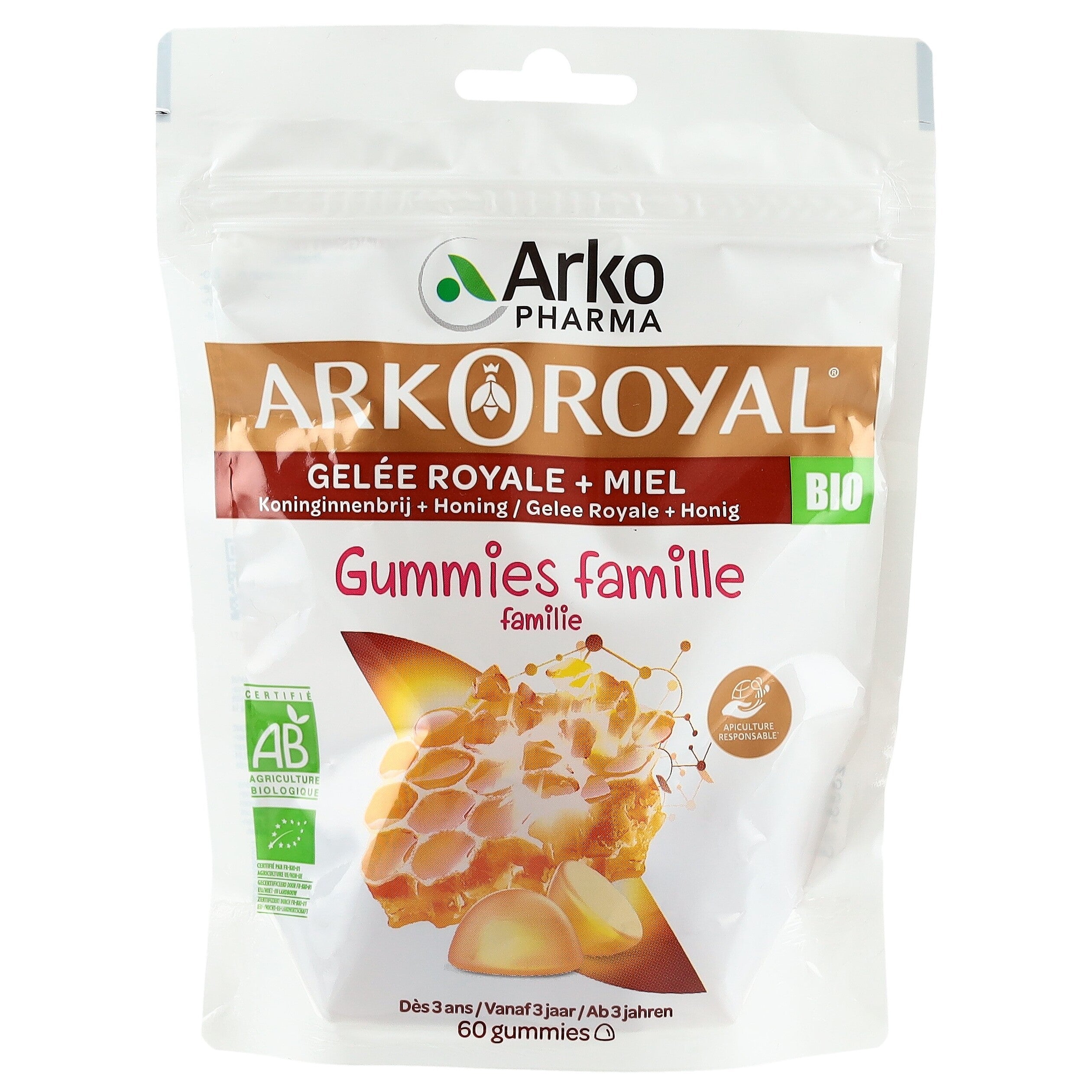 Bio-Rohrzucker, Bio-Glukosesirup, Bio-Honig, Geliermittel: Pektin, gefriergetrocknetes Bio-Gelée-Royale, Säureregulator: Zitronensäure, natürliches Orangenaroma, Bio-Sonnenblumenöl, Überzugsmittel: Bio-Carnaubawachs. Enthält Weizenstärke. Nährwerte für 1 Gummy: Honig: 180mg Gefriergetrocknetes Gelee Royale: 63mg** **entspricht 189mg frischem Gelee Royale..