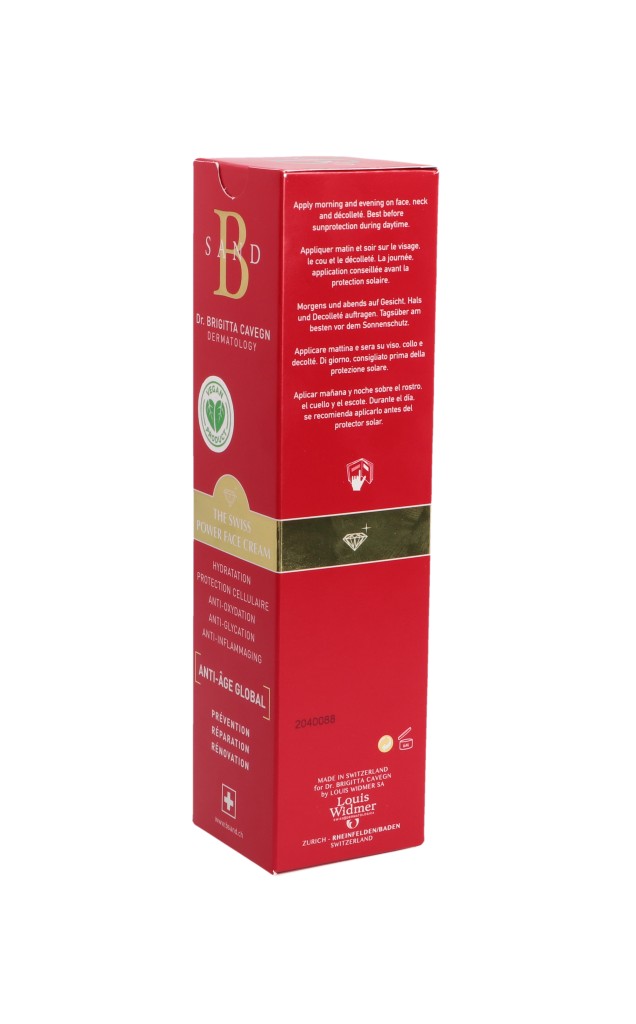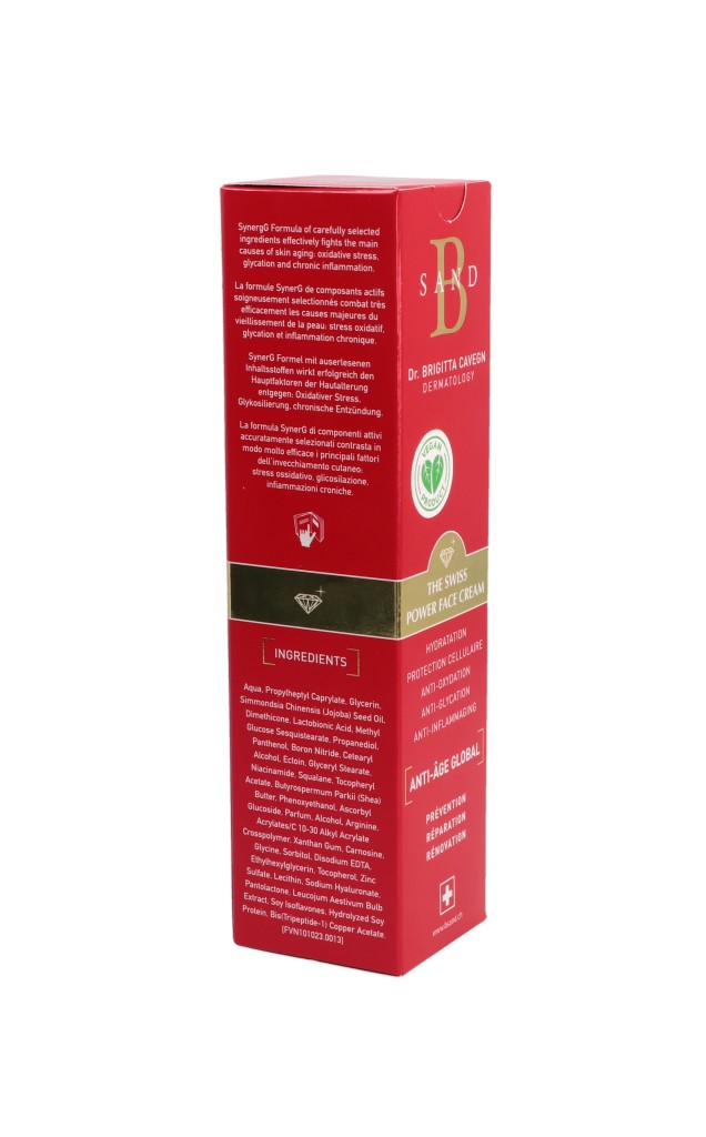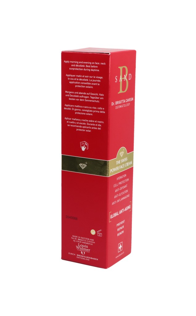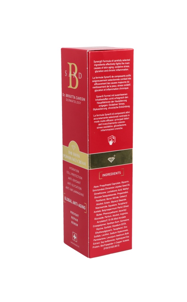 The Swiss Power Face Cream ist eine kompakte Anti-Aging Creme für Gesicht, Augen und Dekolleté, zum Schutz, der Reparation und Regeneration der Haut. Sie wirkt den drei Hauptursachen der Hautalterung entgegen: Oxidativer Stress, Verzuckerung und chronischer Mikroentzündung. Die Hautpflege ist dank der innovativen Intensiv-Formel mit 10 Supermolekülen* eine hochwirksame globale Anti-Aging- Pflege für Tag & Nacht, die Ihre Haut umfassend schützt und sämtliche Zeichen der Hautalterung wie Fältchen, Flecken, Rötungen, Trockenheit und Elastizitätsverlust wirksam bekämpft.