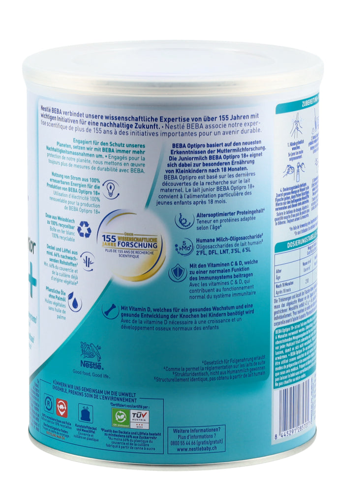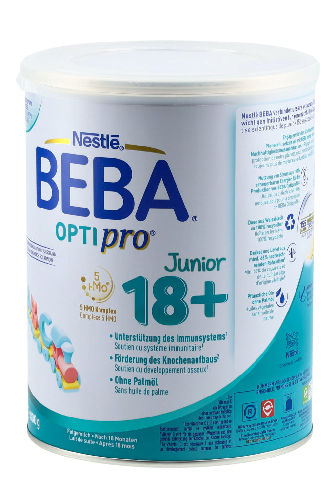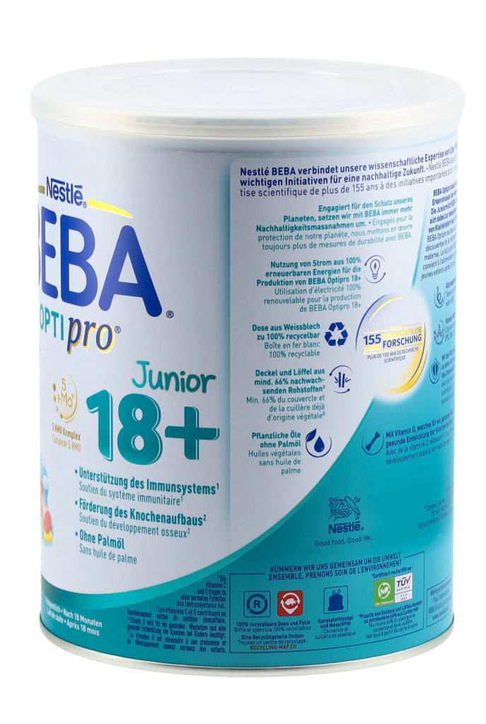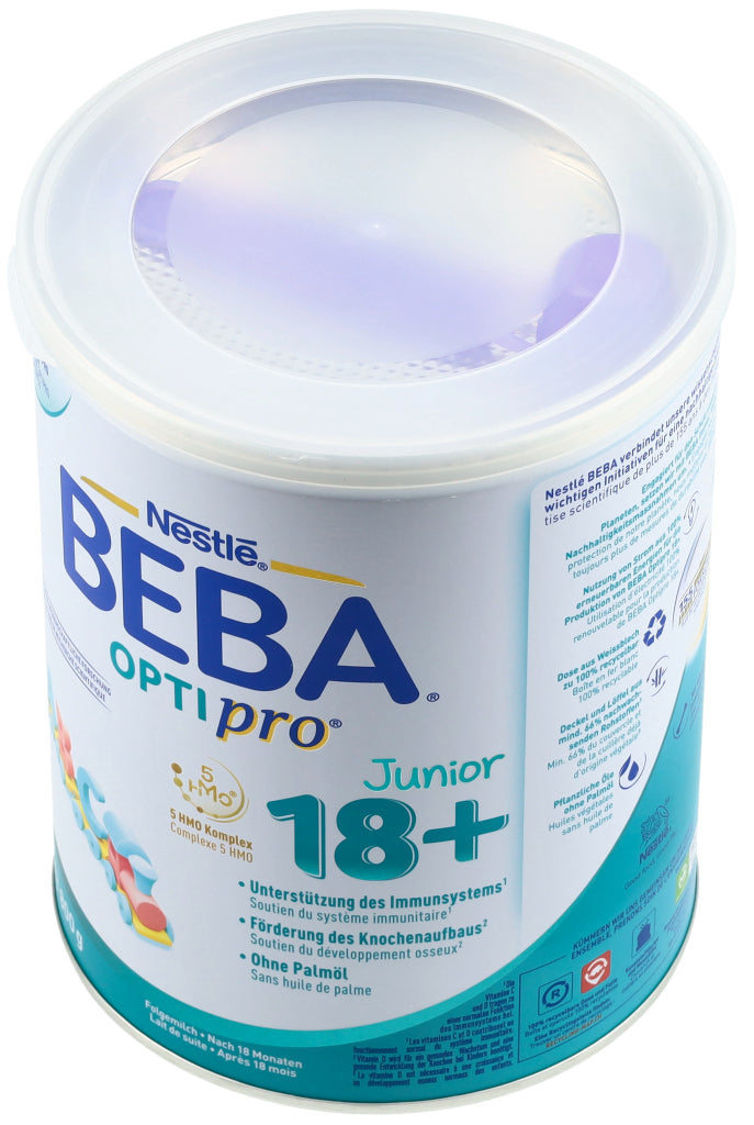 Entdecken Sie das innovativste und beste Optipro aller Zeiten! BEBA Optipro basiert auf den neuesten Erkenntnissen der Muttermilchforschung sowie auf unserer wissenschaftlichen Expertise von über 155 Jahren. Die Juniormilch BEBA Optipro 18+ eignet sich dabei zur besonderen Ernährung von Kleinkindern nach 18 Monaten. Zu den Besonderheiten der Formel zählen unter anderem ihr altersoptimierter Proteingehalt (gesetzlich für Folgenahrung erlaubt) sowie der 5 HMO Komplex mit den Humanen Milch-Oligosacchariden 2'FL (2'-Fucosyllactose), DFL, LNT, 3'SL und 6'SL (strukturidentisch, nicht aus Humanmilch gewonnen). Ausserdem unterstützt BEBA Optipro 18+ das Immunsystem durch die Vitamine C & D* und fördert den Knochenaufbau dank Vitamin D**. Ohne Palmöl. *Die Vitamine C und D tragen zu einer normalen Funktion des Immunsystems bei. **Vitamin D wird für ein gesundes Wachstum und eine gesunde Entwicklung der Knochen bei Kindern benötigt.