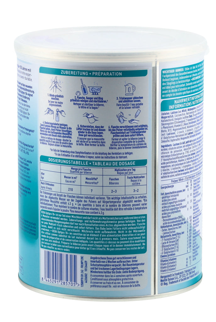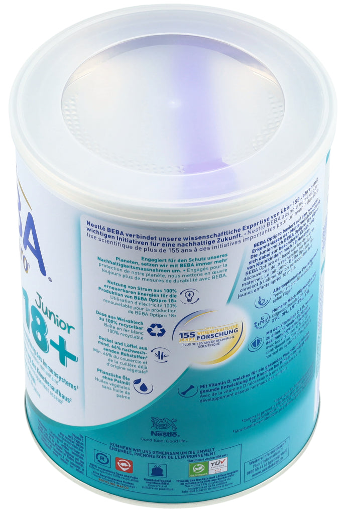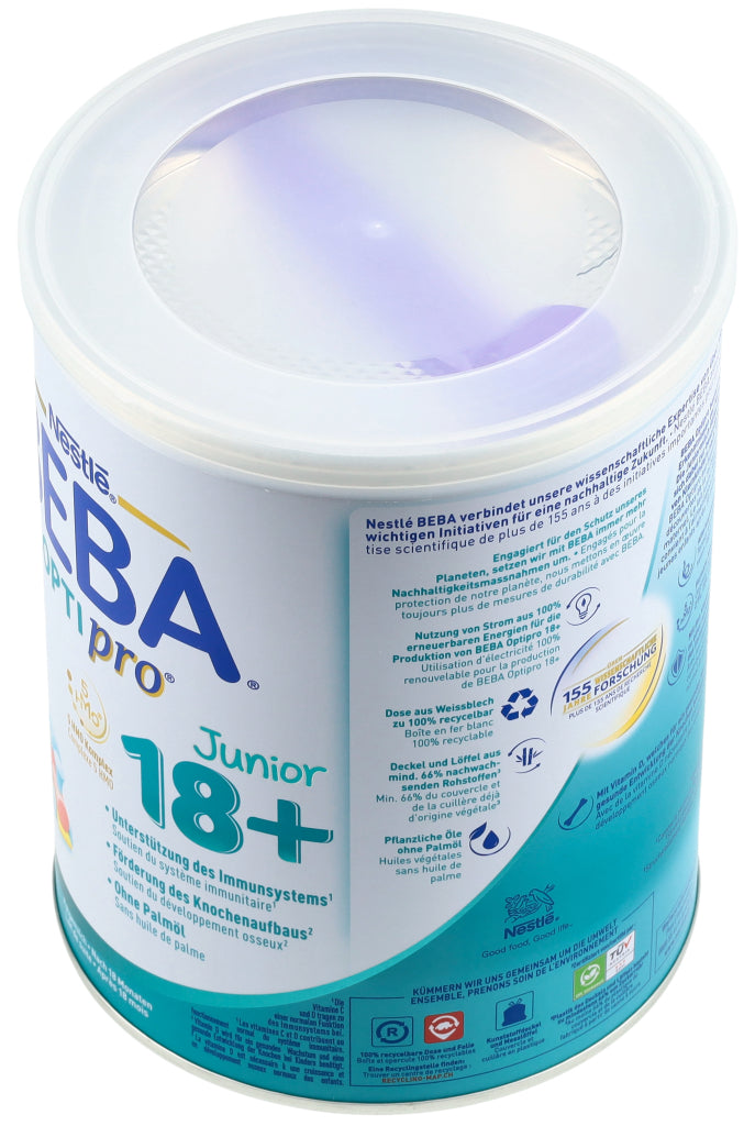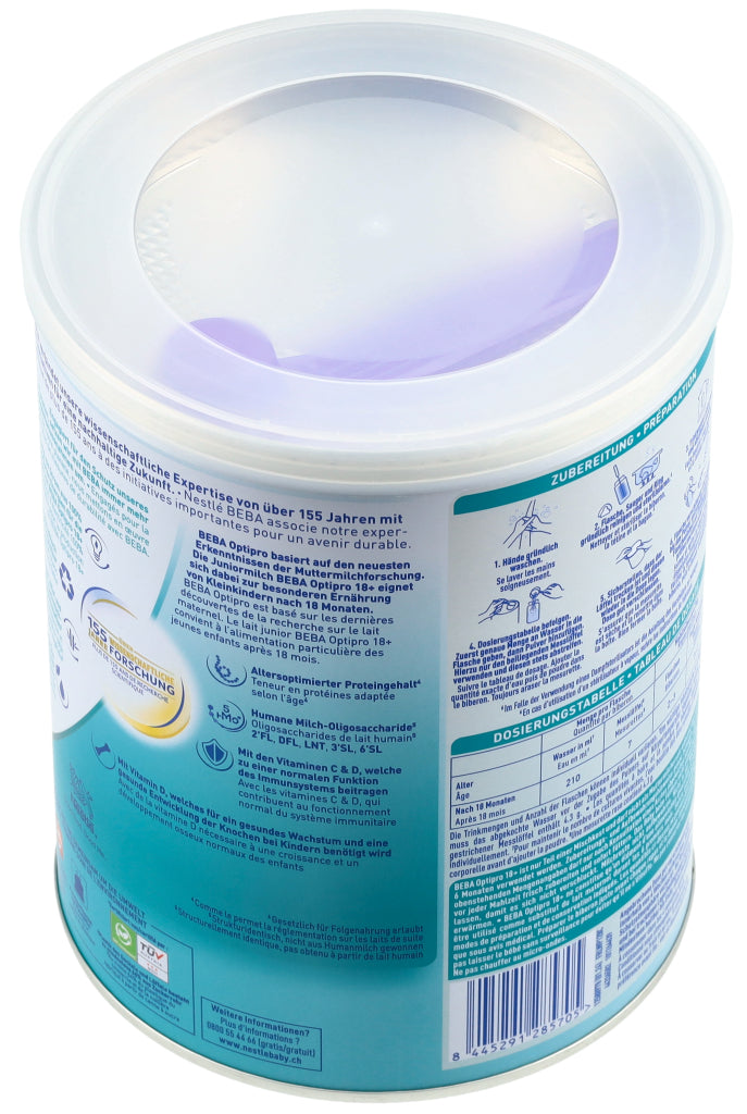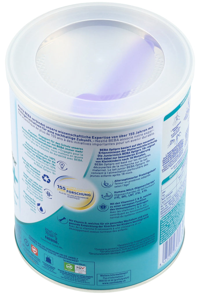 Entdecken Sie das innovativste und beste Optipro aller Zeiten! BEBA Optipro basiert auf den neuesten Erkenntnissen der Muttermilchforschung sowie auf unserer wissenschaftlichen Expertise von über 155 Jahren. Die Juniormilch BEBA Optipro 18+ eignet sich dabei zur besonderen Ernährung von Kleinkindern nach 18 Monaten. Zu den Besonderheiten der Formel zählen unter anderem ihr altersoptimierter Proteingehalt (gesetzlich für Folgenahrung erlaubt) sowie der 5 HMO Komplex mit den Humanen Milch-Oligosacchariden 2'FL (2'-Fucosyllactose), DFL, LNT, 3'SL und 6'SL (strukturidentisch, nicht aus Humanmilch gewonnen). Ausserdem unterstützt BEBA Optipro 18+ das Immunsystem durch die Vitamine C & D* und fördert den Knochenaufbau dank Vitamin D**. Ohne Palmöl. *Die Vitamine C und D tragen zu einer normalen Funktion des Immunsystems bei. **Vitamin D wird für ein gesundes Wachstum und eine gesunde Entwicklung der Knochen bei Kindern benötigt.