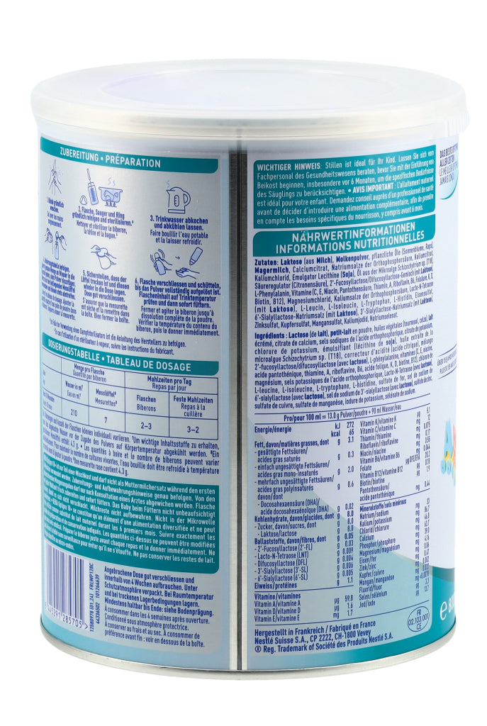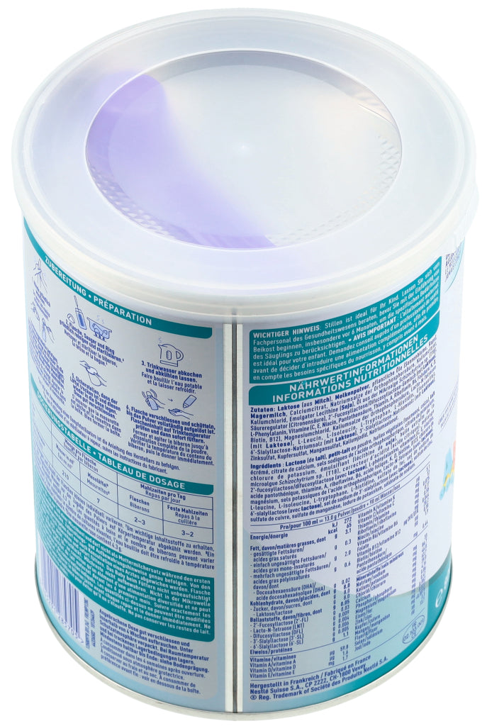 LAKTOSE (aus MILCH), MOLKENPULVER, pflanzliche Öle (Sonnenblume, Raps), MAGERMILCH, Calciumcitrat, Natriumsalze der Orthophosphorsäure, Kaliumcitrat, Kaliumchlorid, Emulgator Lecithine (SOJA), Öl aus der Mikroalge Schizochytrium sp. (T18), Säureregulator (Citronensäure), 2'-Fucosyllactose/Difucosyllactose-Gemisch (mit LAKTOSE), L-Phenylalanin, Vitamine (C, E, Niacin, Pantothensäure, Thiamin, A, Riboflavin, B6, Folsäure, K, D, Biotin, B12), Magnesiumchlorid, Kaliumsalze der Orthophosphorsäure, Lacto-N-Tetraose (mit LAKTOSE), L-Leucin, L-Isoleucin, L-Tryptophan, L-Histidin, Eisensulfat, 6'-Sialyllactose-Natriumsalz (mit LAKTOSE), 3'-Sialyllactose-Natriumsalz (mit LAKTOSE), Zinksulfat, Kupfersulfat, Mangansulfat, Kaliumjodid, Natriumselenat.