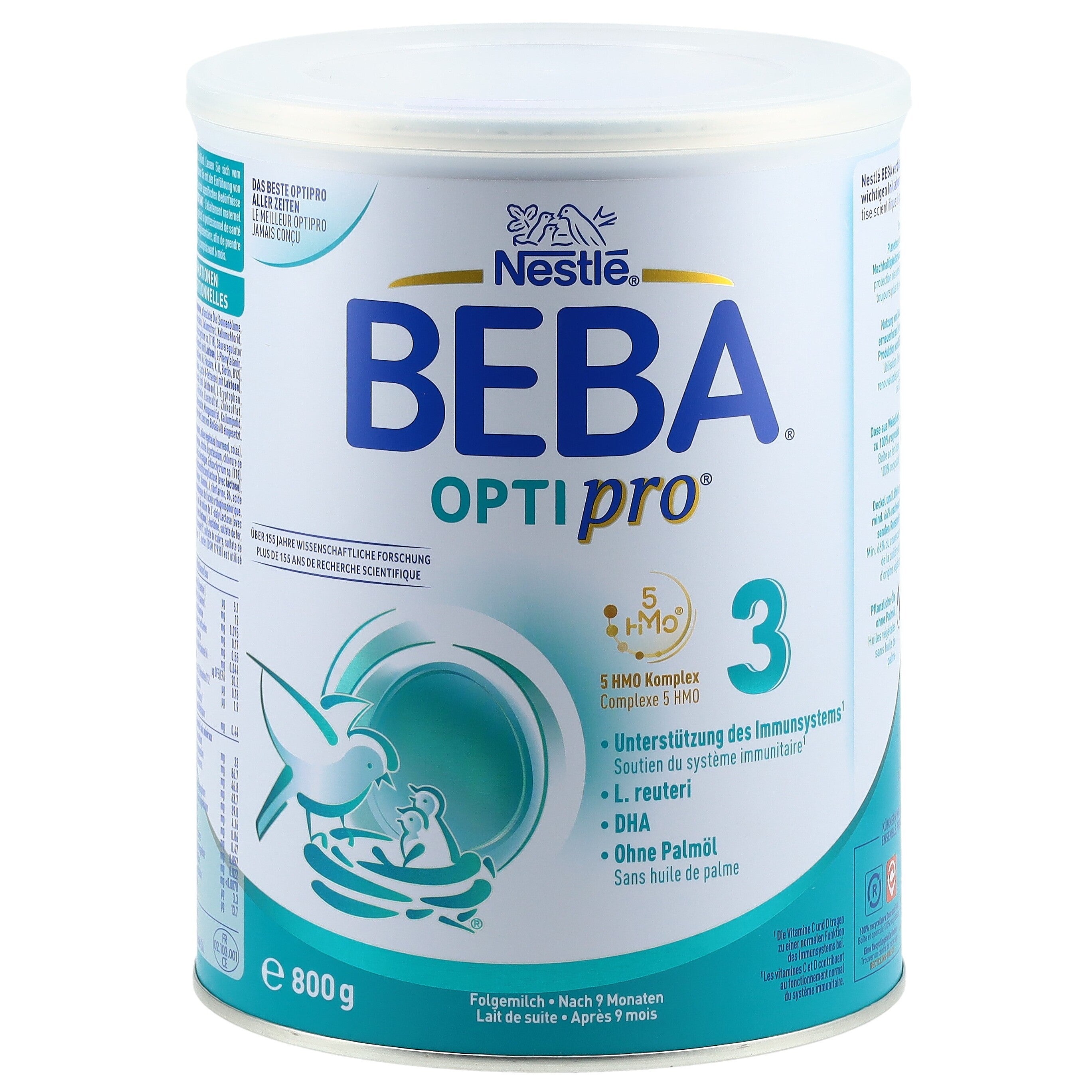 Entdecken Sie das innovativste und beste Optipro aller Zeiten! BEBA Optipro basiert auf den neuesten Erkenntnissen der Muttermilchforschung sowie auf unserer wissenschaftlichen Expertise von über 155 Jahren. Die Folgemilch BEBA Optipro 3 eignet sich dabei für Säuglinge nach 9 Monaten als Teil einer gemischten Kost, auch in Ergänzung zum Stillen. Zu den Besonderheiten der Formel zählen unter anderem ihr altersoptimierter Proteingehalt (gesetzlich für Folgenahrung erlaubt), der 5 HMO Komplex mit den Humanen Milch-Oligosacchariden 2'FL (2'-Fucosyllactose), DFL, LNT, 3'SL und 6'SL (strukturidentisch, nicht aus Humanmilch gewonnen) sowie L. reuteri (DSM 17938, exklusiv unter der Lizenz von BioGaia AB eingesetzt). Ausserdem enthält BEBA Optipro 3 die Vitamine C & D, welche zu einer normalen Funktion des Immunsystems beitragen, und DHA (Docosahexaensäure), deren Aufnahme zur normalen Entwicklung der Sehkraft bei Säuglingen bis zum Alter von 12 Monaten beiträgt (bei einer täglichen Aufnahme von 100 mg DHA). Ohne Palmöl.