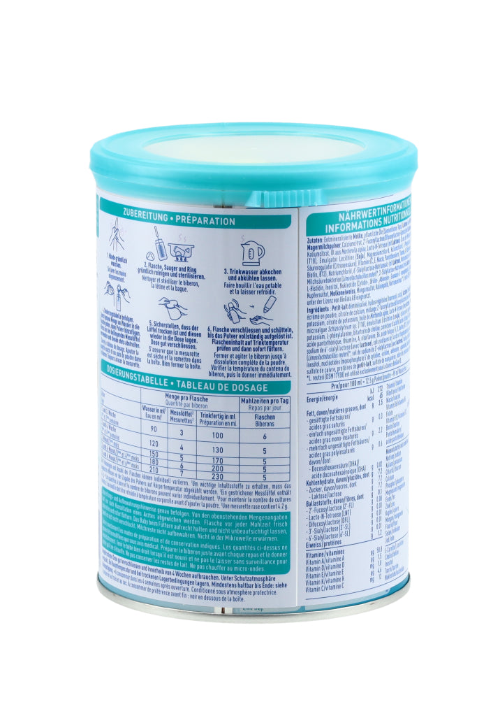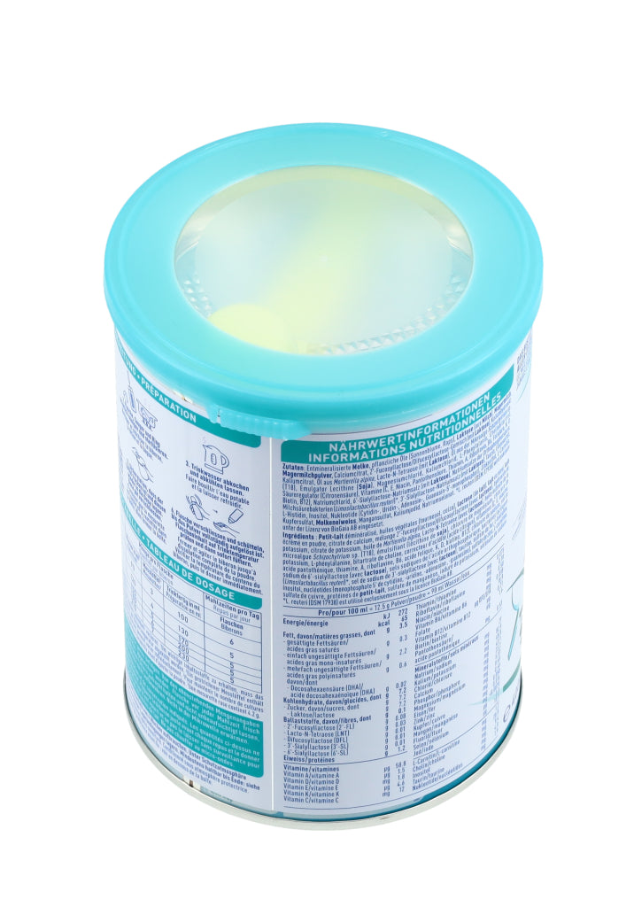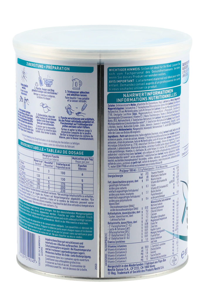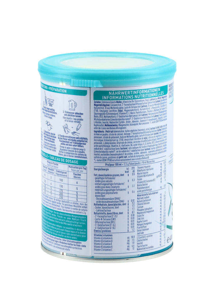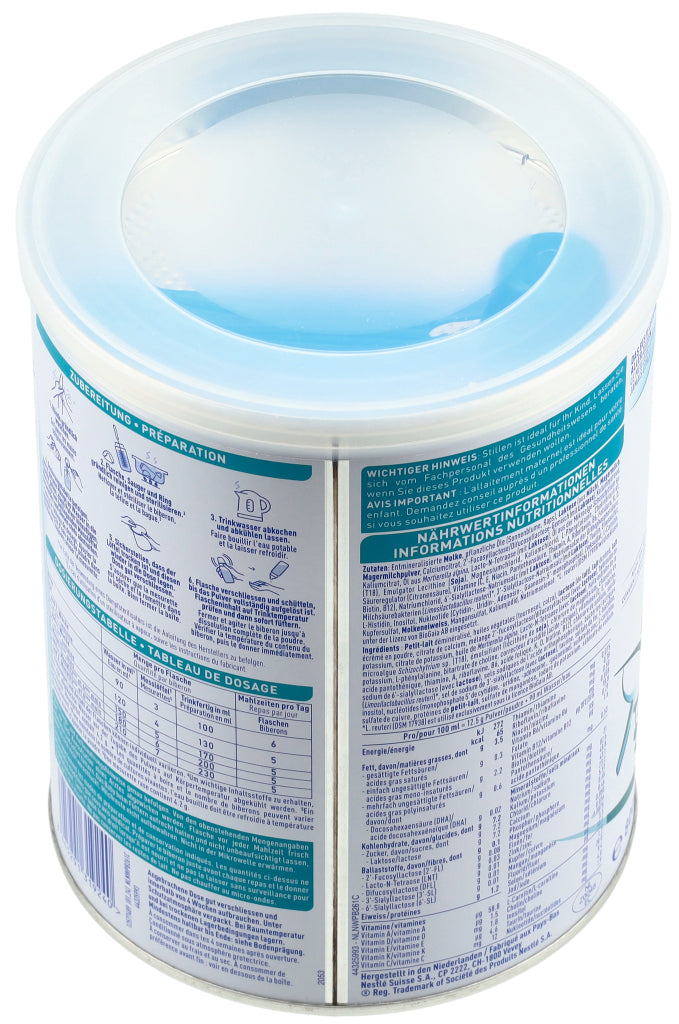 Entmineralisierte MOLKE, pflanzliche Öle (Sonnenblume, Raps), LAKTOSE (aus MILCH), MAGERMILCH, MAGERMILCHPULVER, Calciumcitrat, 2'-Fucosyllactose/Difucosyllactose-Gemisch (mit LAKTOSE), Kaliumhydroxid, Kaliumcitrat, Öl aus Mortierella alpina, Lacto-N-Tetraose (mit LAKTOSE), Öl aus der Mikroalge Schizochytrium sp. (T18), Emulgator Lecithine (SOJA), Magnesiumchlorid, Kaliumchlorid, L-Phenylalanin, Cholinbitartrat, Säureregulator (Citronensäure), Vitamine (C, E, Niacin, Pantothensäure, Thiamin, A, Riboflavin, B6, Folsäure, K, D, Biotin, B12), Natriumchlorid, 6’-Sialyllactose-Natriumsalz (mit LAKTOSE), Natriumsalze der Orthophosphorsäure, Milchsäurebakterien (Limosilactobacillus reuteri)*, 3’-Sialyllactose-Natriumsalz (mit LAKTOSE), Taurin, Eisensulfat, L-Histidin, Inositol, Nukleotide (Cytidin-, Uridin-, Adenosin-, Guanosin-5'-monophosphat), Zinksulfat, L-Carnitin, Kupfersulfat, MOLKENEIWEISS, Mangansulfat, Kaliumjodid, Natriumselenat. *L. reuteri (DSM 17938) wird exklusiv unter der Lizenz von BioGaia AB eingesetzt.