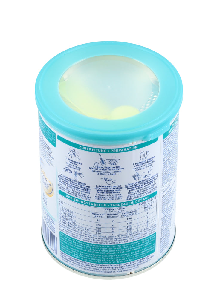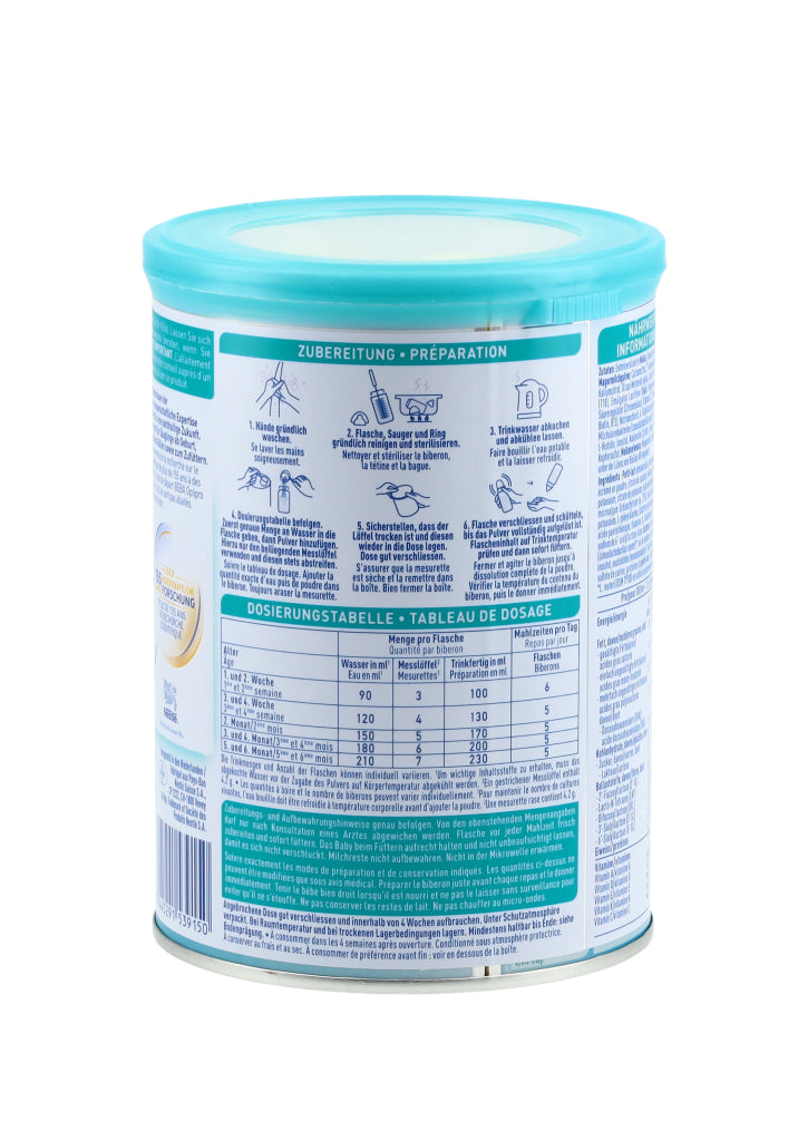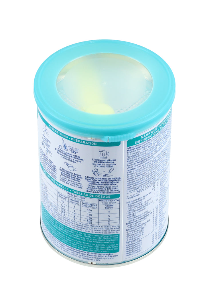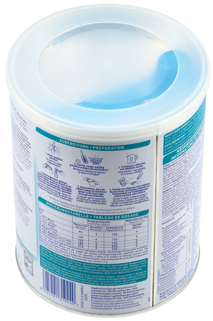 Entmineralisierte MOLKE, pflanzliche Öle (Sonnenblume, Raps), LAKTOSE (aus MILCH), MAGERMILCH, MAGERMILCHPULVER, Calciumcitrat, 2'-Fucosyllactose/Difucosyllactose-Gemisch (mit LAKTOSE), Kaliumhydroxid, Kaliumcitrat, Öl aus Mortierella alpina, Lacto-N-Tetraose (mit LAKTOSE), Öl aus der Mikroalge Schizochytrium sp. (T18), Emulgator Lecithine (SOJA), Magnesiumchlorid, Kaliumchlorid, L-Phenylalanin, Cholinbitartrat, Säureregulator (Citronensäure), Vitamine (C, E, Niacin, Pantothensäure, Thiamin, A, Riboflavin, B6, Folsäure, K, D, Biotin, B12), Natriumchlorid, 6’-Sialyllactose-Natriumsalz (mit LAKTOSE), Natriumsalze der Orthophosphorsäure, Milchsäurebakterien (Limosilactobacillus reuteri)*, 3’-Sialyllactose-Natriumsalz (mit LAKTOSE), Taurin, Eisensulfat, L-Histidin, Inositol, Nukleotide (Cytidin-, Uridin-, Adenosin-, Guanosin-5'-monophosphat), Zinksulfat, L-Carnitin, Kupfersulfat, MOLKENEIWEISS, Mangansulfat, Kaliumjodid, Natriumselenat. *L. reuteri (DSM 17938) wird exklusiv unter der Lizenz von BioGaia AB eingesetzt.