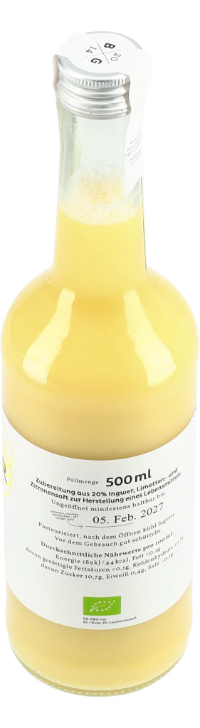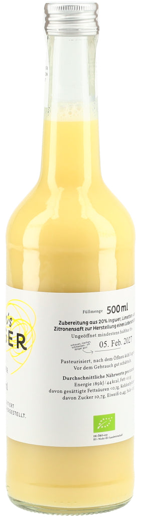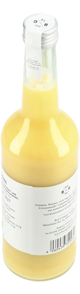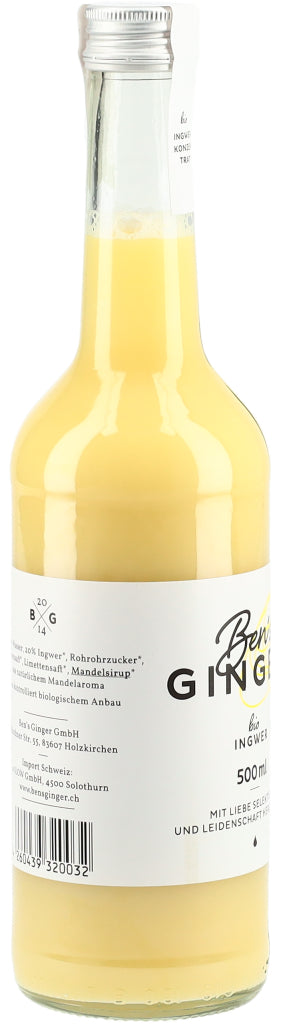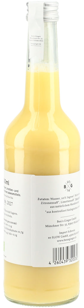 Ben's Ginger Ingwerkonzentrat wird mit Liebe und Handarbeit in einer kleinen Manufaktur aus frischem auserlesenem peruanischen Ingwer hergestellt. Der hohe Ingweranteil von 20 Prozent macht Ben's Ginger einmalig. Das Hinzufügen von etwas Zitronen- und Limettensaft ein wenig brauner Rohrzucker und einen Schuss Mandelsirup runden das Konzentrat perfekt ab. Durch das schonende Herstellungsverfahren können die vorhandenen Nährstoffe erhalten werden und eignen sich hervorragend für Ingwer Schorle, Ingwer Tee und vieles mehr.