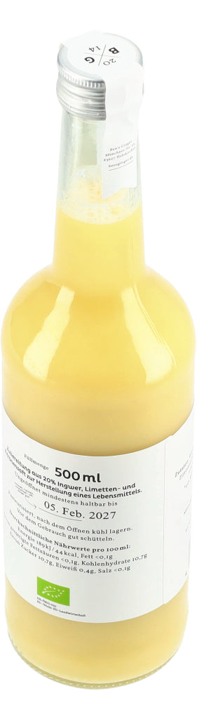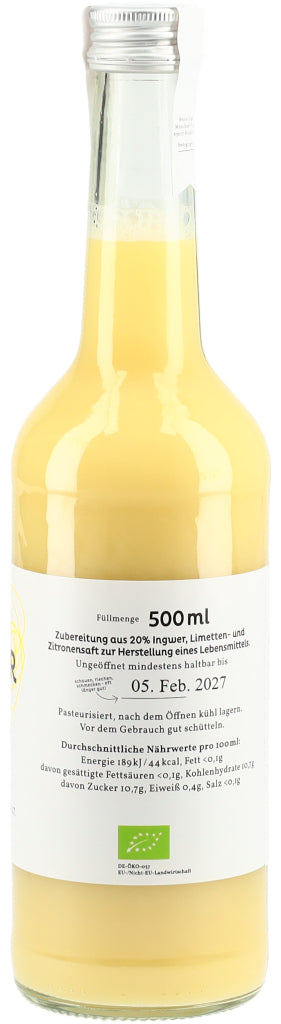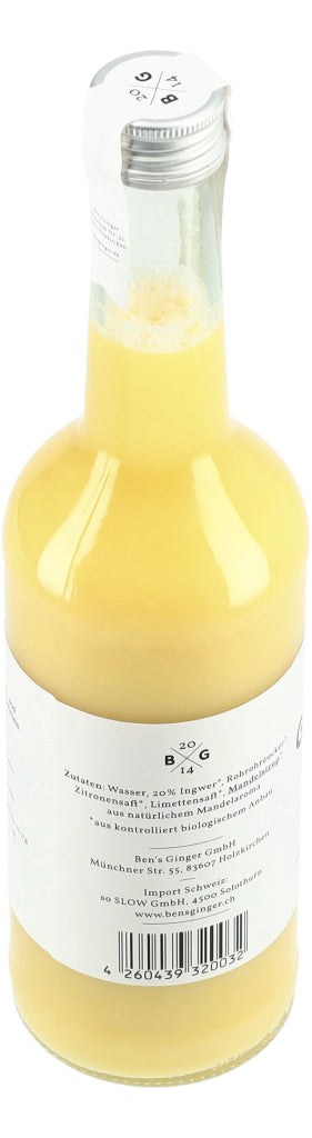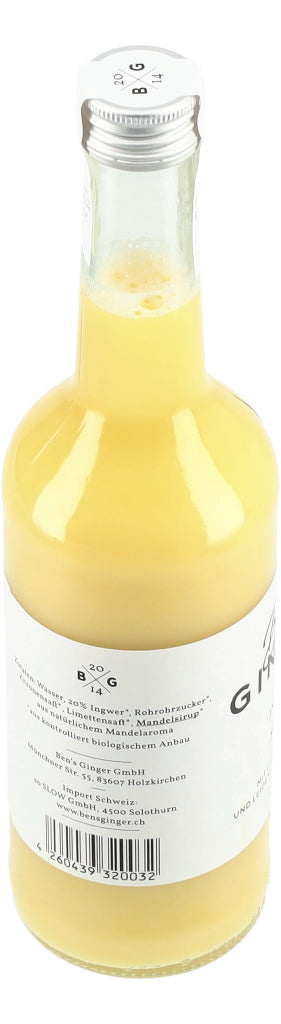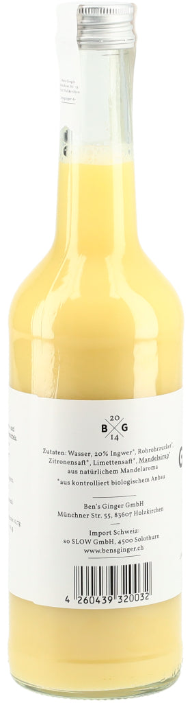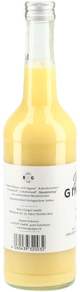 Wasser, 20% Ingwer*, brauner Rohrzucker*, Zitronensaft*, Limettensaft*, Mandelsirup* aus natürlichem Mandelaroma, gewonnen aus dem Extrakt der Bittermandel. *aus kontrolliert biologischem Anbau..