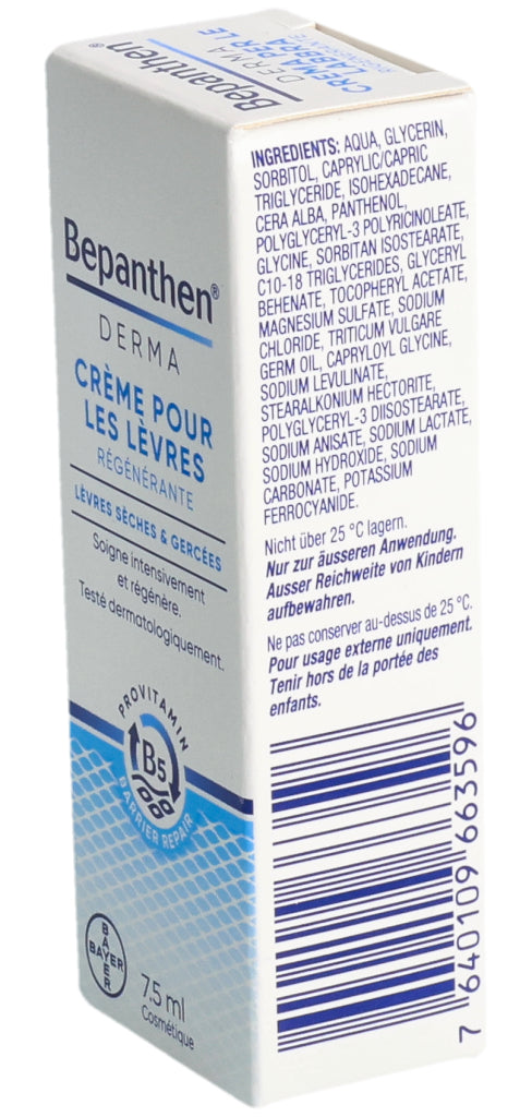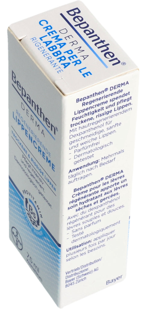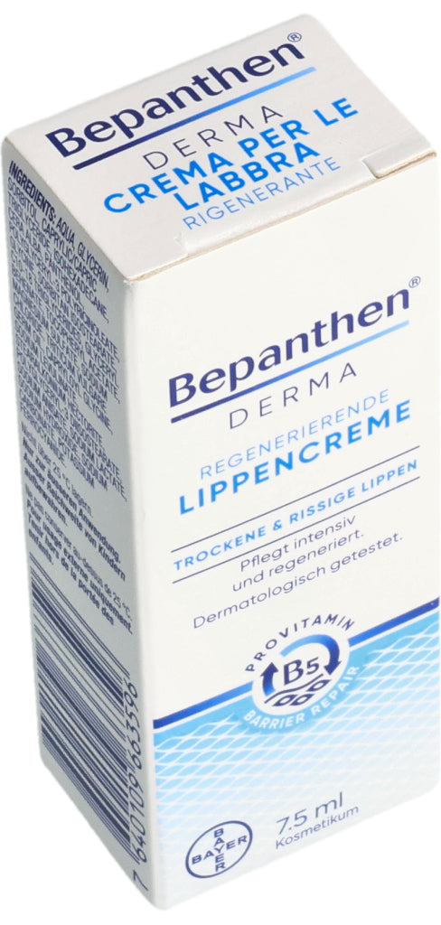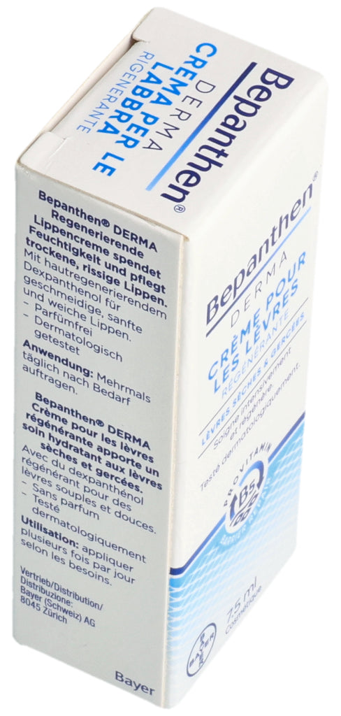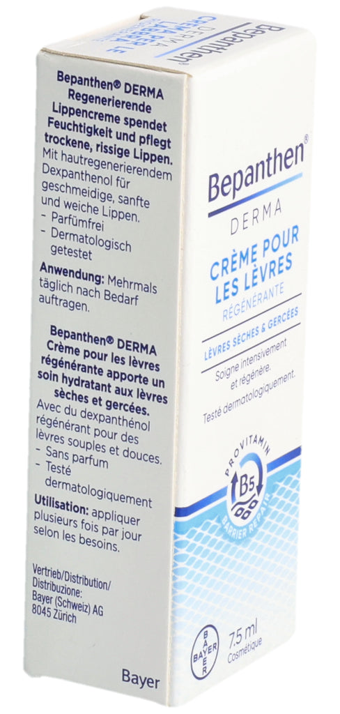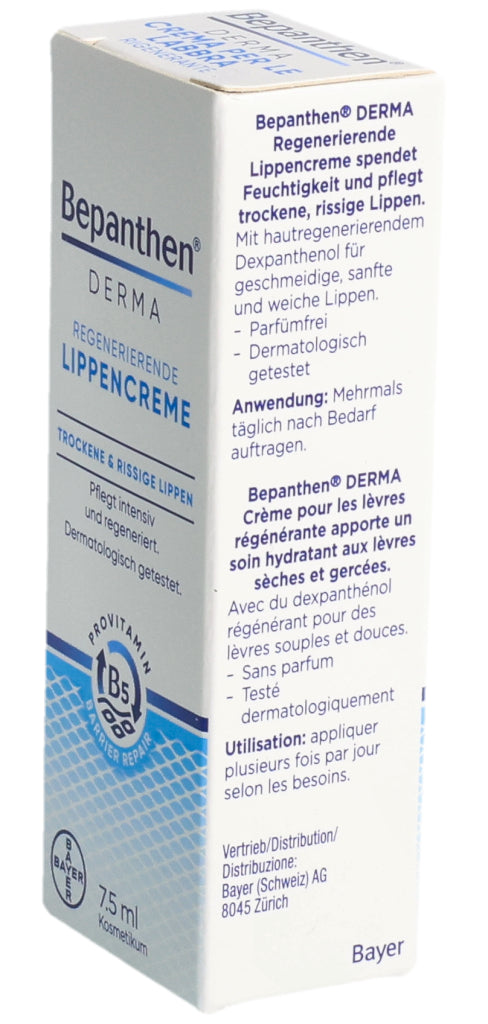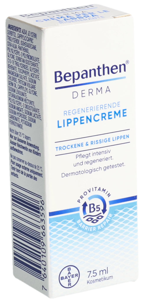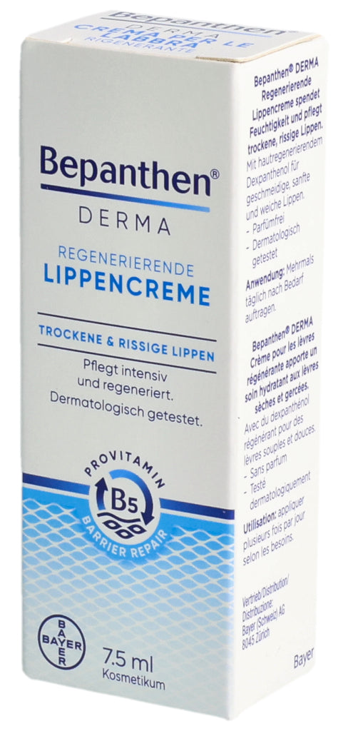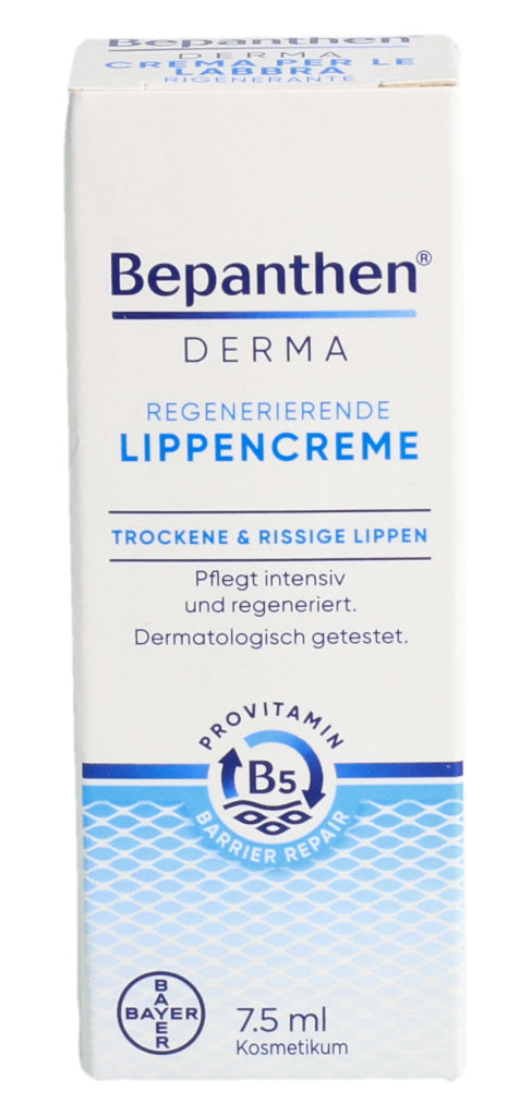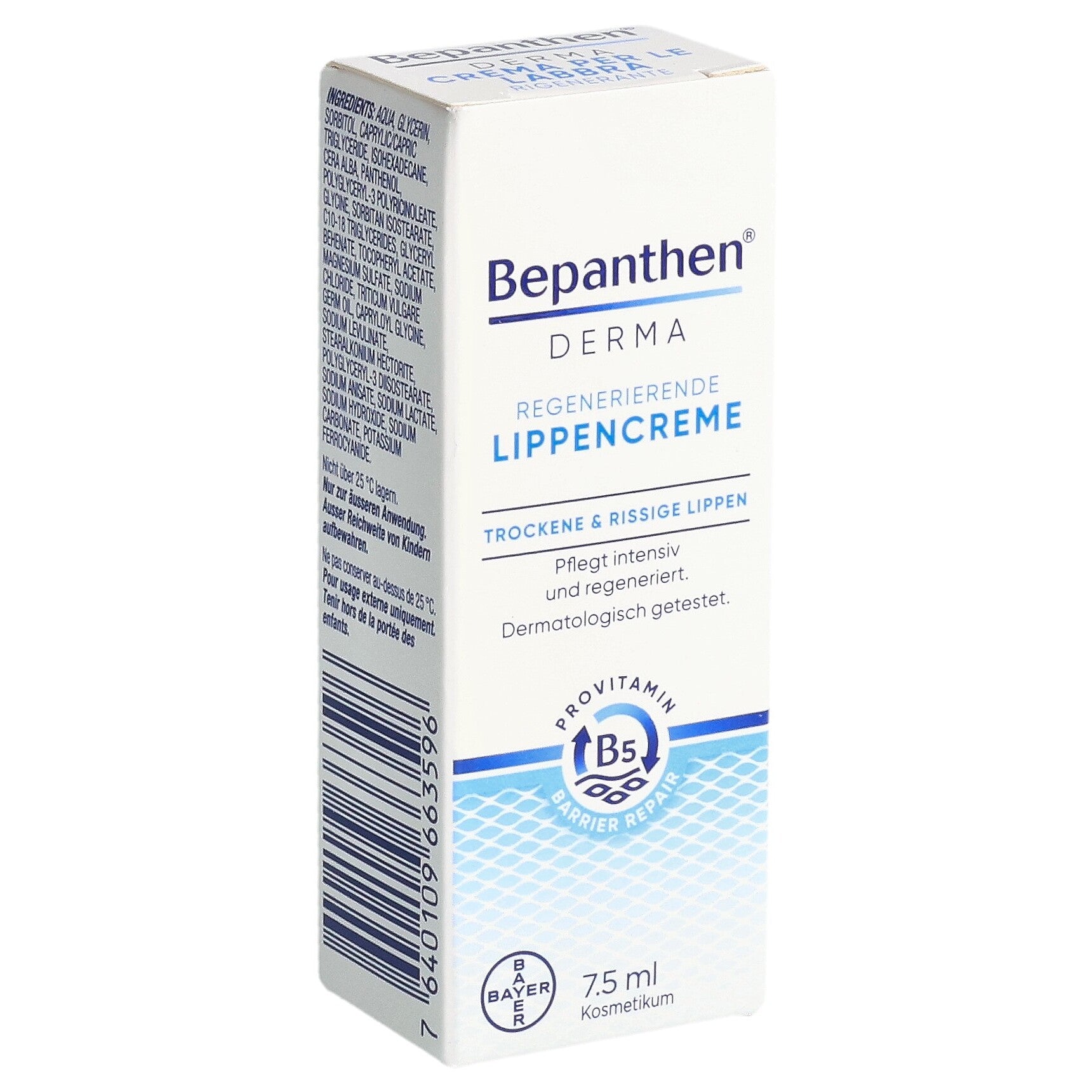 Bepanthen® DERMA Regenerierende Lippencreme spendet Feuchtigkeit und pflegt trockene, rissige Lippen. Mit hautregenerierendem Dexpanthenol für geschmeidige, sanfte und weiche Lippen.