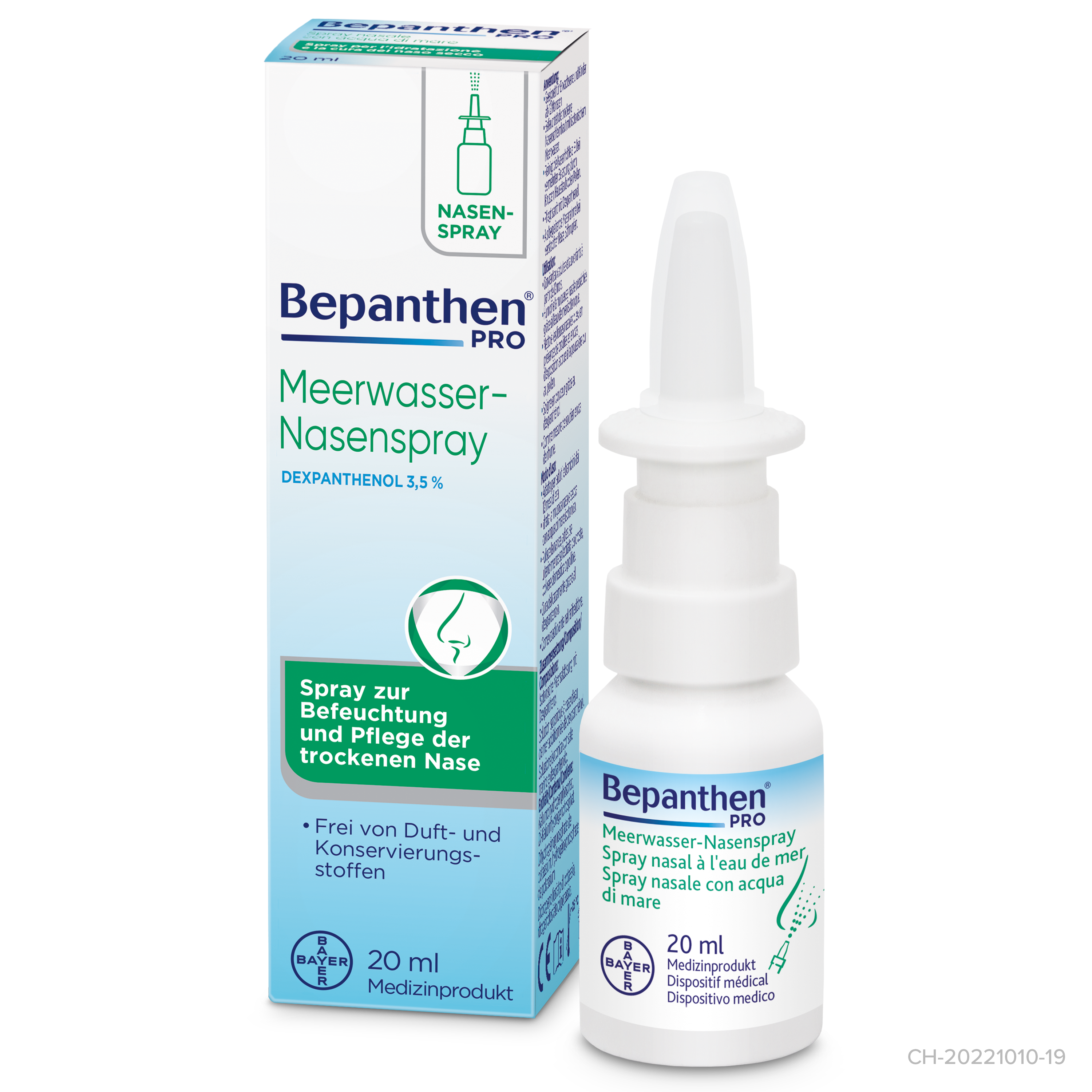 Nur eine intakte, nämlich permanent feuchte, Nasenschleimhaut bietet einen wirkungsvollen Schutz vor Atemwegsinfektionen. Bepanthen PRO Meerwasser-Nasenspray befeuchtet die trockene Nasenschleimhaut, reinigt die Nasenhöhle (z. B. bei Belastung durch Hausstaub, Pollen oder bei Schnupfen) und pflegt sanft. Es bewahrt auch vor einer trockenen Nase, hervorgerufen