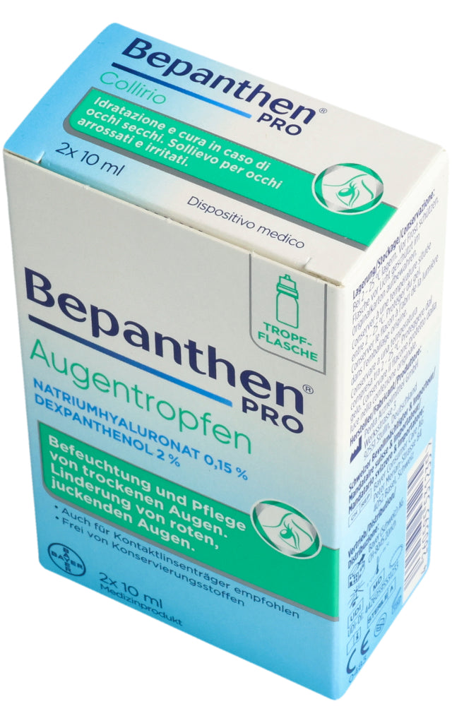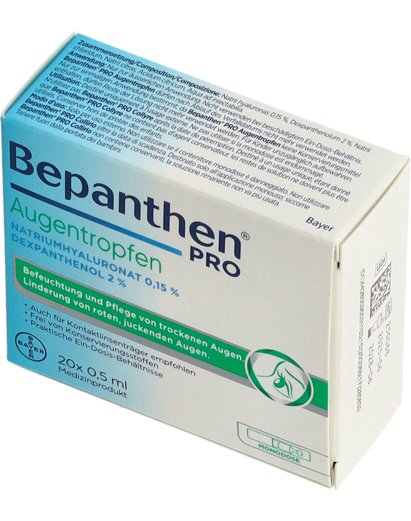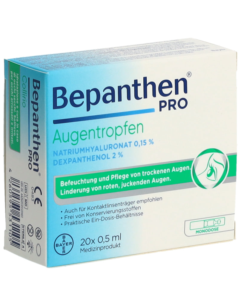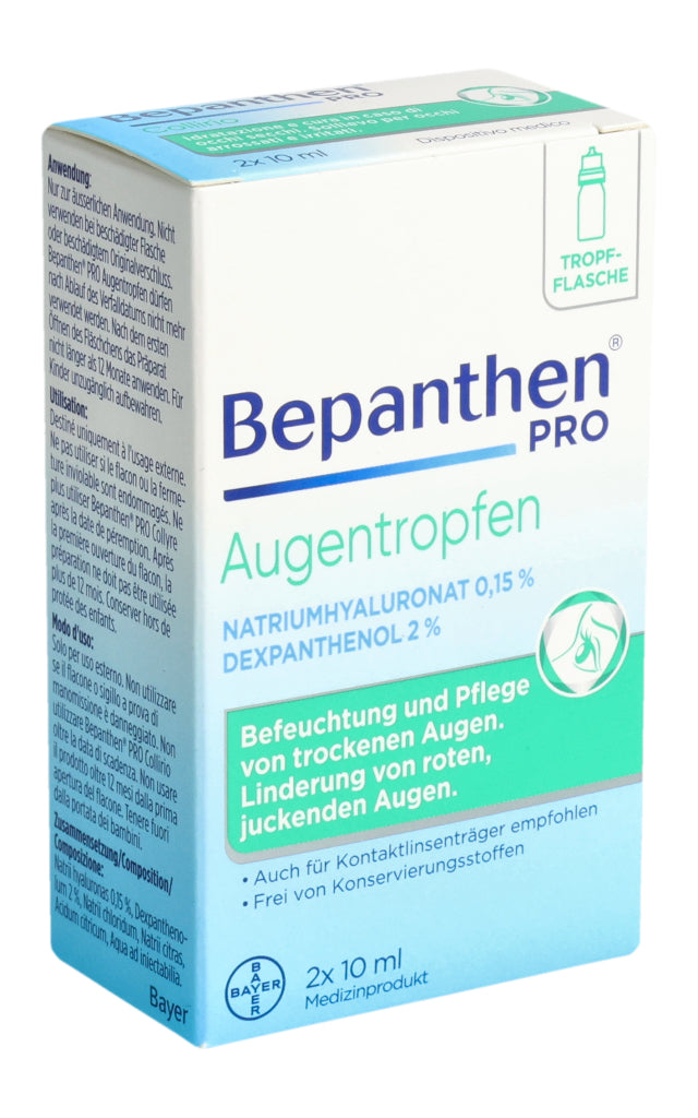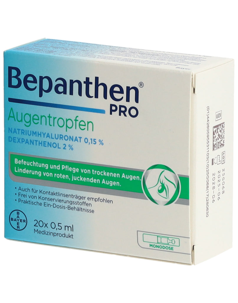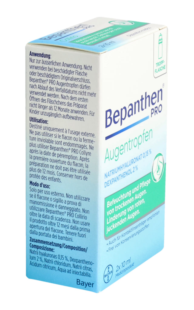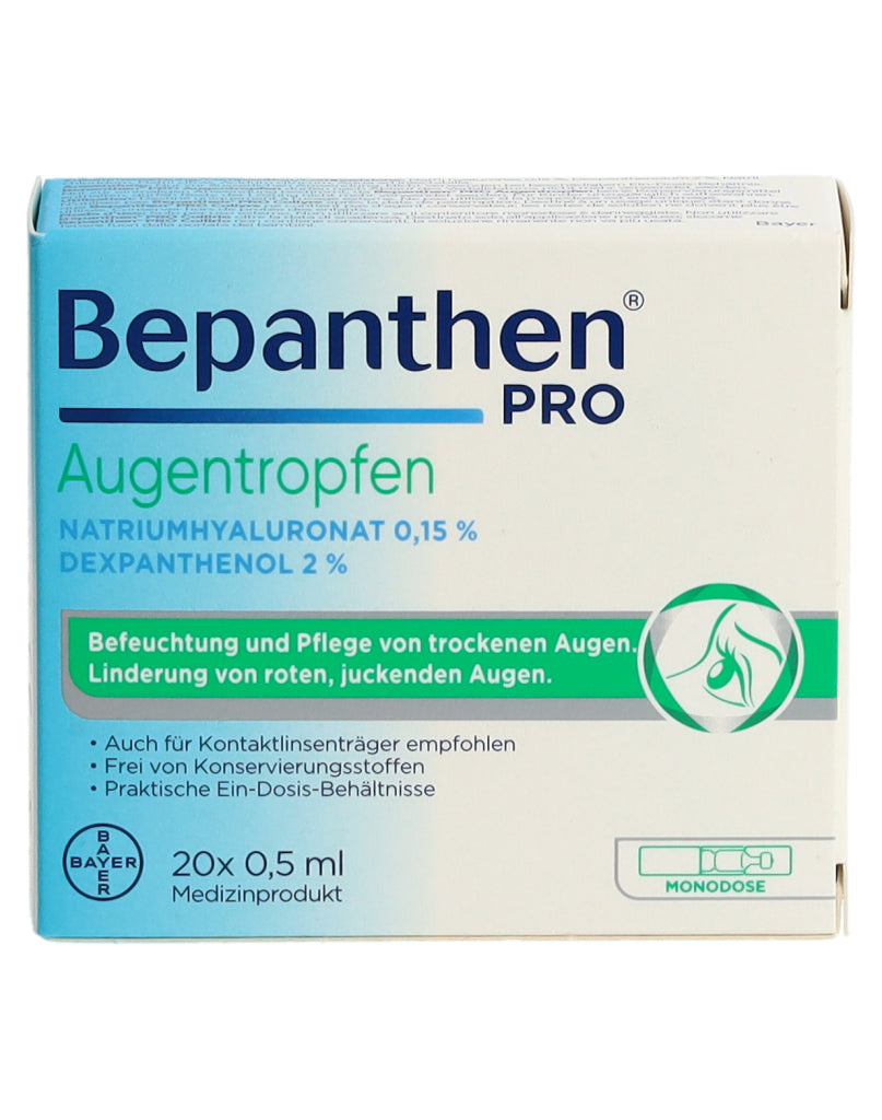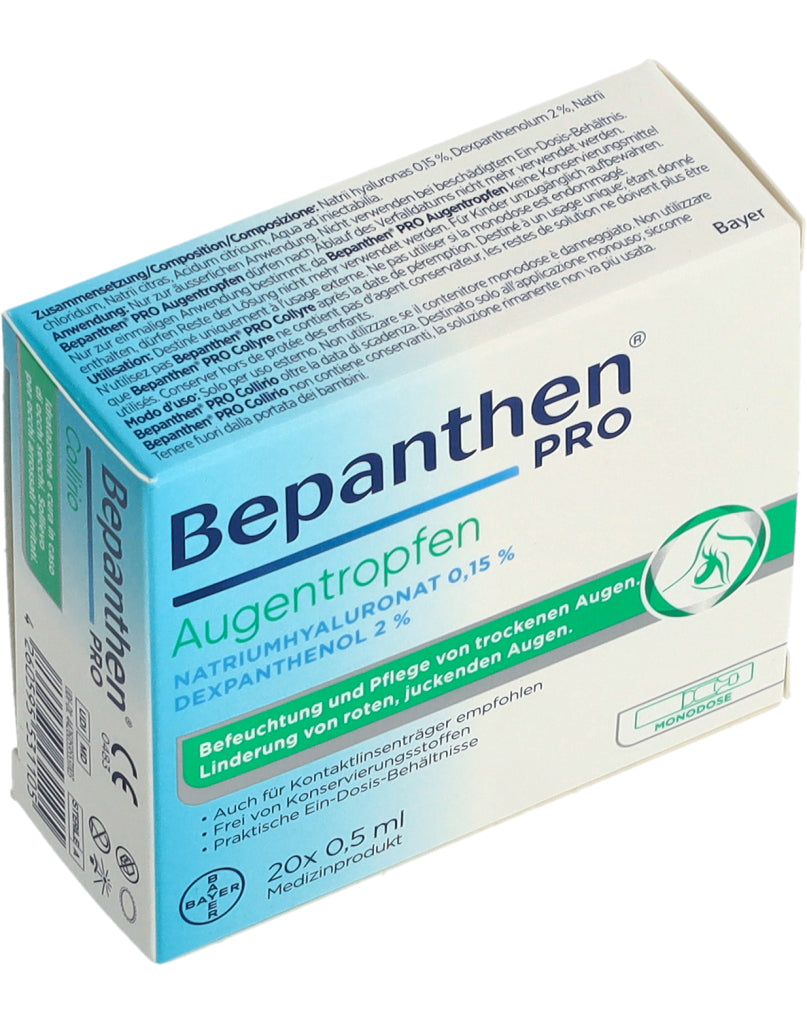 Bepanthen Augentropfen bilden einen sterilen, konservierungsmittelfreien, viskoelastischen, klaren Schutzfilm für die Hornhaut. Sie bestehen aus natürlichen, biologischen Substanzen. Dazu zählt das Natriumsalz der Hyaluronsäure, das aufgrund seiner besonderen physikalischen Eigenschaft einen gleichmässigen, stabilen und besonders lang haftenden Schutzfilm auf der Hornhaut bildet, ohne die Sehleistung zu beeinträchtigen. Darüber hinaus enthalten Bepanthen Augentropfen das Provitamin B5 (Dexpanthenol), das aufgrund der hohen Wasserbindungskapazität die Fähigkeit hat, das Auge zu erfrischen und zusätzlich zu pflegen. Dadurch werden die feuchthaltenden Eigenschaften des Natriumhyaluronats sinnvoll unterstützt.