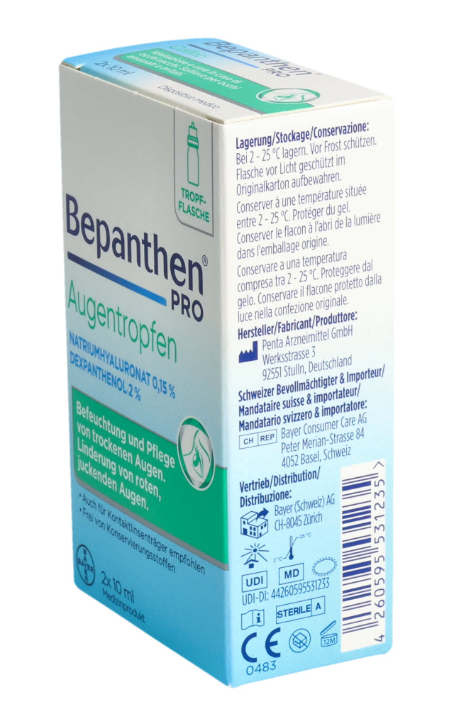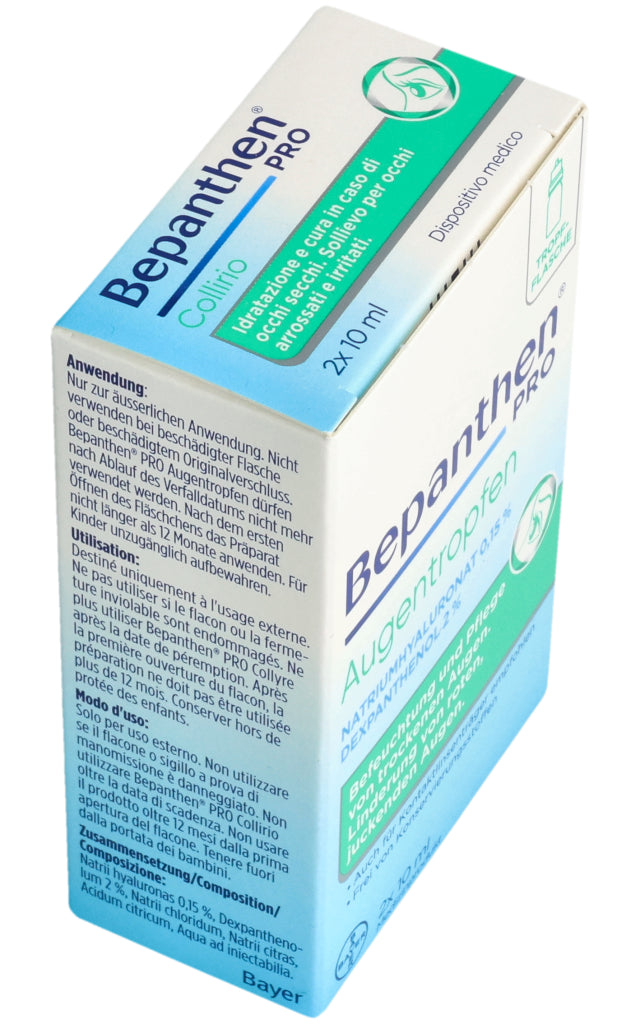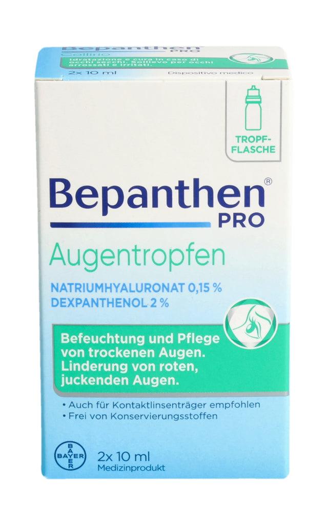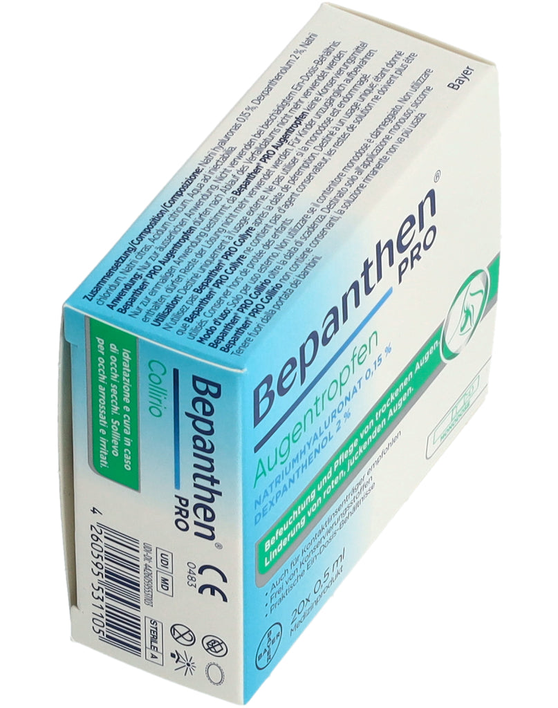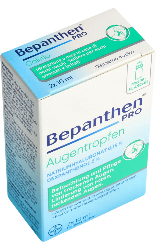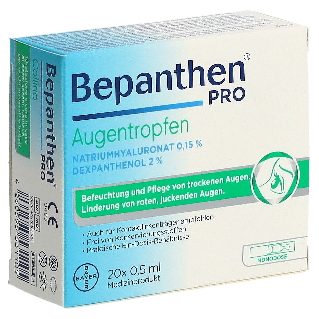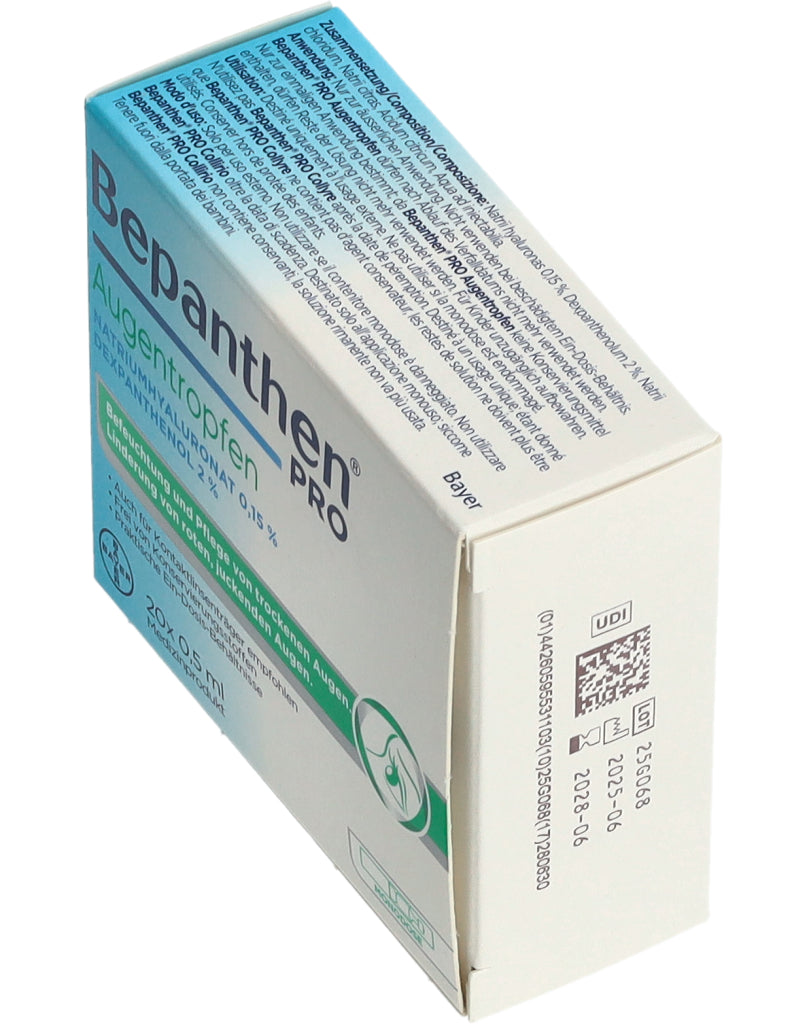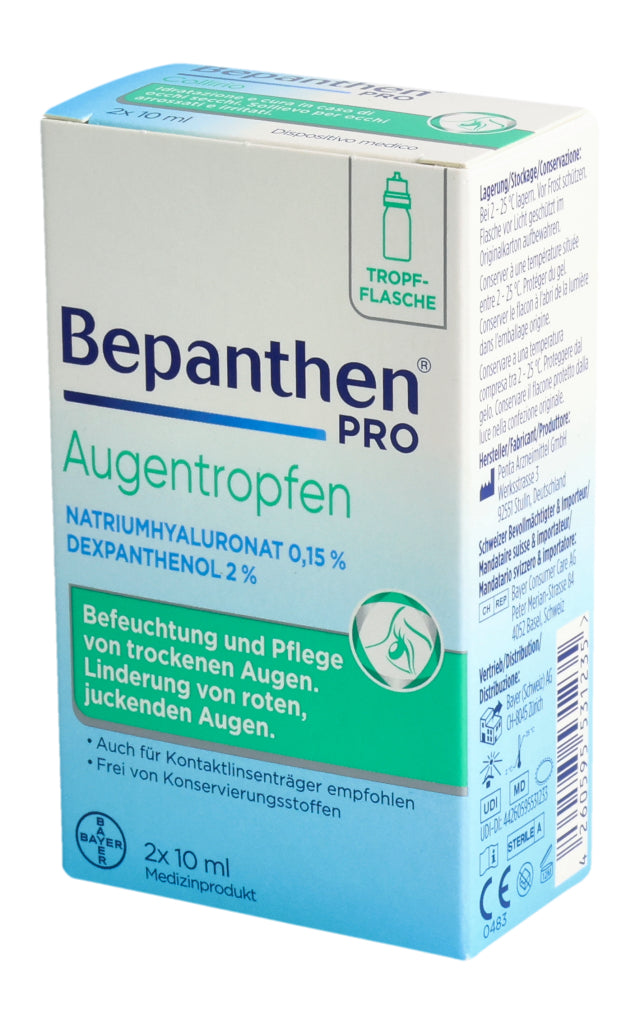 Bepanthen Augentropfen bilden einen sterilen, konservierungsmittelfreien, viskoelastischen, klaren Schutzfilm für die Hornhaut. Sie bestehen aus natürlichen, biologischen Substanzen. Dazu zählt das Natriumsalz der Hyaluronsäure, das aufgrund seiner besonderen physikalischen Eigenschaft einen gleichmässigen, stabilen und besonders lang haftenden Schutzfilm auf der Hornhaut bildet, ohne die Sehleistung zu beeinträchtigen. Darüber hinaus enthalten Bepanthen Augentropfen das Provitamin B5 (Dexpanthenol), das aufgrund der hohen Wasserbindungskapazität die Fähigkeit hat, das Auge zu erfrischen und zusätzlich zu pflegen. Dadurch werden die feuchthaltenden Eigenschaften des Natriumhyaluronats sinnvoll unterstützt.