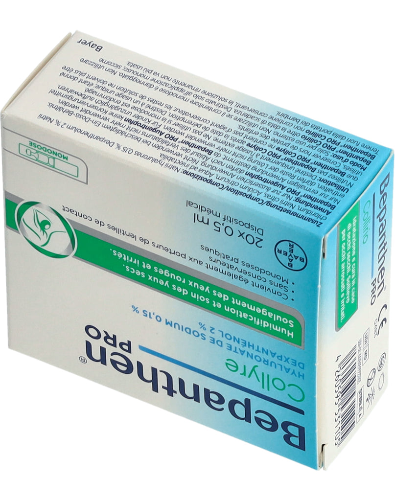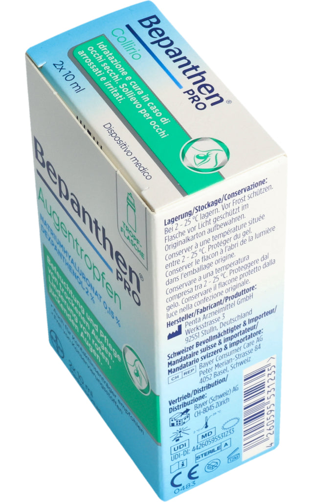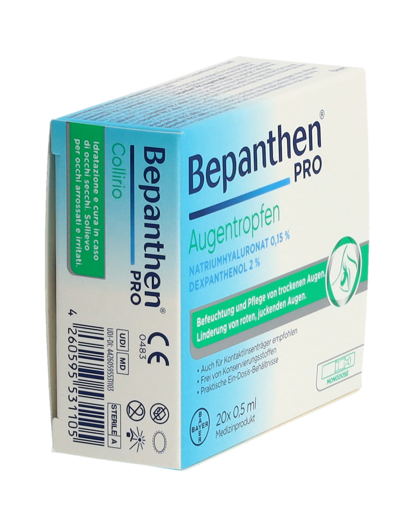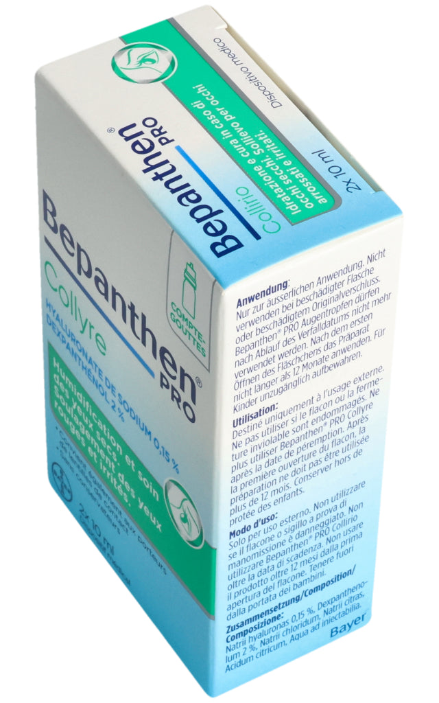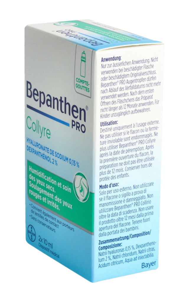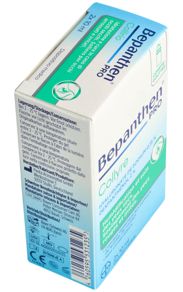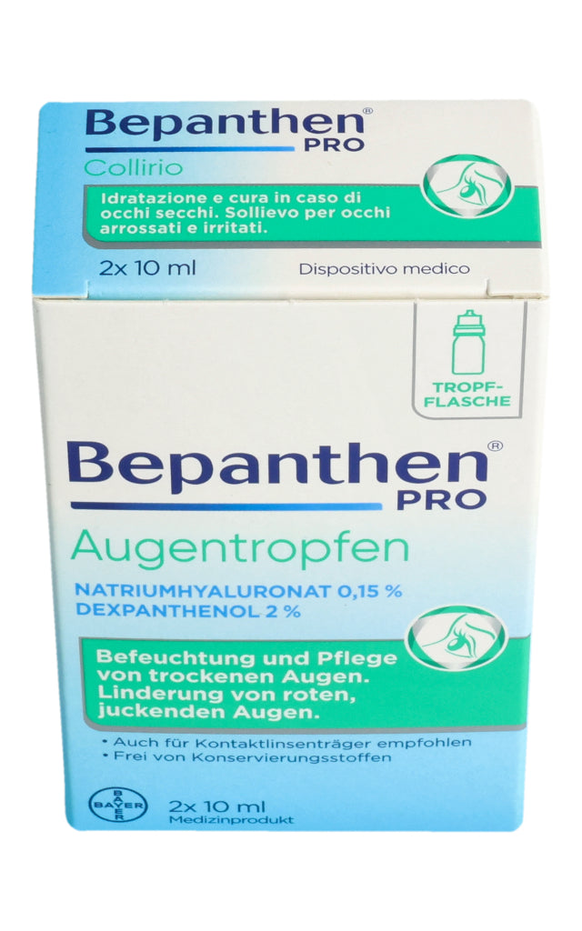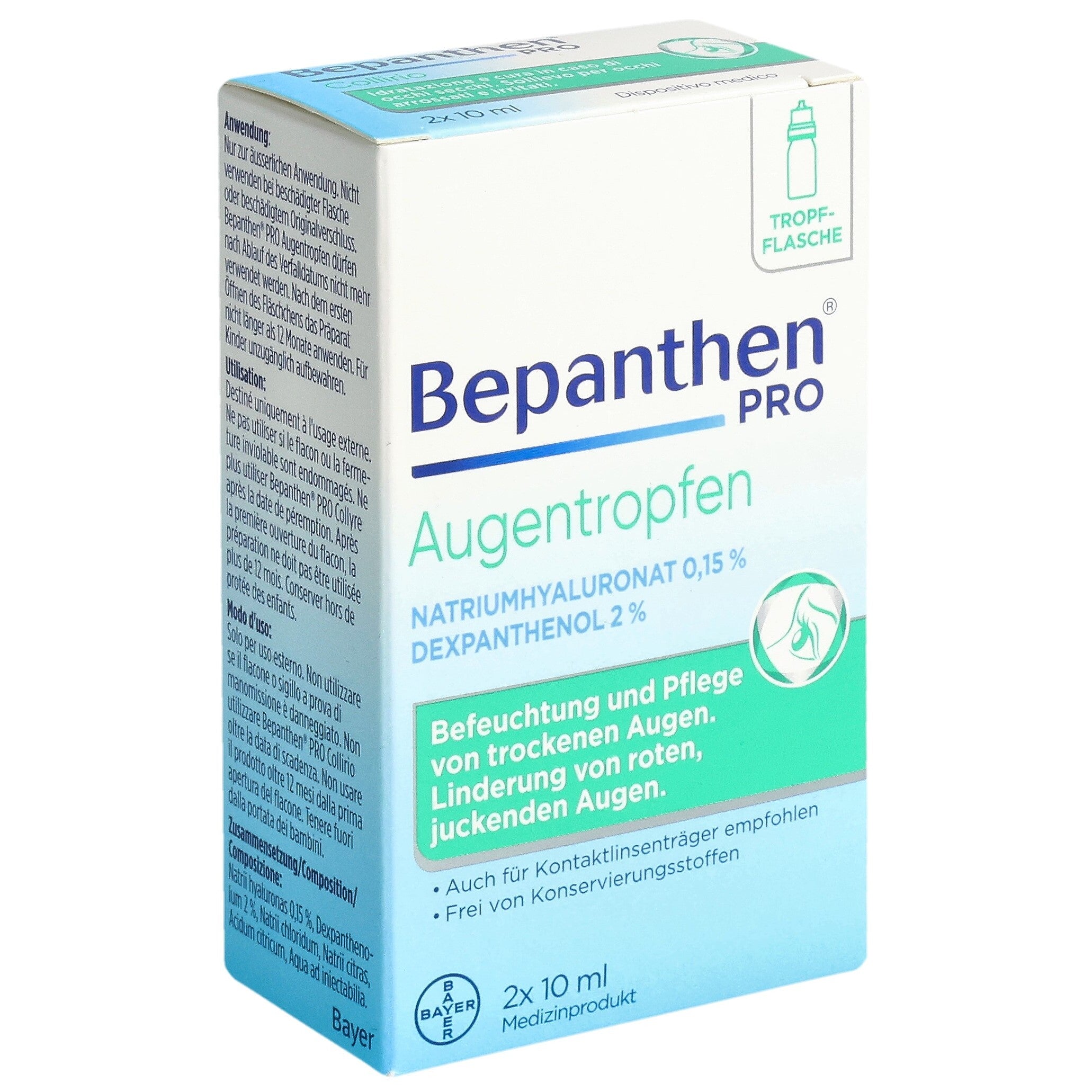 Bepanthen Augentropfen bilden einen sterilen, konservierungsmittelfreien, viskoelastischen, klaren Schutzfilm für die Hornhaut. Sie bestehen aus natürlichen, biologischen Substanzen. Dazu zählt das Natriumsalz der Hyaluronsäure, das aufgrund seiner besonderen physikalischen Eigenschaft einen gleichmässigen, stabilen und besonders lang haftenden Schutzfilm auf der Hornhaut bildet, ohne die Sehleistung zu beeinträchtigen. Darüber hinaus enthalten Bepanthen Augentropfen das Provitamin B5 (Dexpanthenol), das aufgrund der hohen Wasserbindungskapazität die Fähigkeit hat, das Auge zu erfrischen und zusätzlich zu pflegen. Dadurch werden die feuchthaltenden Eigenschaften des Natriumhyaluronats sinnvoll unterstützt.