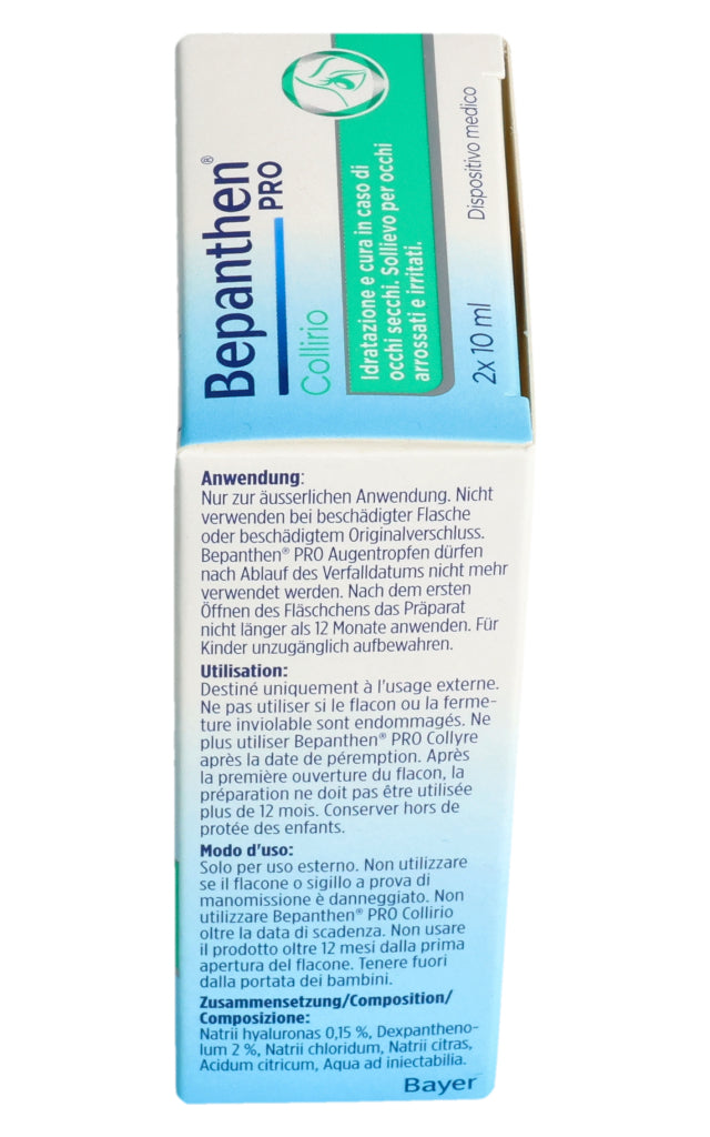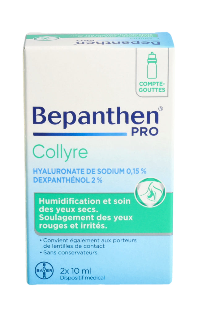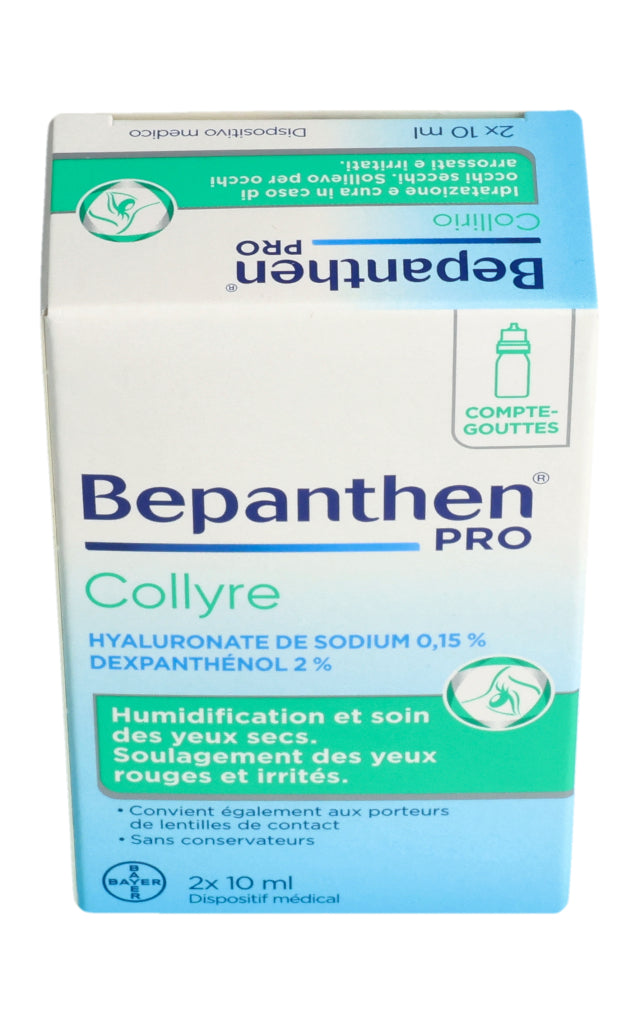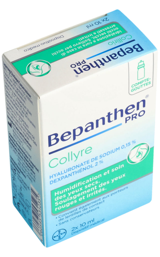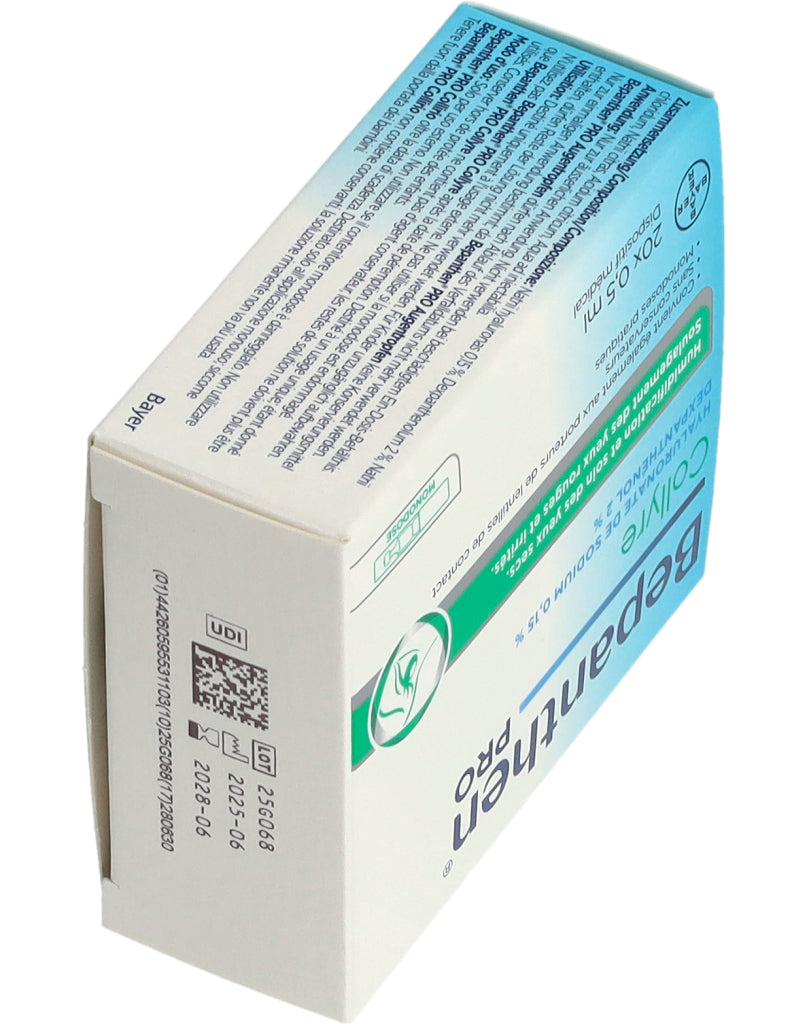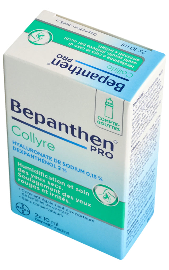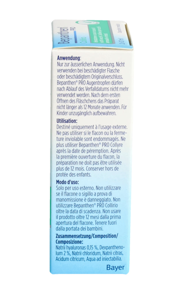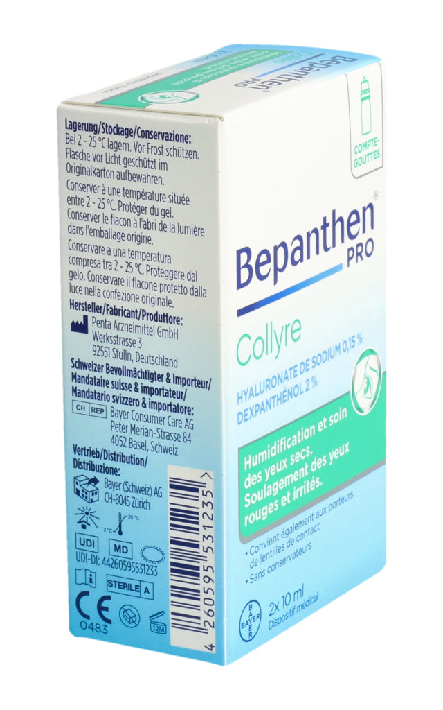 Bepanthen Augentropfen bilden einen sterilen, konservierungsmittelfreien, viskoelastischen, klaren Schutzfilm für die Hornhaut. Sie bestehen aus natürlichen, biologischen Substanzen. Dazu zählt das Natriumsalz der Hyaluronsäure, das aufgrund seiner besonderen physikalischen Eigenschaft einen gleichmässigen, stabilen und besonders lang haftenden Schutzfilm auf der Hornhaut bildet, ohne die Sehleistung zu beeinträchtigen. Darüber hinaus enthalten Bepanthen Augentropfen das Provitamin B5 (Dexpanthenol), das aufgrund der hohen Wasserbindungskapazität die Fähigkeit hat, das Auge zu erfrischen und zusätzlich zu pflegen. Dadurch werden die feuchthaltenden Eigenschaften des Natriumhyaluronats sinnvoll unterstützt.