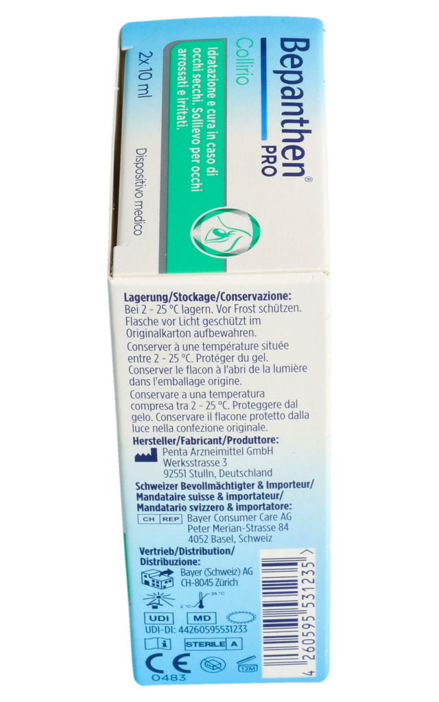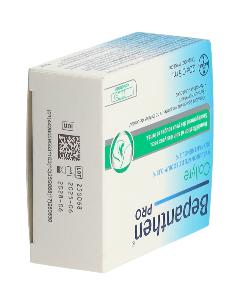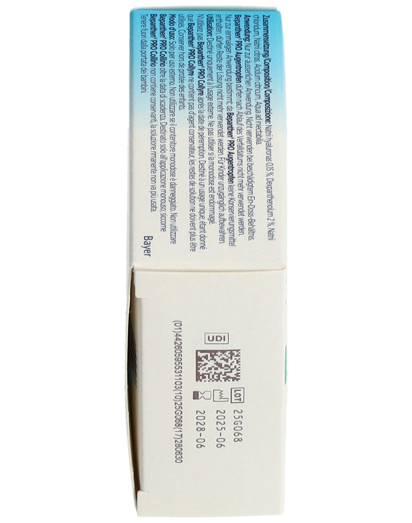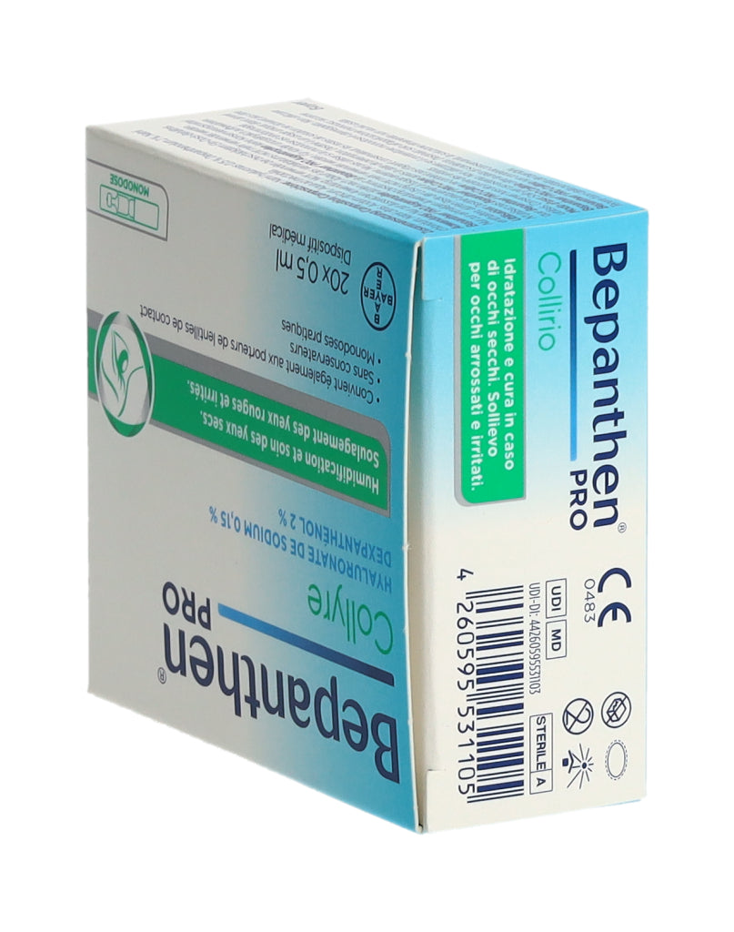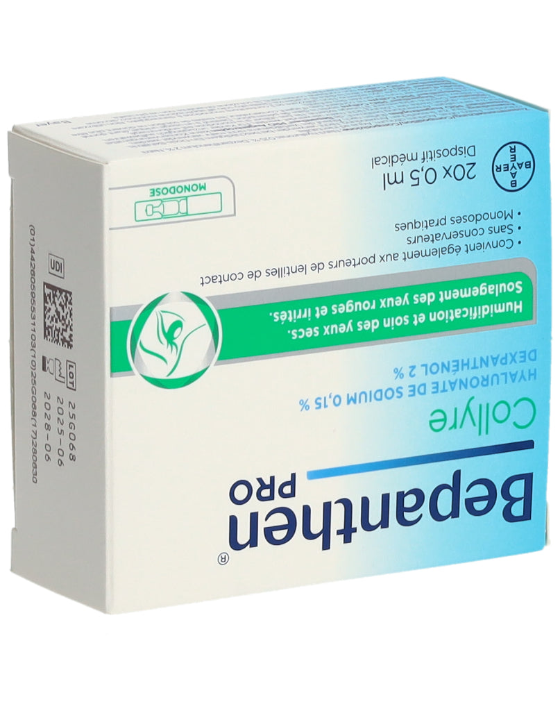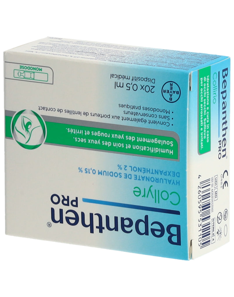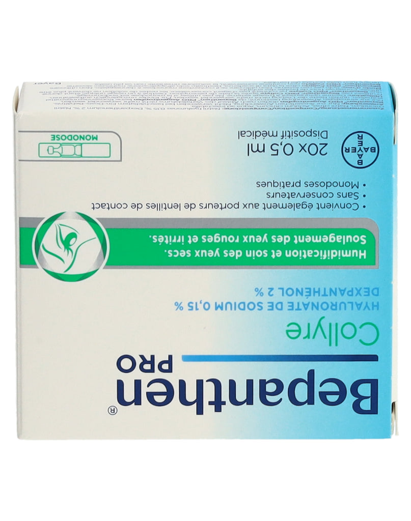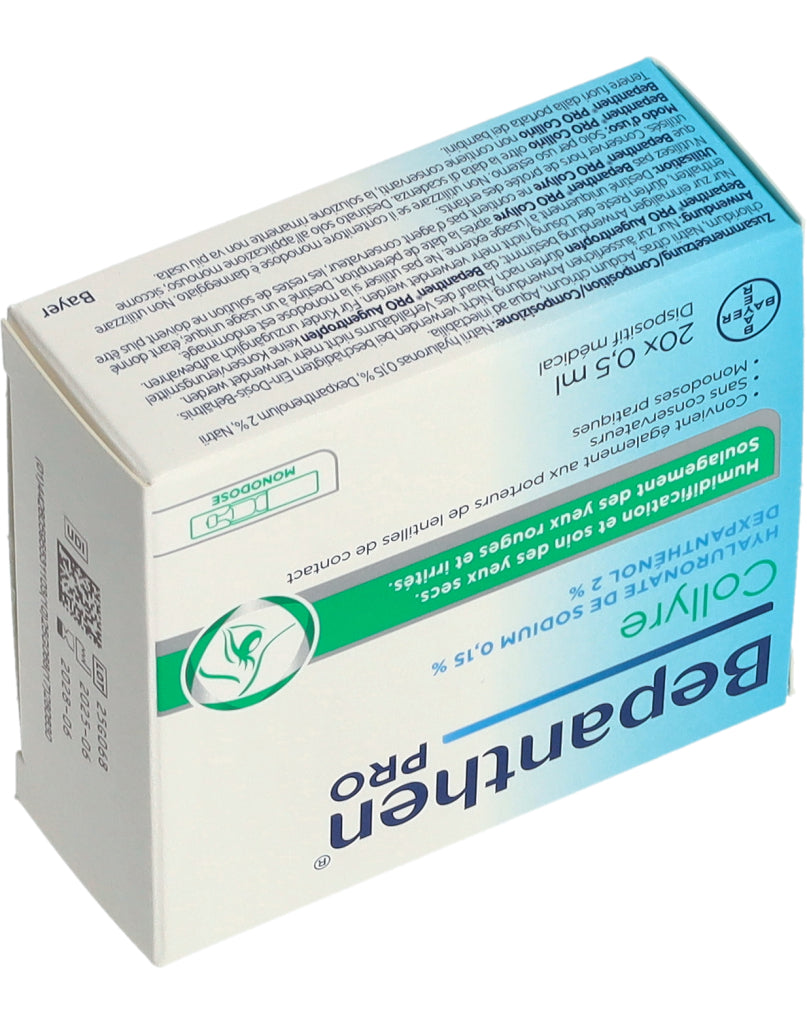 Bepanthen Augentropfen bilden einen sterilen, konservierungsmittelfreien, viskoelastischen, klaren Schutzfilm für die Hornhaut. Sie bestehen aus natürlichen, biologischen Substanzen. Dazu zählt das Natriumsalz der Hyaluronsäure, das aufgrund seiner besonderen physikalischen Eigenschaft einen gleichmässigen, stabilen und besonders lang haftenden Schutzfilm auf der Hornhaut bildet, ohne die Sehleistung zu beeinträchtigen. Darüber hinaus enthalten Bepanthen Augentropfen das Provitamin B5 (Dexpanthenol), das aufgrund der hohen Wasserbindungskapazität die Fähigkeit hat, das Auge zu erfrischen und zusätzlich zu pflegen. Dadurch werden die feuchthaltenden Eigenschaften des Natriumhyaluronats sinnvoll unterstützt.