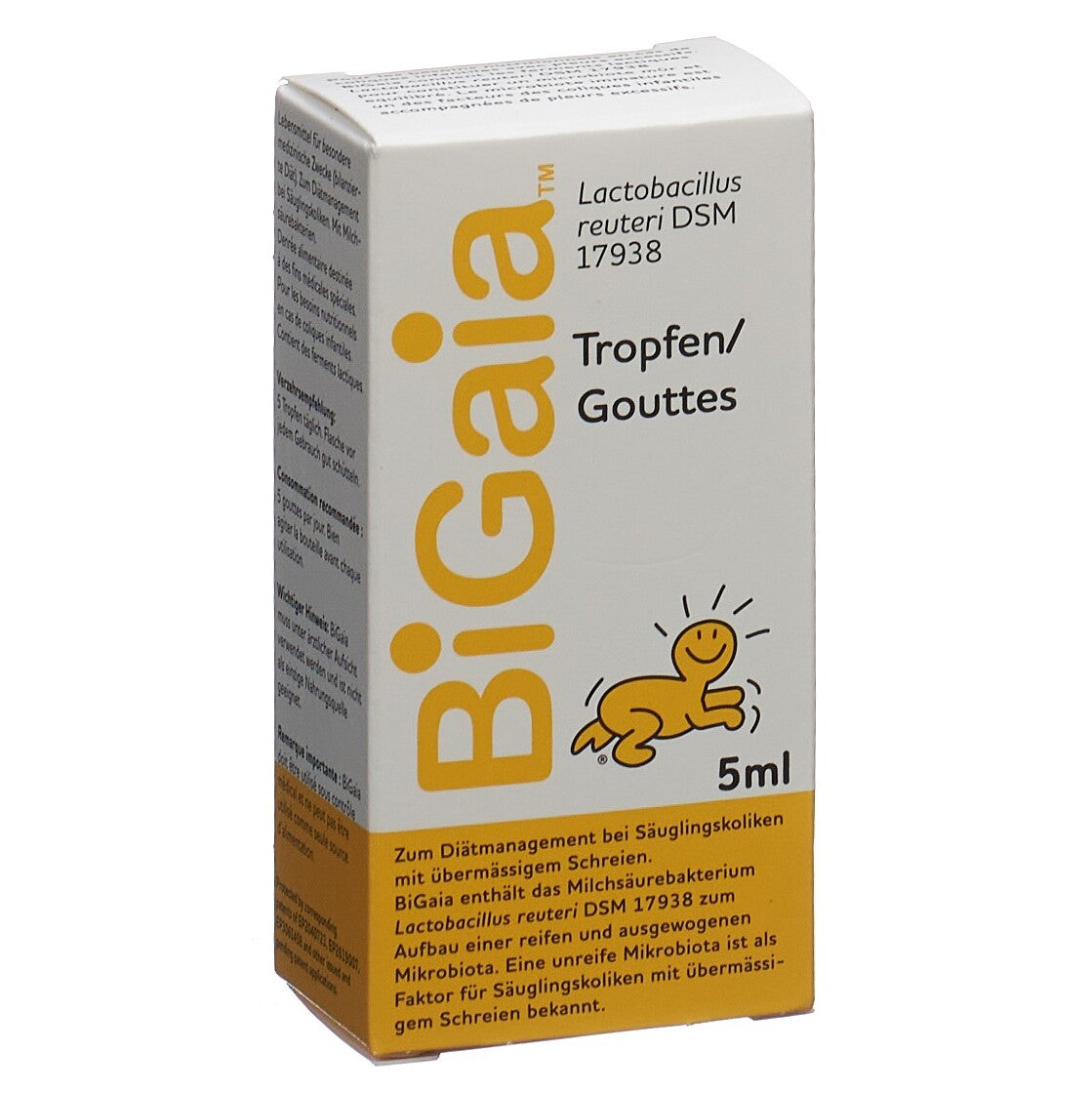 Zum Diätmanagement bei Säuglingskoliken mit übermässigem Schreien. BiGaia enthält das Milchsäurebakterium Lactobacillus reuteri DSM 17938 zum Aufbau einer reifen und ausgewogenen Mikrobiota. Eine unreife Mikrobiota ist als Faktor für Säuglingskoliken mit übermässigem Schreien bekannt.