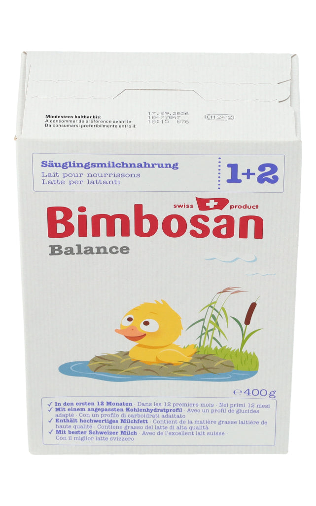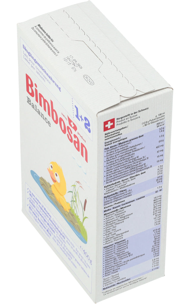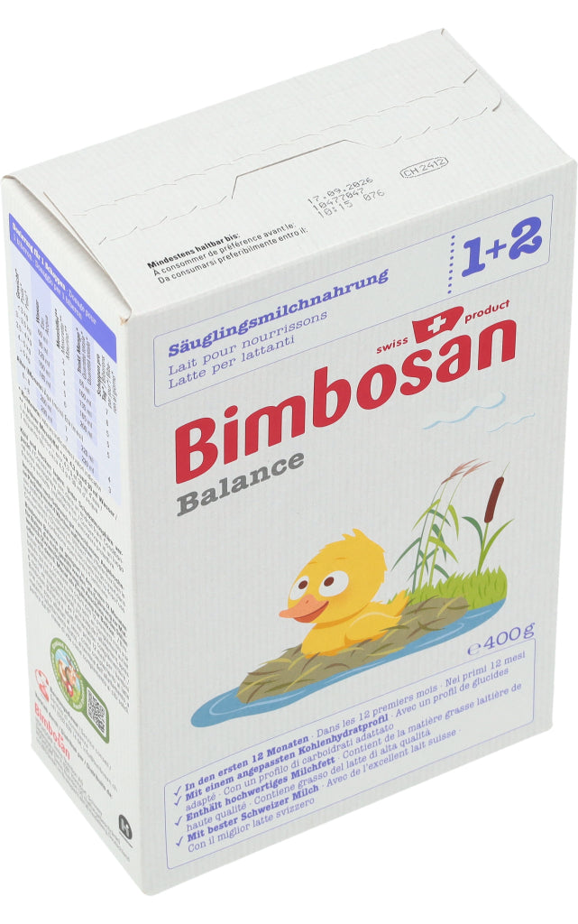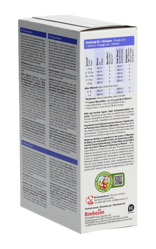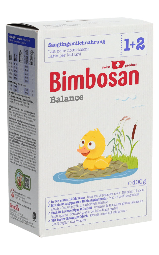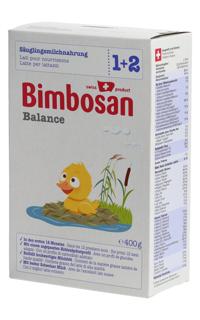 Bimbosan Balance hat ein angepasstes Kohlenhydratprofil mit einem reduzierten Laktosegehalt. Bimbosan Balance enthält zudem das hochwertige Milchfett, das für einen angenehmen Geschmack sorgt, sowie alles, was Ihr Baby für ein normales Wachstum benötigt. Wir verwenden ausschliesslich hochwertige Schweizer Milch und verzichten bei der Herstellung auf die Verwendung von Palmöl. Bimbosan Balance 1 ist geeignet in den ersten 12 Monaten für Babys, die nicht gestillt werden, als Ergänzung zur Muttermilch (Zwiemilchernährung), im Anschluss an das Stillen oder nach dem 6. Monat als Ergänzung zur Beikost