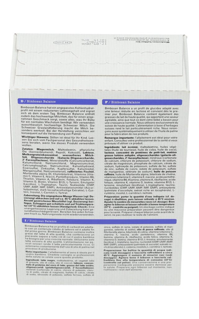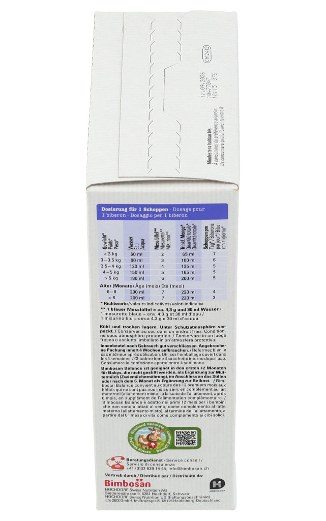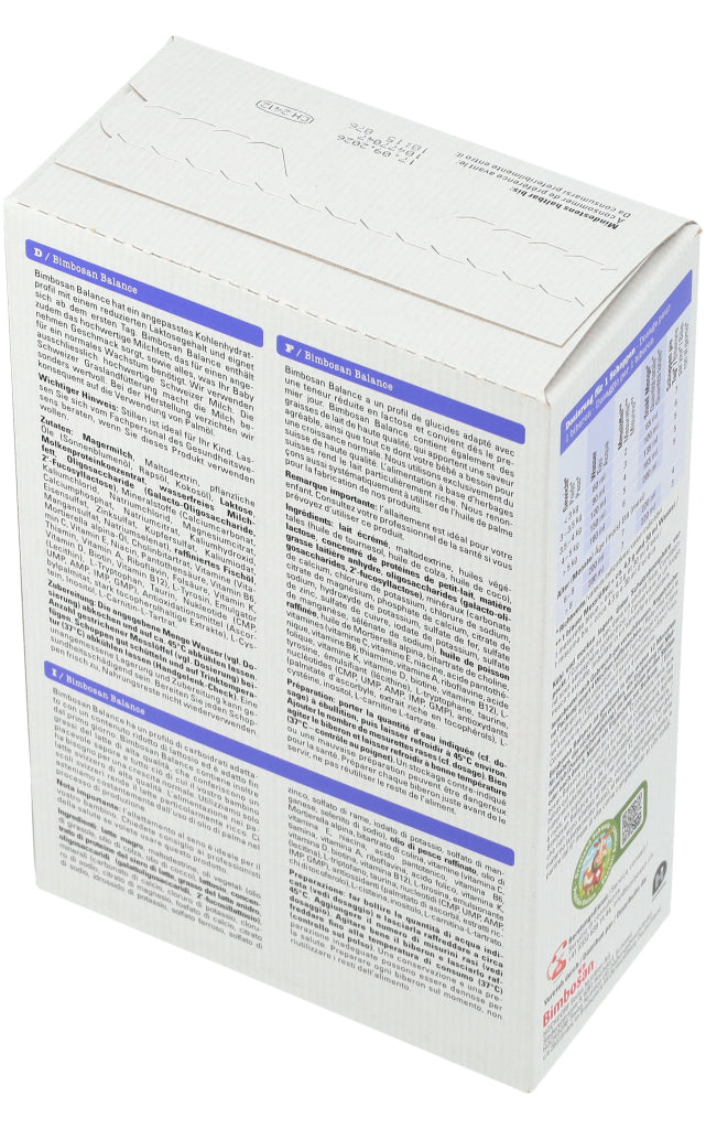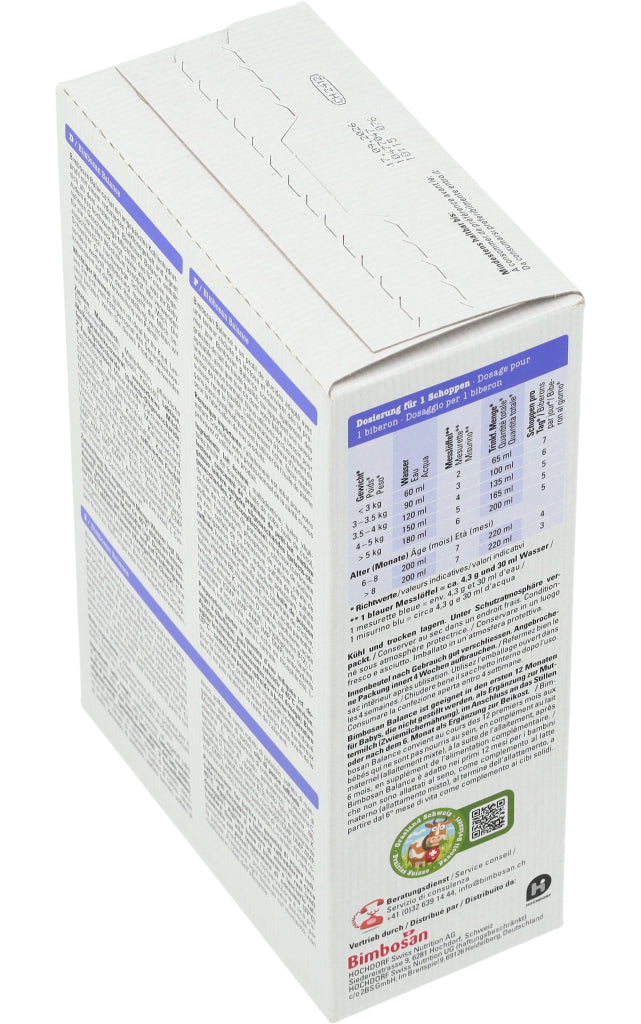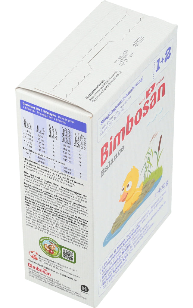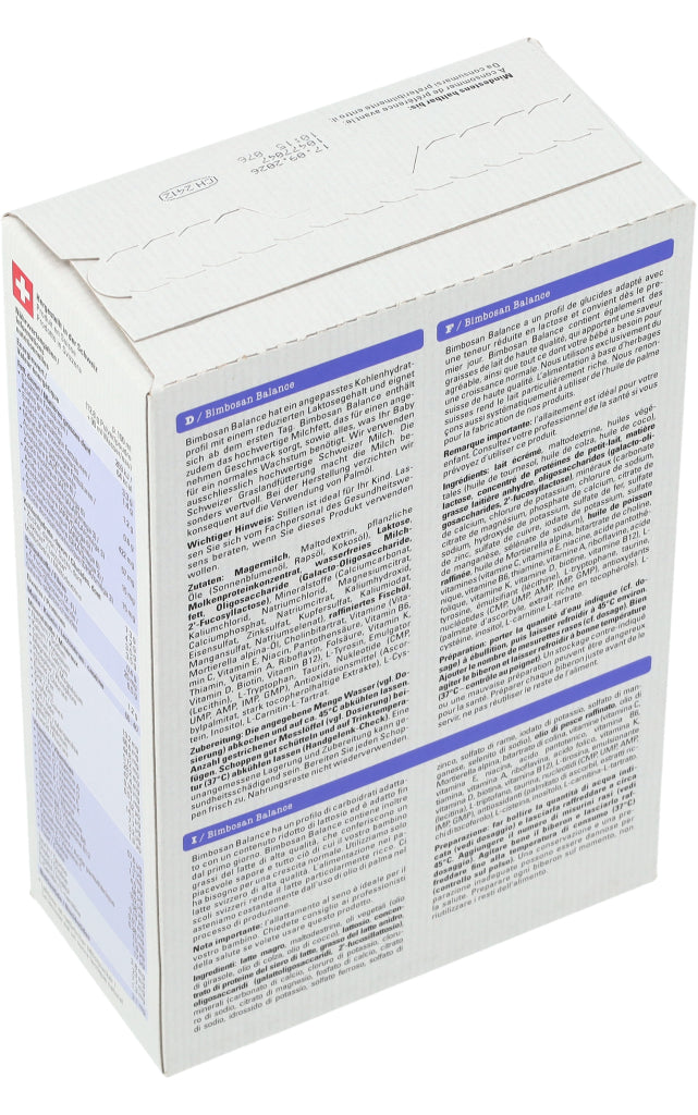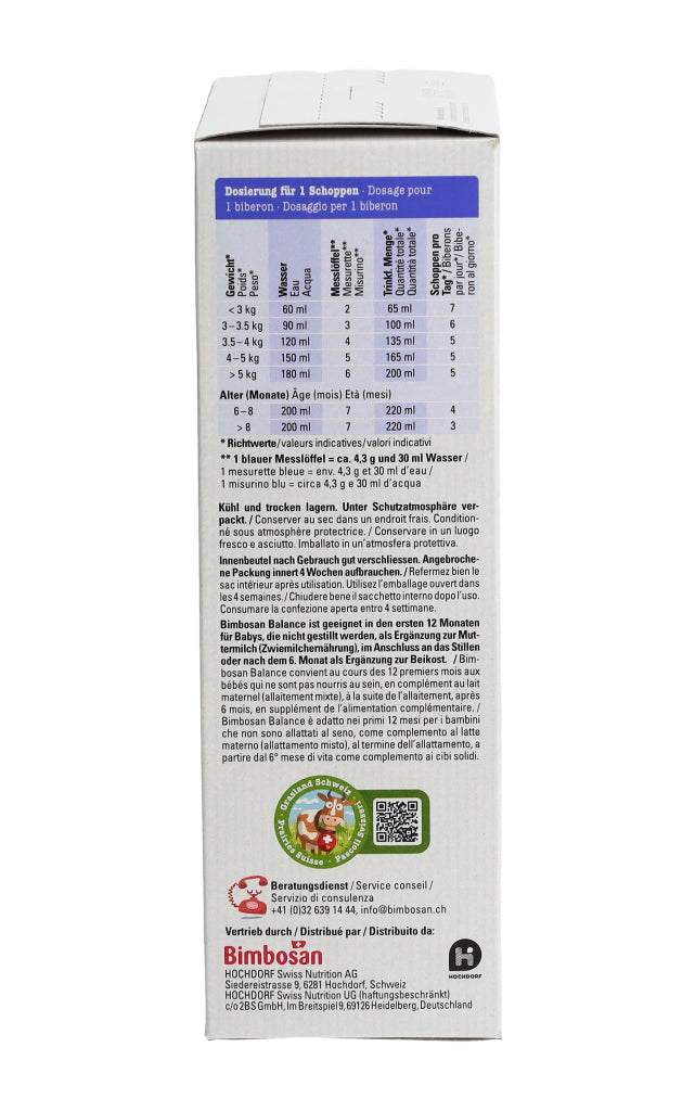 Bimbosan Balance hat ein angepasstes Kohlenhydratprofil mit einem reduzierten Laktosegehalt. Bimbosan Balance enthält zudem das hochwertige Milchfett, das für einen angenehmen Geschmack sorgt, sowie alles, was Ihr Baby für ein normales Wachstum benötigt. Wir verwenden ausschliesslich hochwertige Schweizer Milch und verzichten bei der Herstellung auf die Verwendung von Palmöl. Bimbosan Balance 1 ist geeignet in den ersten 12 Monaten für Babys, die nicht gestillt werden, als Ergänzung zur Muttermilch (Zwiemilchernährung), im Anschluss an das Stillen oder nach dem 6. Monat als Ergänzung zur Beikost