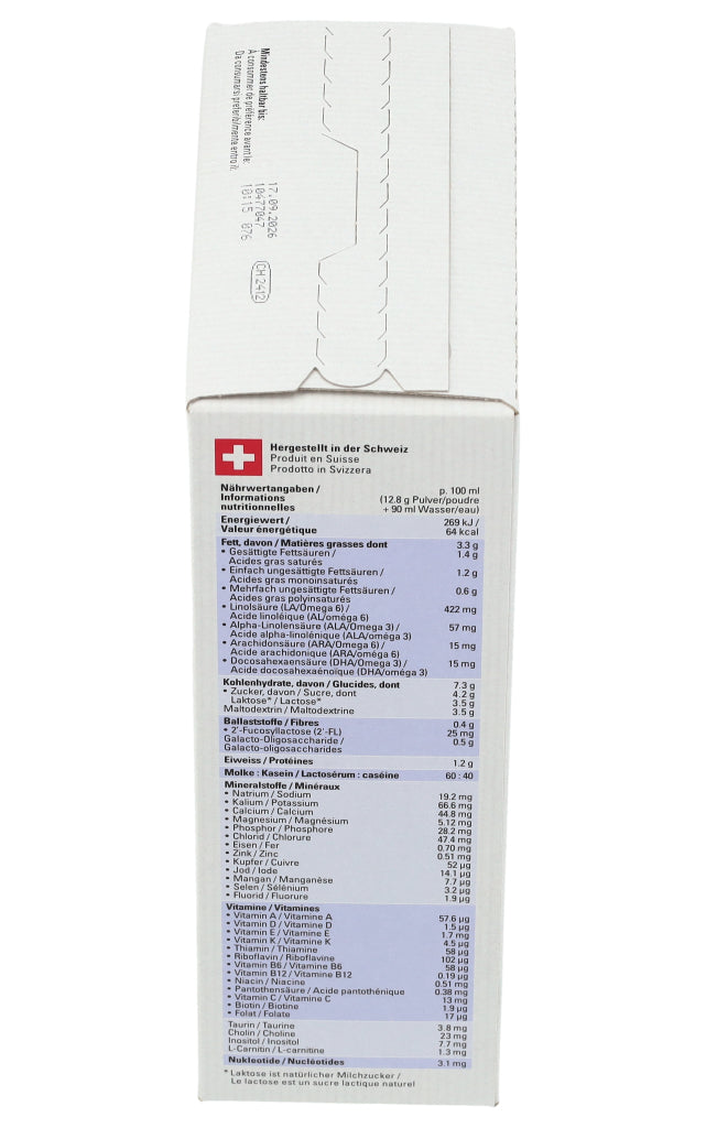 MAGERMILCH, Maltodextrin, pflanzliche Öle (Sonnenblumenöl, Rapsöl, Kokosöl), LAKTOSE, MOLKENPROTEINKONZENTRAT, WASSERFREIES MILCHFETT, GALACTO-OLIGOSACCHARIDE (GOS aus LAKTOSE), Mineralstoffe (Calciumcarbonat, Kaliumchlorid, Natriumchlorid, Magnesiumcitrat, Calciumphosphat, Natriumcitrat, Kaliumhydroxid, Eisensulfat, Zinksulfat, Kupfersulfat, Kaliumiodat, Mangansulfat, Natriumselenat), RAFFINIERTES FISCHÖL, Mortierella alpina-Öl, 2'-FUCOSYLLACTOSE, Cholinbitartrat, Vitamine (Vitamin C, Vitamin E, Niacin, Pantothensäure, Vitamin B6, Thiamin, Vitamin A, Riboflavin, Folsäure, Vitamin K, Vitamin D, Biotin, Vitamin B12), L-Tyrosin, Emulgator (Lecithin), L-Tryptophan, Taurin, Nukleotide (CMP, UMP, AMP, IMP, GMP), Antioxidationsmittel (Ascorbylpalmitat, stark tocopherolhaltige Extrakte), L-Cystein, Inositol, L-Carnitin-L-Tartrat..