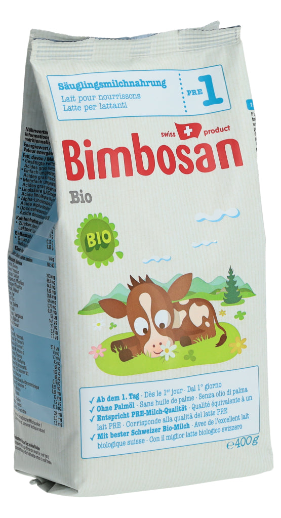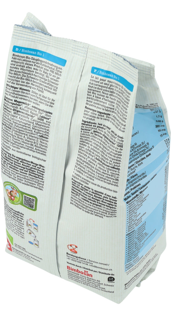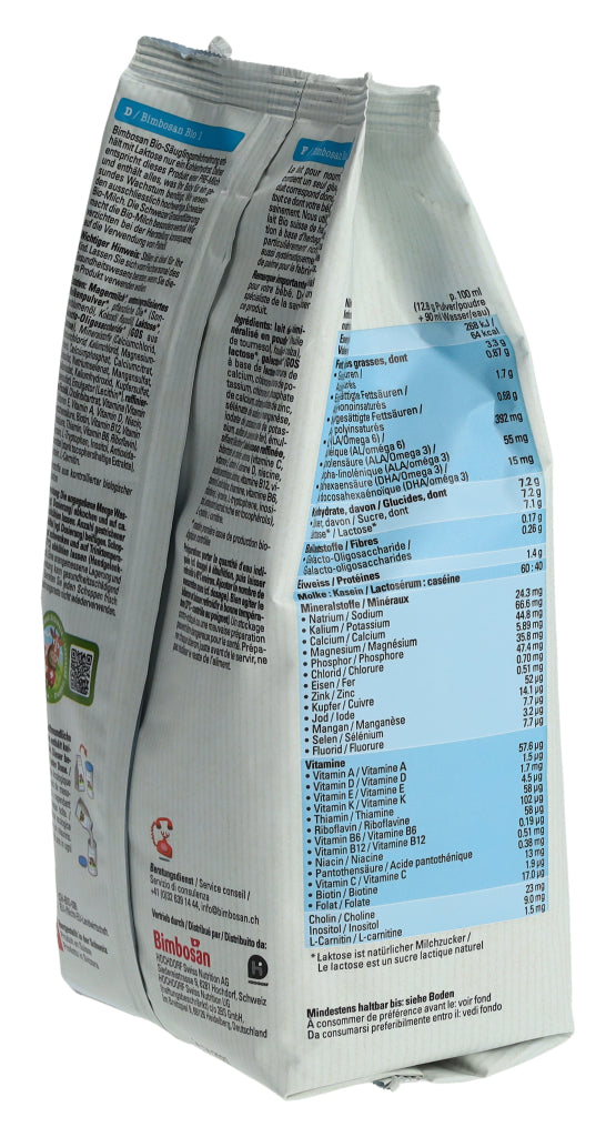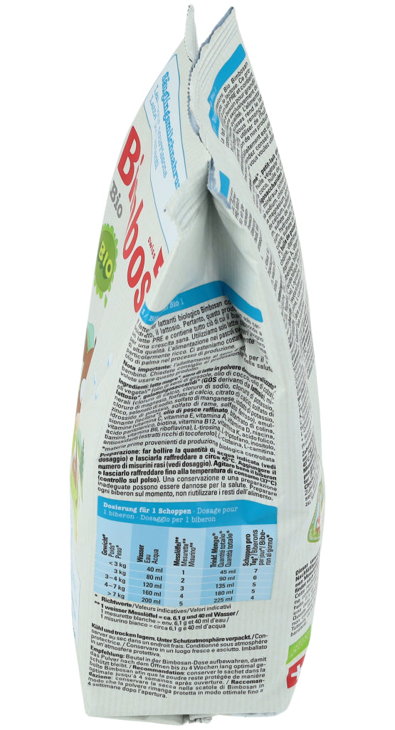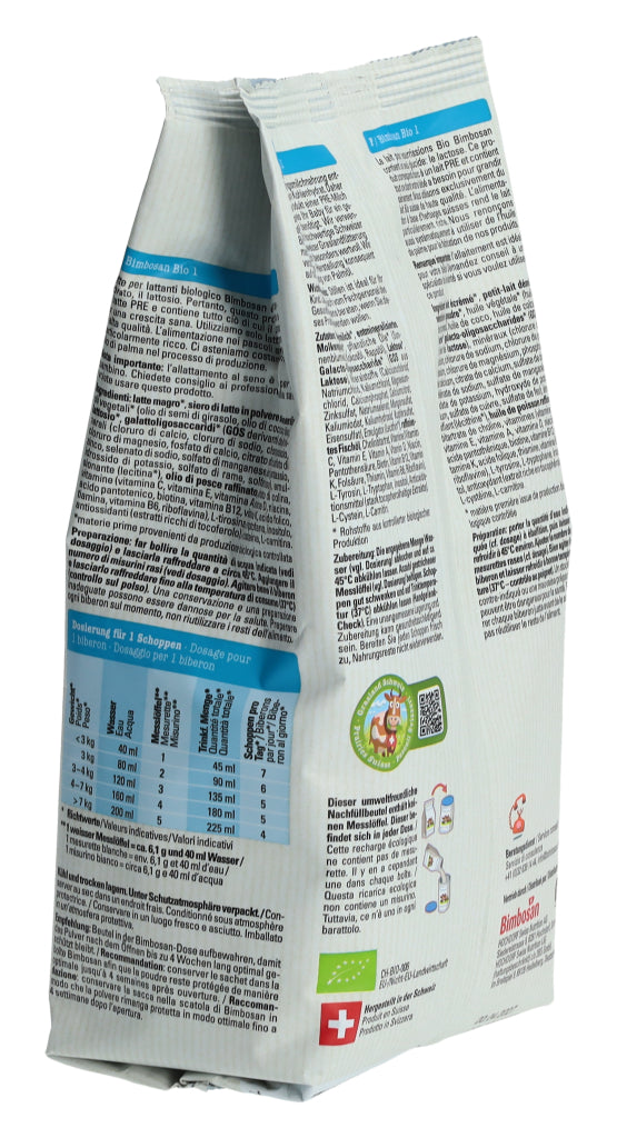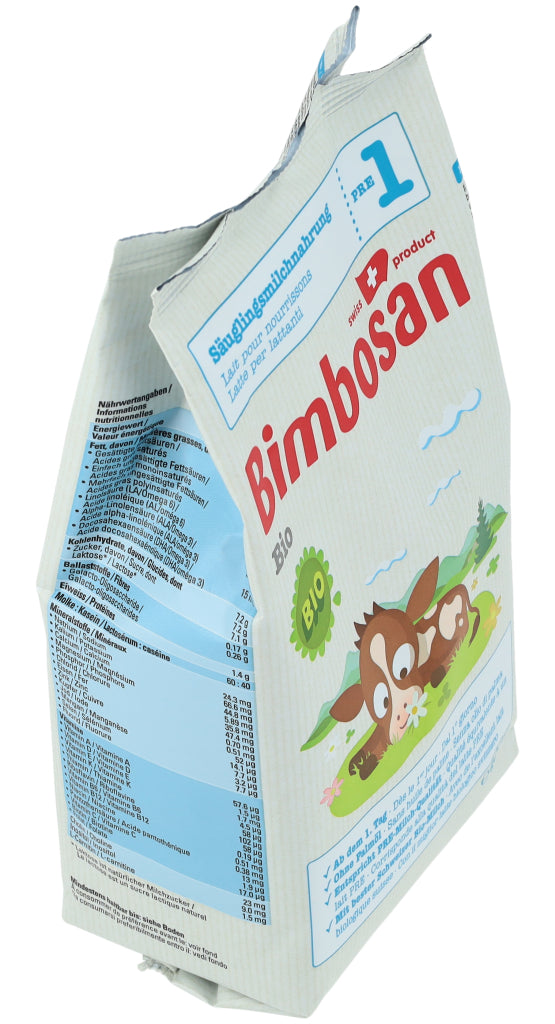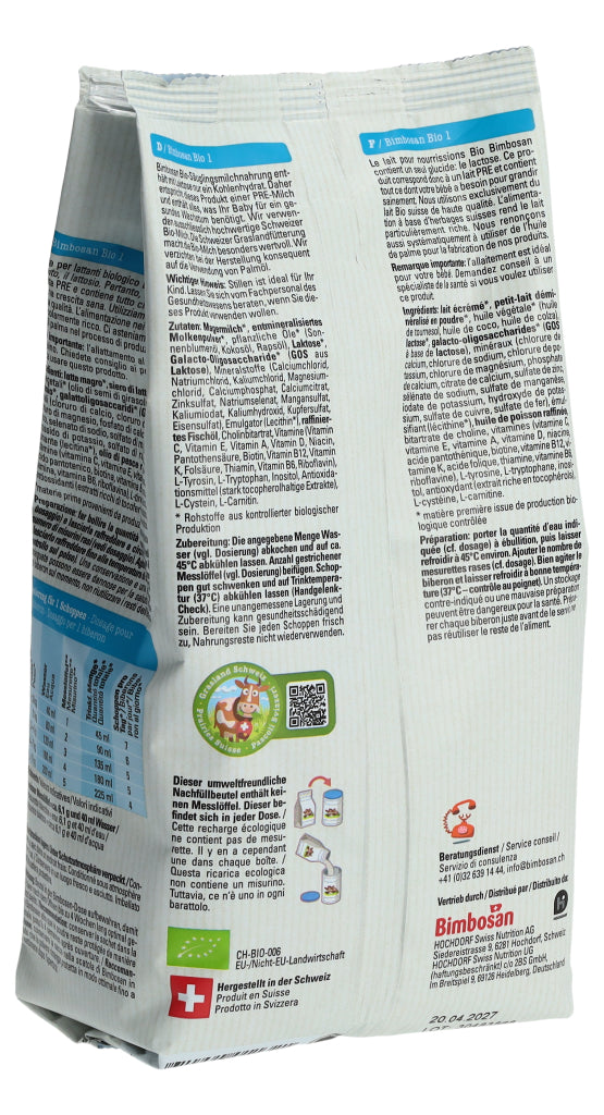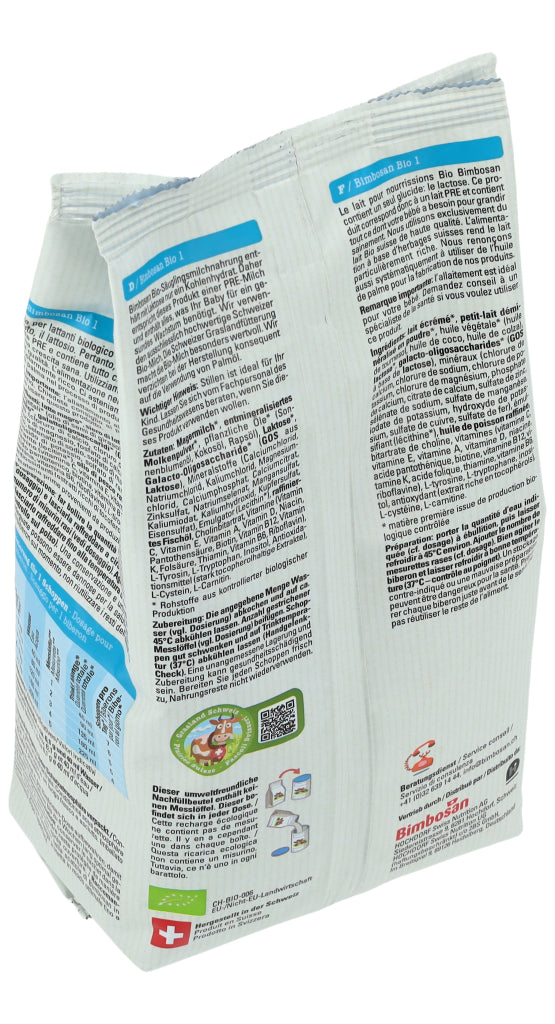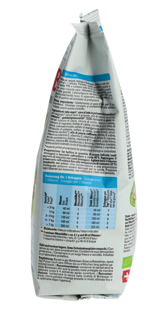 Bimbosan Bio Säuglingsmilch wird ausschliesslich aus hochwertiger Schweizer Bio-Milch hergestellt ohne die Verwendung von Palmöl. Die Anfangsmilch enthält mit der Laktose nur ein Kohlenhydrat und entspricht dashalb einer PRE-Milch. Sie enthält alles was das Baby für ein gesundes Wachstum braucht. Die Säuglingsmilchnahrung eignet sich als Ergänzung zur Muttermilch, für Babys die nicht gestillt werden oder im Anschluss an das Stillen. Sie ist angereichert mit GOS zur Unterstützung einer gesunden Darmflora, DHA für die Entwicklung des Gehirns und der Sehfunktion sowie verschiedene Mikronährstoffe und mehrfach ungesättigten Fettsäuren. Im praktischen Nachfüllbeutel.