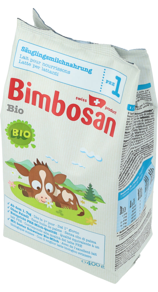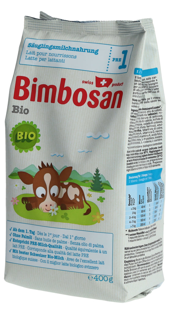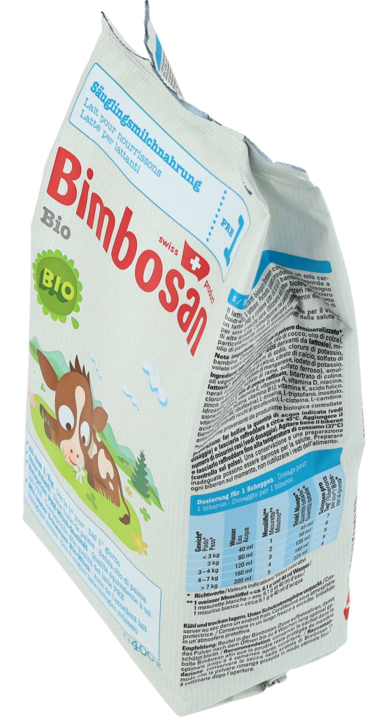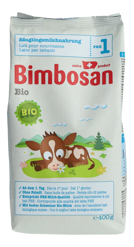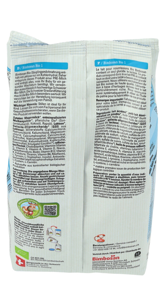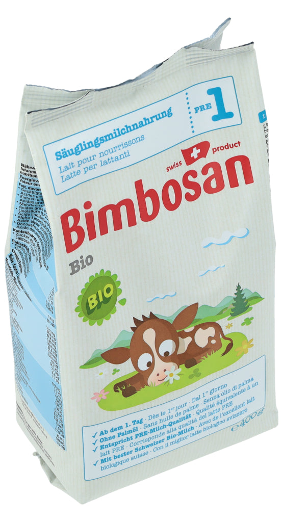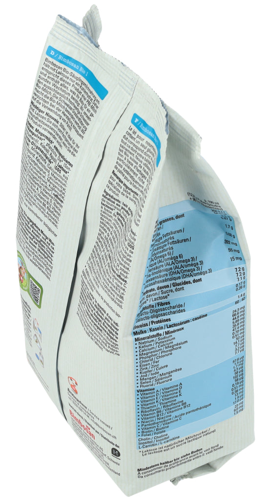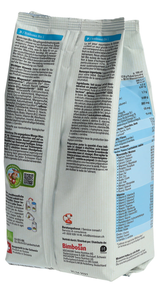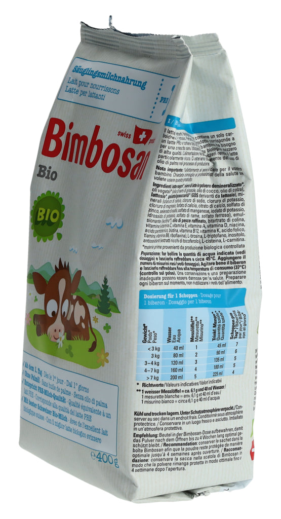 Bimbosan Bio Säuglingsmilch wird ausschliesslich aus hochwertiger Schweizer Bio-Milch hergestellt ohne die Verwendung von Palmöl. Die Anfangsmilch enthält mit der Laktose nur ein Kohlenhydrat und entspricht dashalb einer PRE-Milch. Sie enthält alles was das Baby für ein gesundes Wachstum braucht. Die Säuglingsmilchnahrung eignet sich als Ergänzung zur Muttermilch, für Babys die nicht gestillt werden oder im Anschluss an das Stillen. Sie ist angereichert mit GOS zur Unterstützung einer gesunden Darmflora, DHA für die Entwicklung des Gehirns und der Sehfunktion sowie verschiedene Mikronährstoffe und mehrfach ungesättigten Fettsäuren. Im praktischen Nachfüllbeutel.