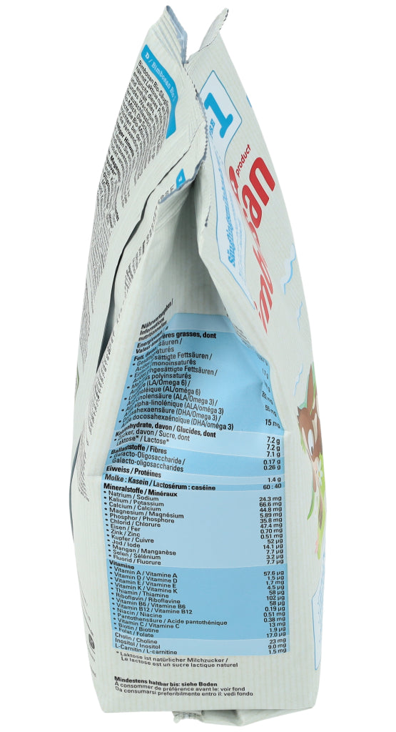 Zutaten: MAGERMILCH*, ENTMINERALISIERTES MOLKENPULVER*, pflanzliche Öle* (Sonnenblumenöl, Kokosöl, Rapsöl), LAKTOSE*, GALACTOOLIGOSACCHARIDE* (GOS aus LAKTOSE), Mineralstoffe (Kalziumchlorid, Natriumchlorid, Kaliumchlorid, Magnesiumchlorid, Kalziumphosphat, Kalziumcitrat, Zinksulfat, Natriumselenat, Mangansulfat, Kaliumjodat, Kaliumhydroxid, Kupfersulfat, Eisensulfat), Emulgator (Sonnenblumenlecithin*), RAFFINIERTES FISCHÖL, Cholinbitartrat, Vitamine (Vitamin C, Vitamin E, Vitamin A, Vitamin D, Niacin, Pantothensäure, Biotin, Vitamin B12, Vitamin K, Folsäure, Vitamin B1, Vitamin B6, Vitamin B2), L-Tyrosin, L-Tryptophan, Inositol, Antioxidationsmittel (stark tocopherolhaltige Extrakte), L-Cystein, L-Carnitin. *Rohstoffe aus kontrollierter biologischer Produktion CH.