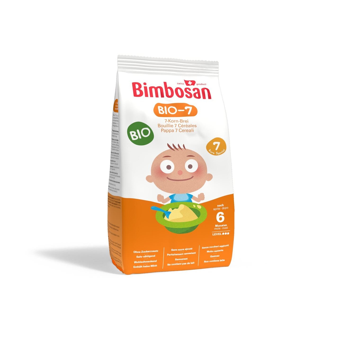 Bimbosan Bio-7 ist der optimale Schoppenzusatz für Babys, welche am Morgen grossen Appetit haben und nachts durchschlafen wollen. Frei von jeglicher Form von Zucker ist dieser ein einzigartiger, naturbelassener Schoppenzusatz und Brei basierend auf sieben auserlesenen Getreidesorten. Die enthaltenen Getreide Reis, Hirse, Dinkel, Hafer, Roggen, Gerste und Mais sind von höchster Qualität und werden nach den strengen Knospe-Richtlinien biologisch angebaut und behandelt. Bio-7 ist ideal, wenn das Kind nach 5 Monaten mit der gewohnten Milch allein nicht mehr genügend gesättigt ist. Mit diesem Schoppenzusatz ist weder Kakao noch Weizen enthalten.