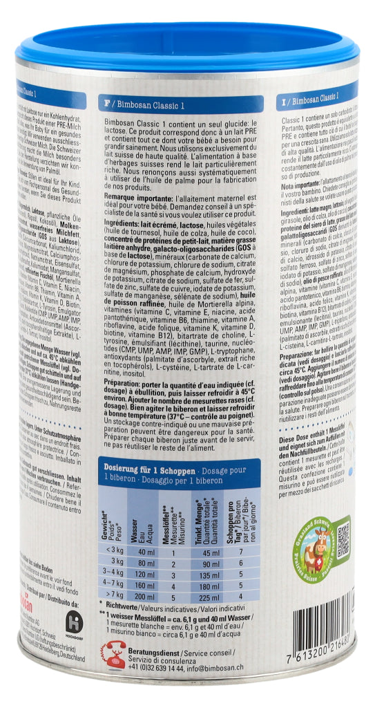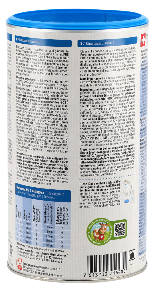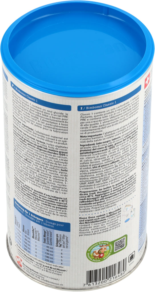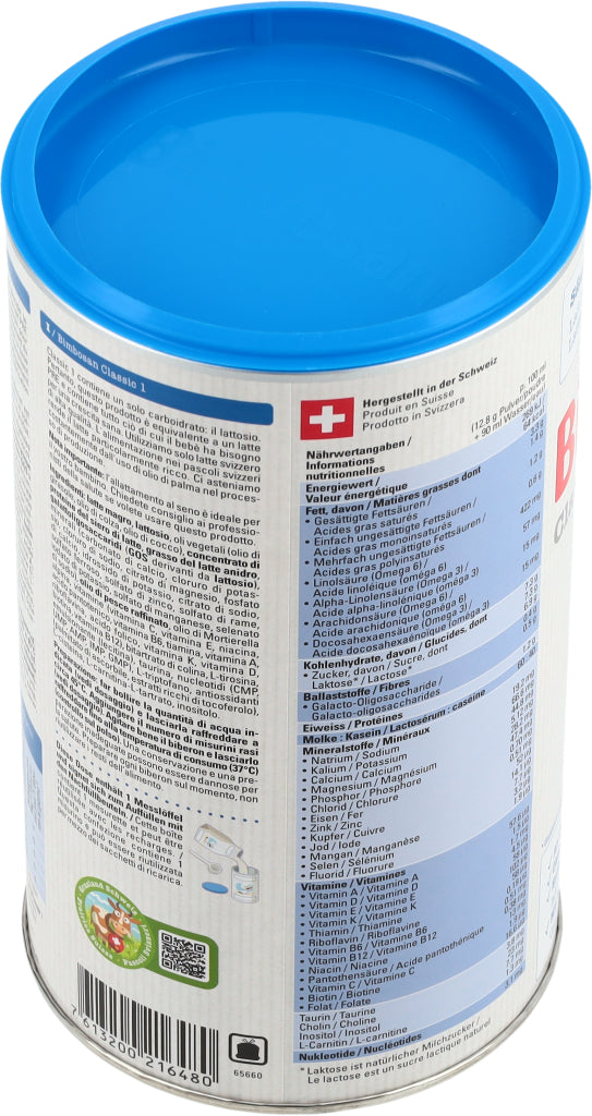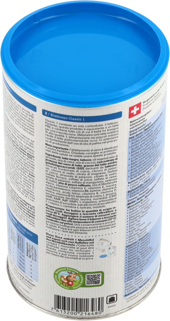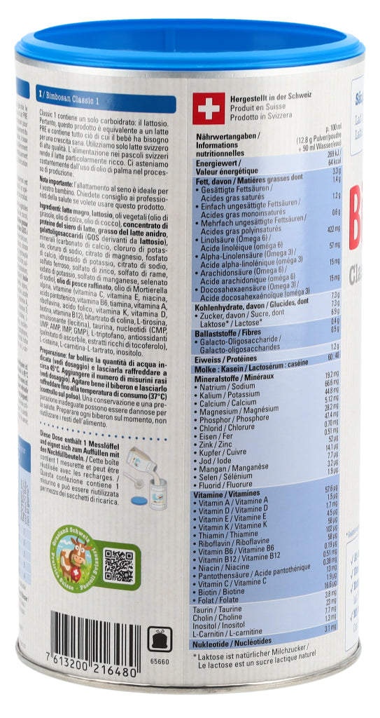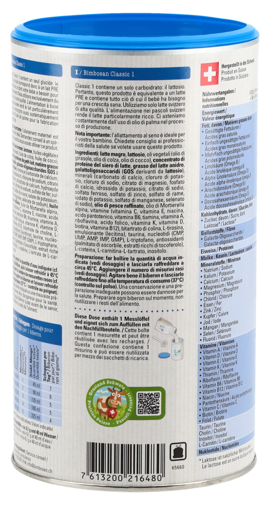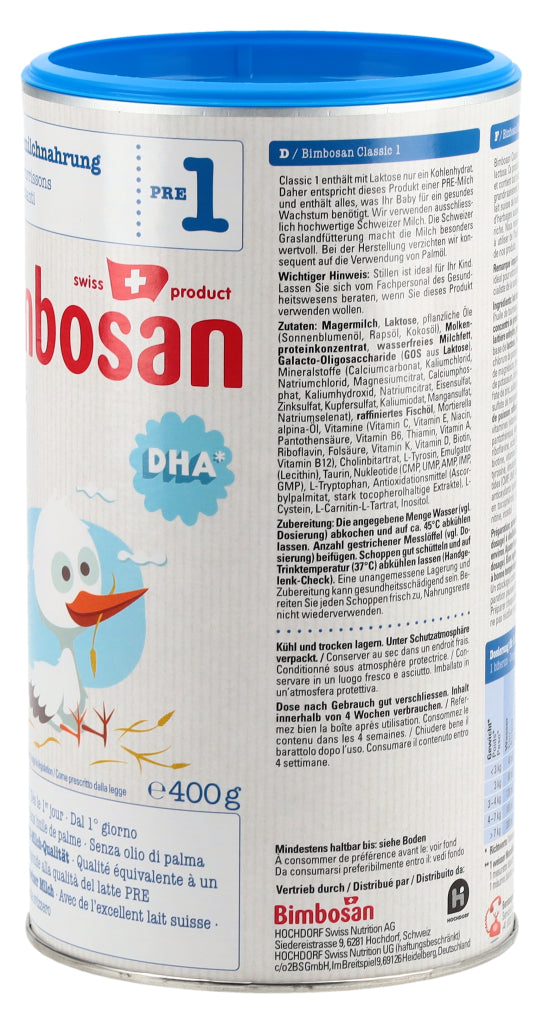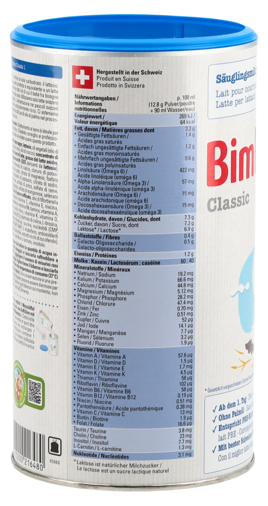 Bimbosan Classic 1 ist die ideale Säuglingsmilchnahrung ab dem 1. Tag ohne Palmöl. Da die Milch mit Laktase nur ein Kohlenhydrat enthält, entspricht sie einer PRE-Milch und enthält wichtige Inhaltsstoffe wie DHA für die Entwicklung des Gehirns und der Sehfunktion, GOS für eine gesunde Darmflora und verschiedenen Mikronährstoffen zur Unterstützung des Wachstums. Für die Herstellung wird ausschliesslich hochwertige Schweizer Milch verwendet. Sie eignet sich als Ergänzung zur Muttermilch, im Anschluss an das Stillen und für Babys, die nicht gestillt werden können.