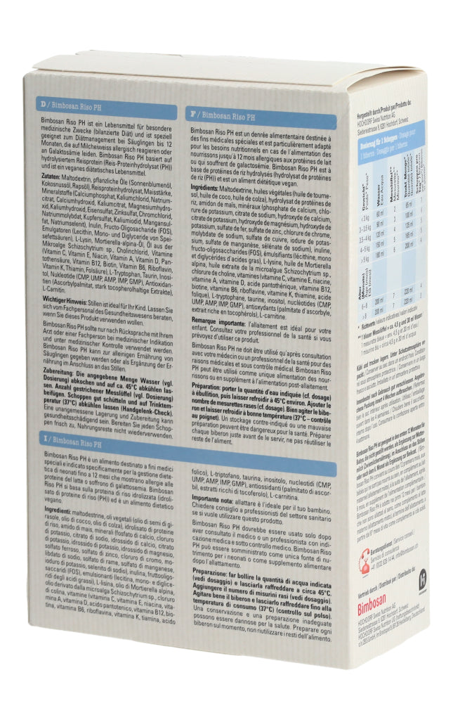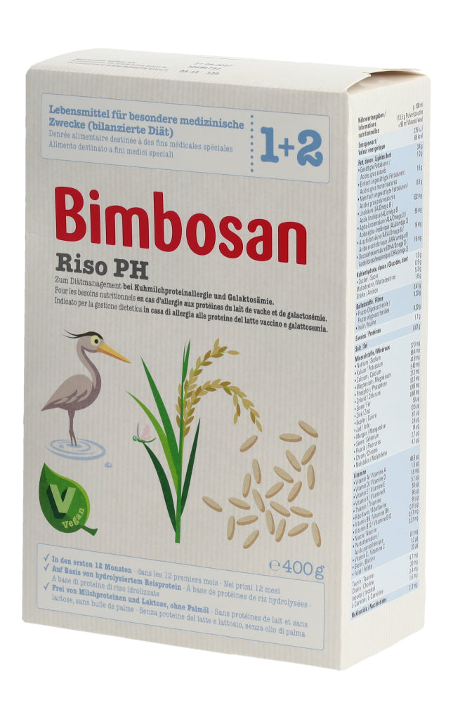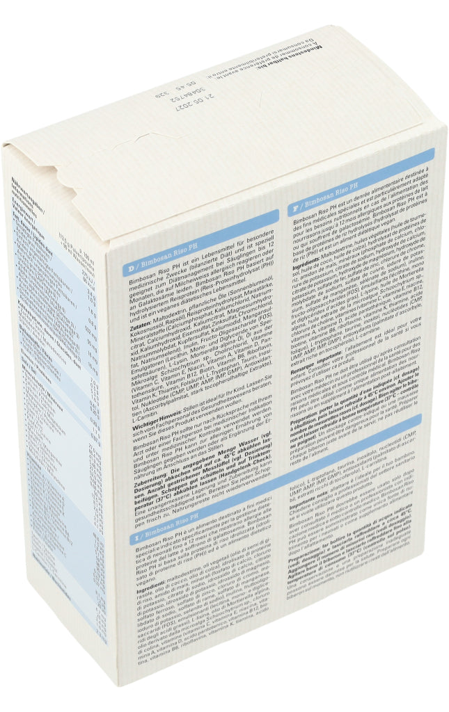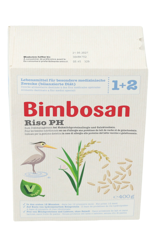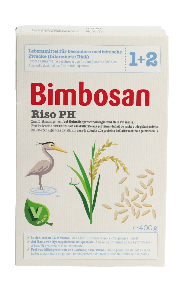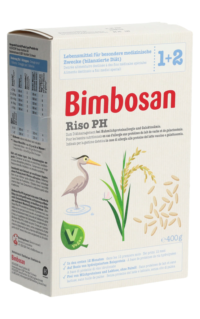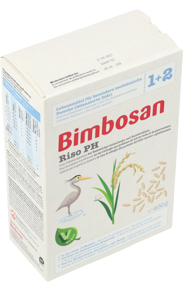 Bimbosan Riso PH ist ein Lebensmittel für besondere medizinische Zwecke (bilanzierte Diät) und ist speziell geeignet zum Diätmanagement bei Säuglingen bis 12 Monaten, die auf Milcheiweiss allergisch reagieren oder an Galaktosämie leiden. Das Produkt basiert auf hydrolysiertem Reisprotein (Reis-Proteinhydrolysat (PH)) und ist ein veganes diätetisches Lebensmittel.