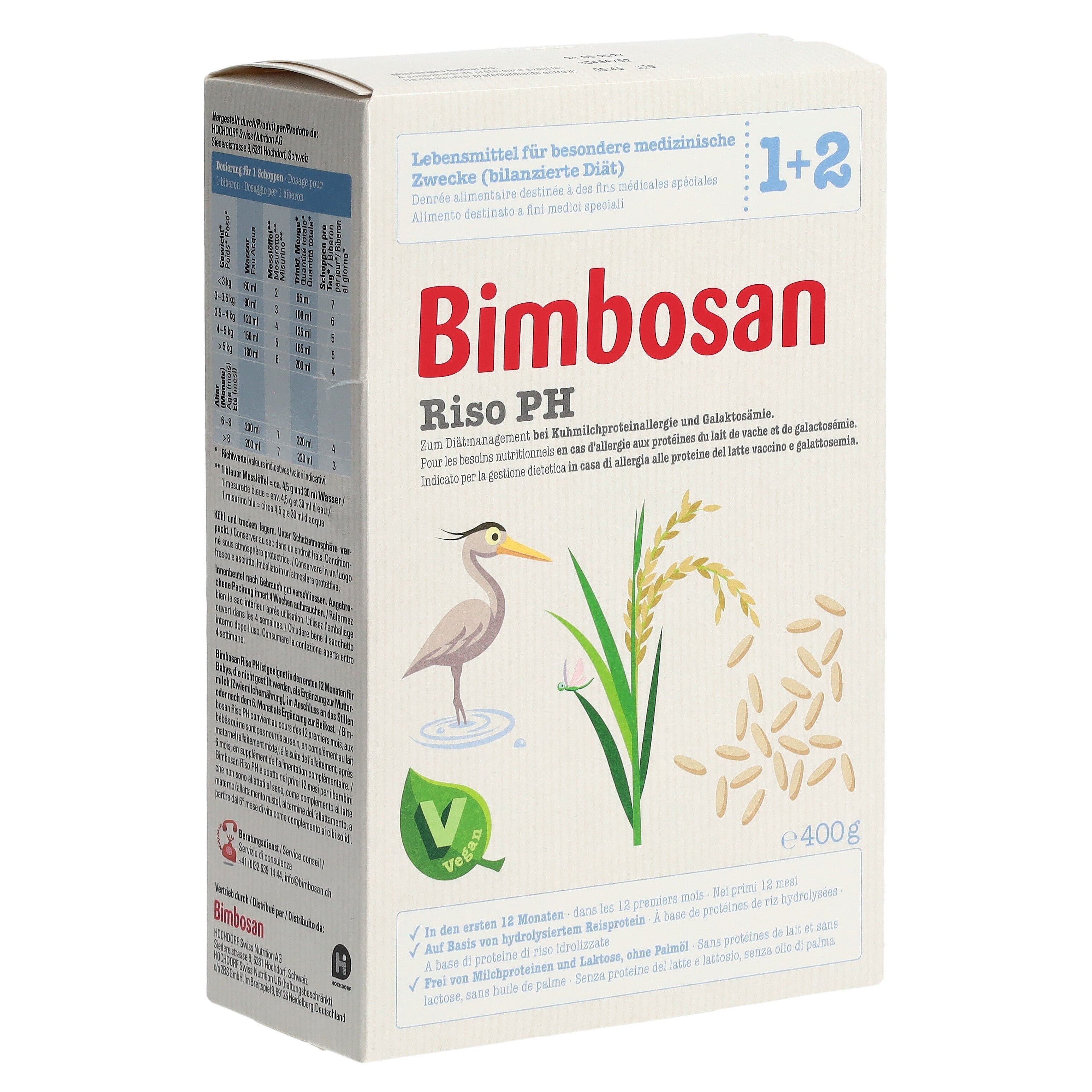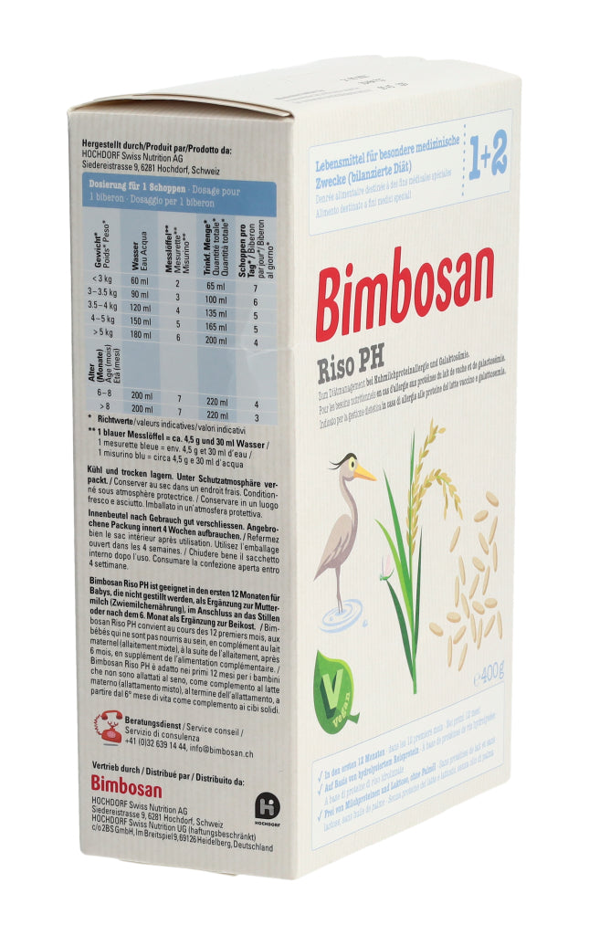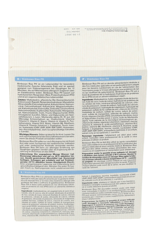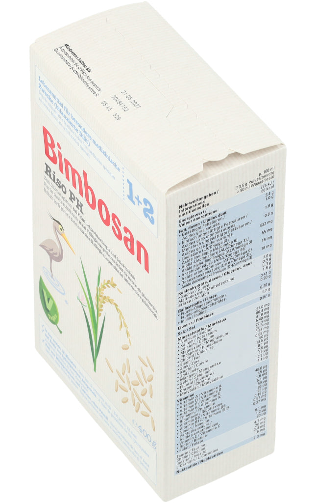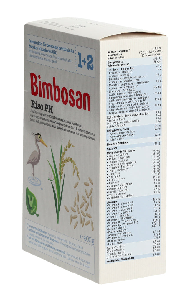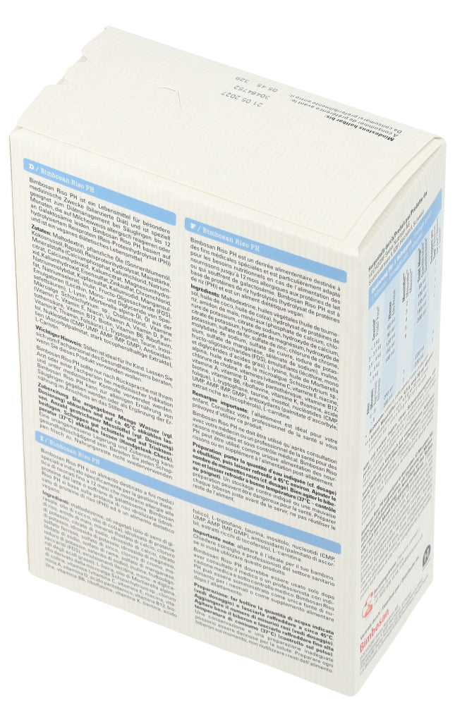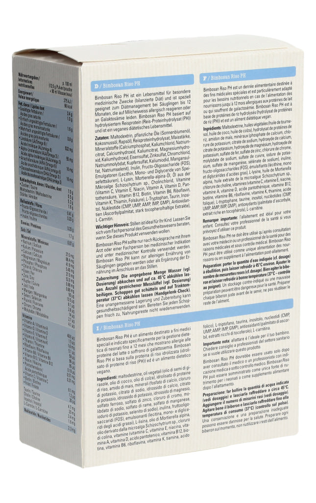 Bimbosan Riso PH ist ein Lebensmittel für besondere medizinische Zwecke (bilanzierte Diät) und ist speziell geeignet zum Diätmanagement bei Säuglingen bis 12 Monaten, die auf Milcheiweiss allergisch reagieren oder an Galaktosämie leiden. Das Produkt basiert auf hydrolysiertem Reisprotein (Reis-Proteinhydrolysat (PH)) und ist ein veganes diätetisches Lebensmittel.