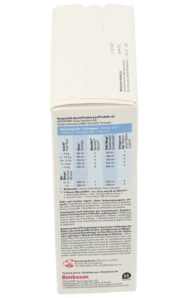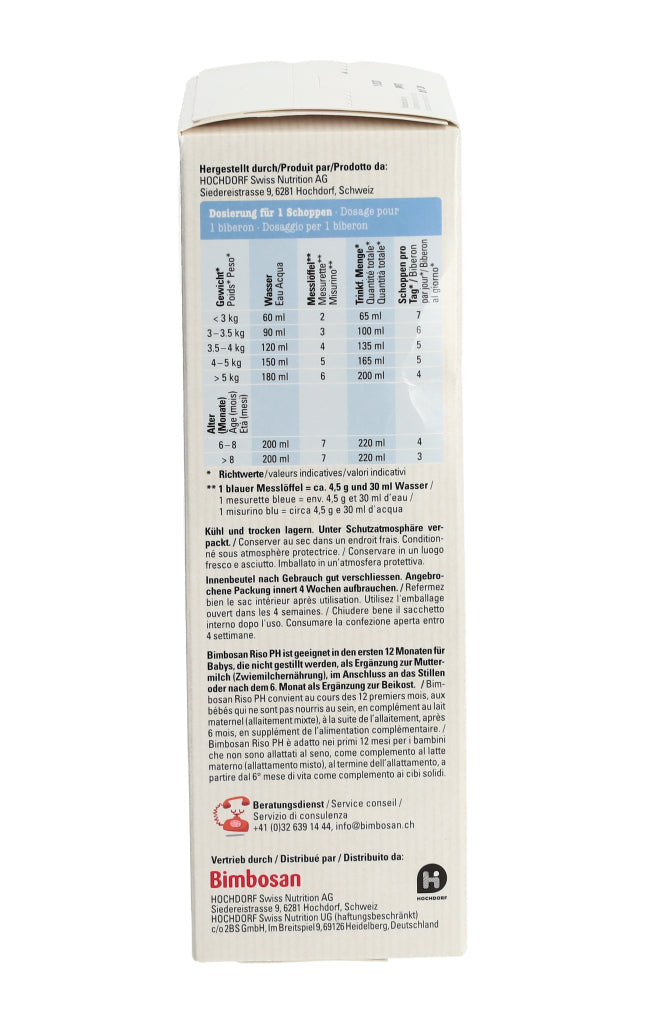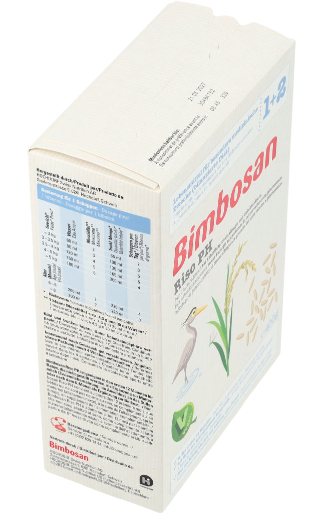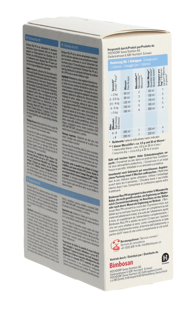 Stillen ist ideal für Ihr Kind. Lassen Sie sich vom Fachpersonal des Gesundheitswesens beraten, wenn Sie dieses Produkt verwenden wollen. Bimbosan Riso PH sollte nur nach Rücksprache mit Ihrem Arzt oder einer Fachperson bei medizinischer Indikation und unter medizinischer Kontrolle verwendet werden. Das Produkt kann zur alleinigen Ernährung von Säuglingen gegeben werden oder als Ergänzung der Ernährung im Anschluss an das Stillen. Innenbeutel nach Gebrauch gut verschliessen. Angebrochene Packung innert 4 Wochen aufbrauchen. Kühl und trocken lagern. Hergestellt: In der Schweiz.