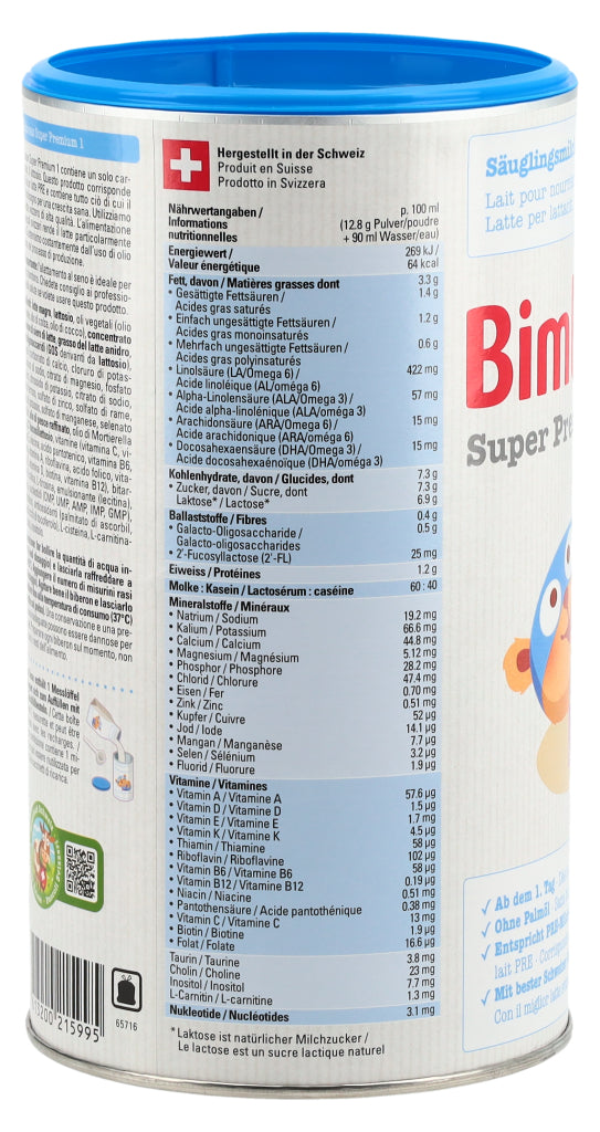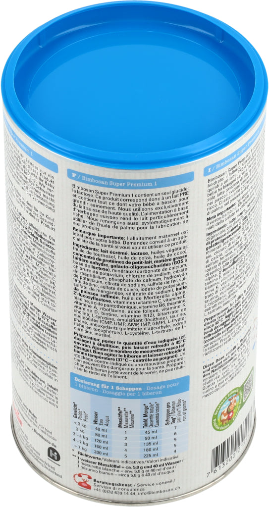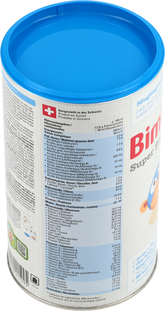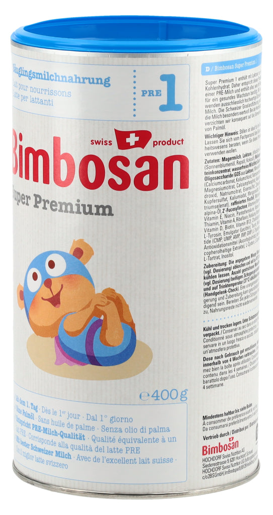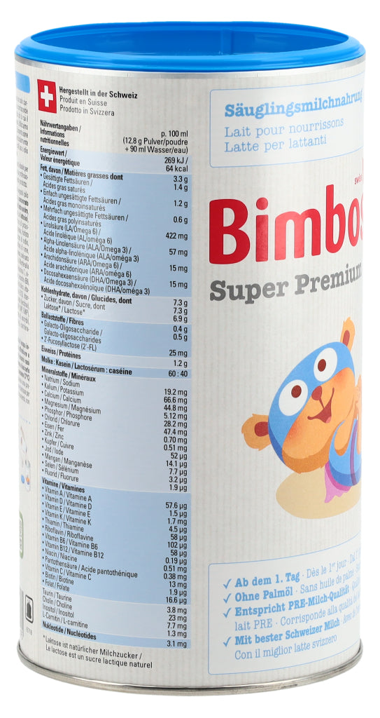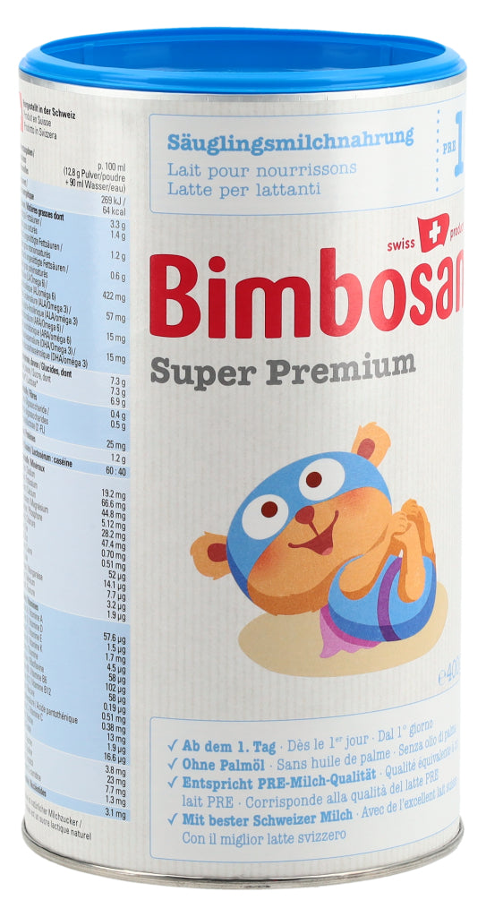 Die Super-Modernen, Auch die modernsten Bimbosan-Milchen enthalten erstklassige Schweizer Kuhmilch. Unsere Super Premium Milchen überzeugen durch ihren milchigen, exzellenten Geschmack und ihre ergänzenden Zutaten. Sie erfüllen die neusten Empfehlungen und Vorgaben und versorgen Säuglinge und Kleinkinder in jeder Phase mit den Nährstoffen, die sie brauchen. Super Premium 1 enthält mit Laktose nur ein Kohlenhydrat.