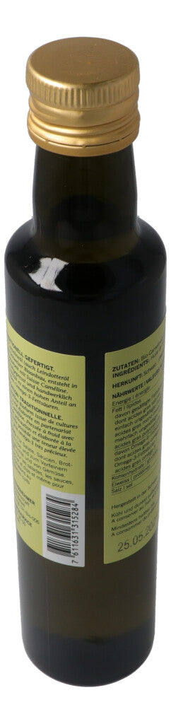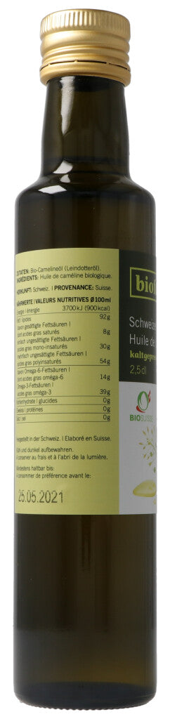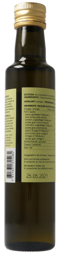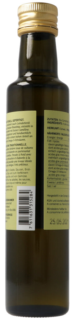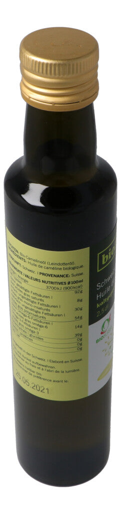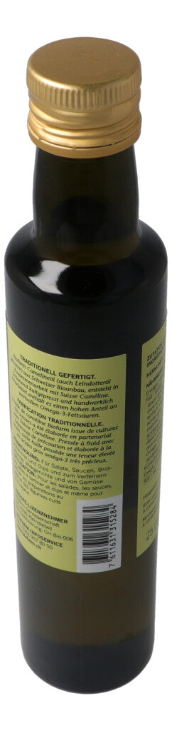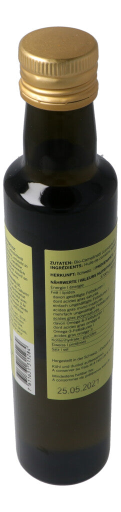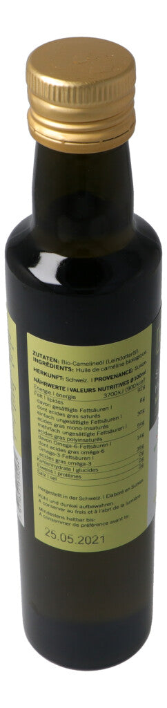 Bio-Camelineöl (Leindotteröl). Omega-3-Fettsäuren 39g/100g Omega-6-Fettsäuren 14g/100g.