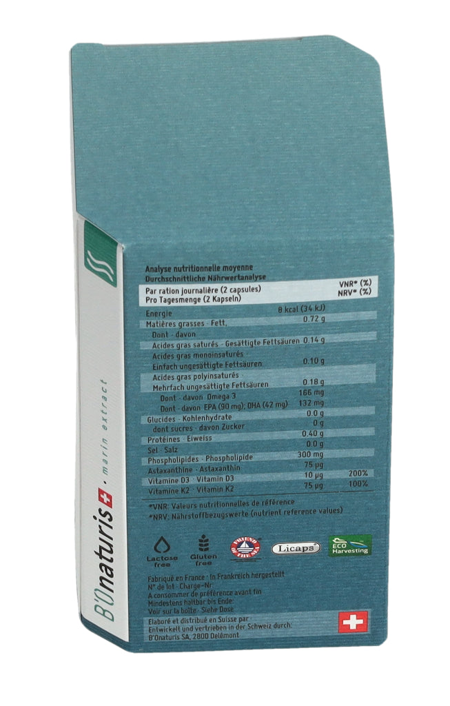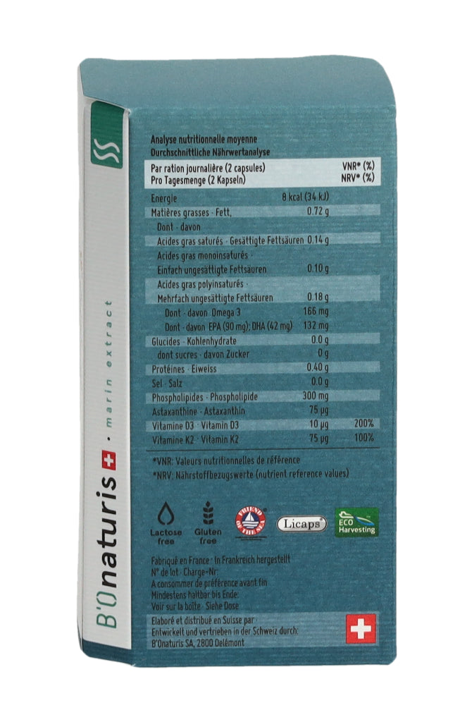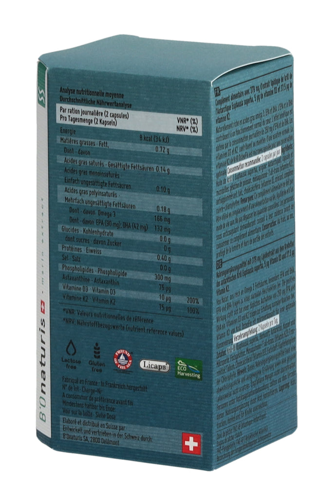 Krill-Öl (Euphausia superba, Herkunft: Antarktis), Kapsel und Mikroperle: Fischgelatine, Menaquinone-7 all-trans (Vitamin K2), Antiklumpmittel: Talkum, Cholecalciferol (Vitamin D3), Farbstoff: Kupferkomplexe der Chlorophylle. Nährwerte pro 2 Kapseln: • Omega 3 166mg -davon EPA 90mg -davon DHA 42mg • Phospholipide 300mg • Astaxanthin 75µg.