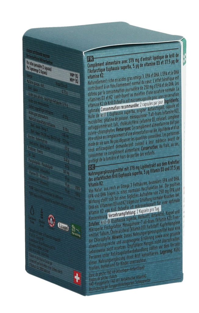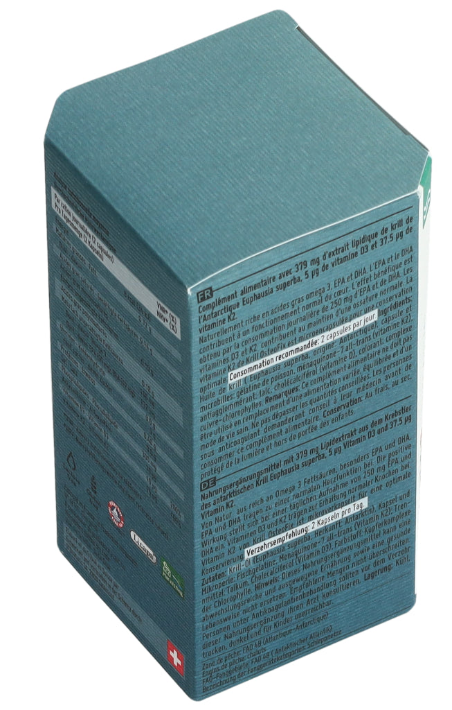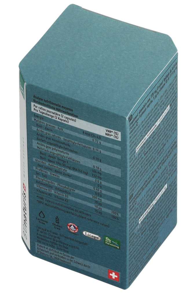 Verzehrempfehlung: 2 Kapseln pro Tag. Von Natur aus reich an Omega 3 Fettsäuren, besonders EPA und DHA. EPA und DHA tragen zu einer normalen Herzfunktion bei. Die positive Wirkung stellt sich bei einer täglichen Aufnahme von 250mg EPA und DHA ein. Vitaminen D3 und K2 tragen zur Erhaltung normaler Knochen bei.