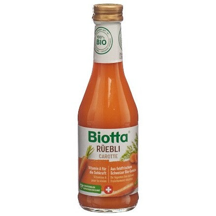 Dieser Biotta Klassiker besteht aus acht erntefrisch gepressten Karotten aus dem Kanton Thurgau. Mit diesem Traditions-Saft unterstützen Sie optiaml Ihre ausgewogene Ernährung und gesunde Lebensweise. Nicht nur, dass der Saft reich an Betacarotin (Vitamin A) ist, er trägt auch zur Erhaltung einer normalen Sehkraft bei.