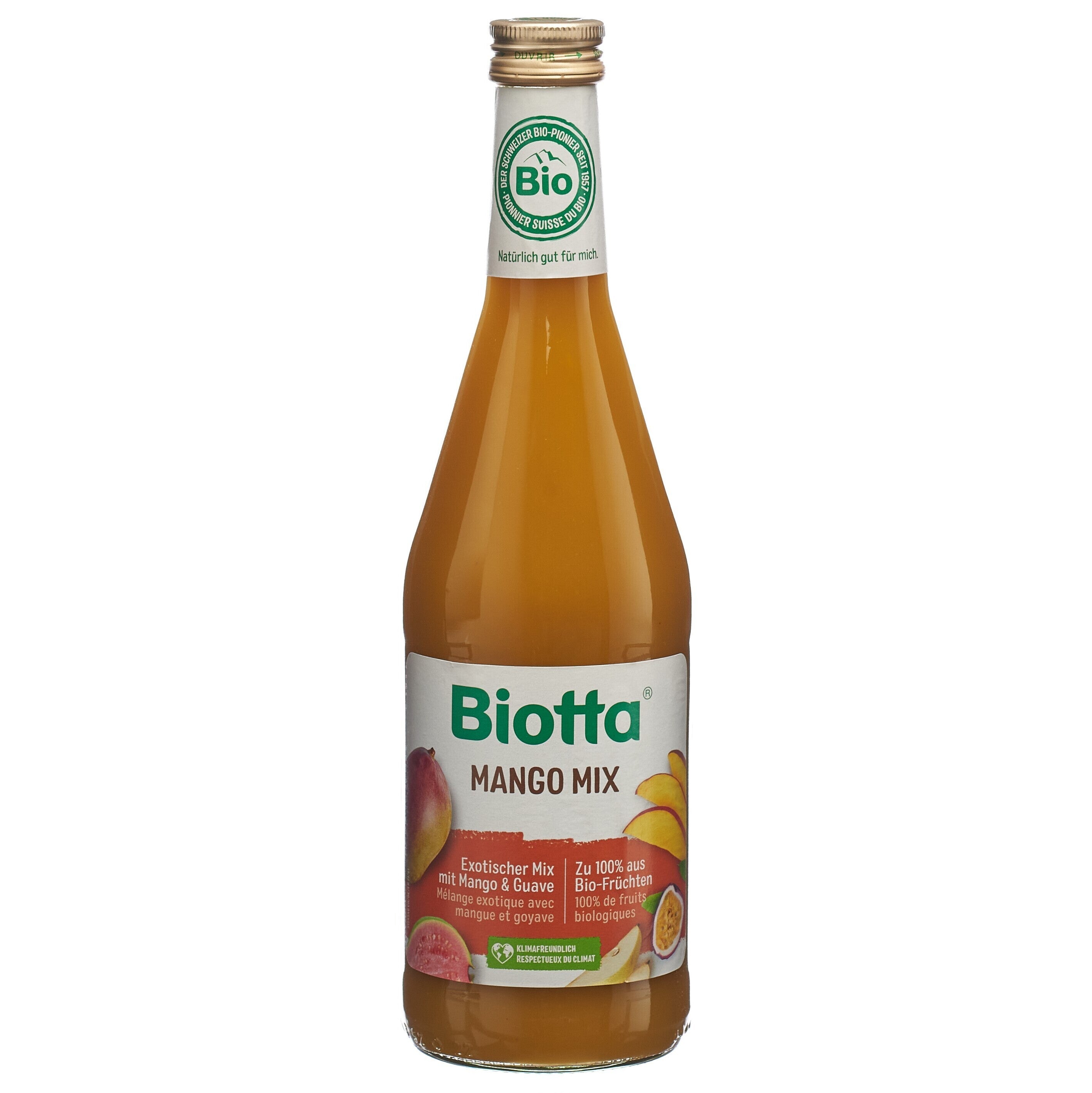 Dieser Biotta Mango Mix bringt Ihnen ein Urlaubserlebnis zumindest geschmacklich gesehen etwas näher. Der fruchtige Erfrischungscocktail aus erstklassigen, sonnengereiften Früchten besteht aus einer exotischen Fruchtpüree-Mischung: Mango (Indien), Guave (Brasilien) und Maracuja (Kolumbien). Raffiniert verfeinert mit Traubensaft (Italien), Birnensaft (Schweiz) und Apfelsaft (Schweiz).