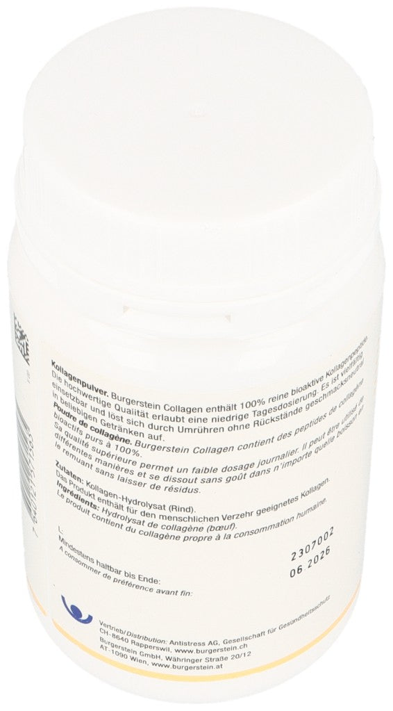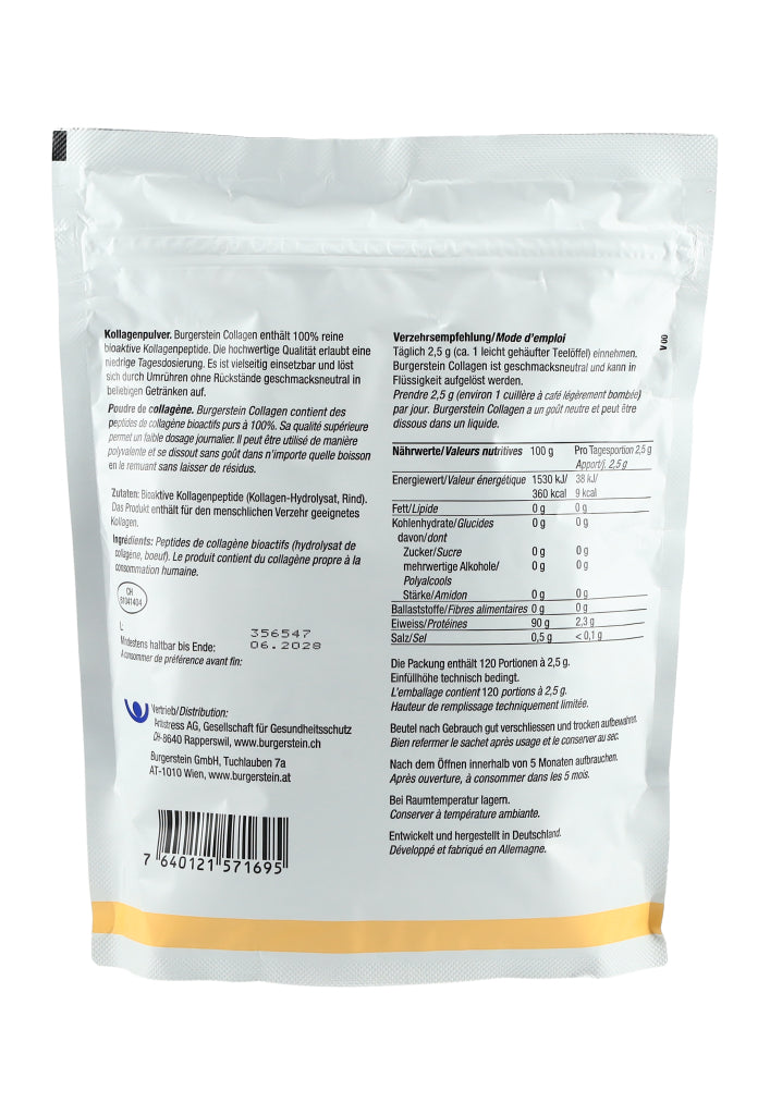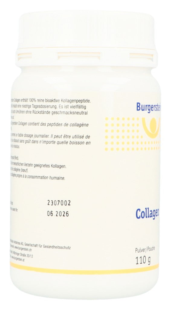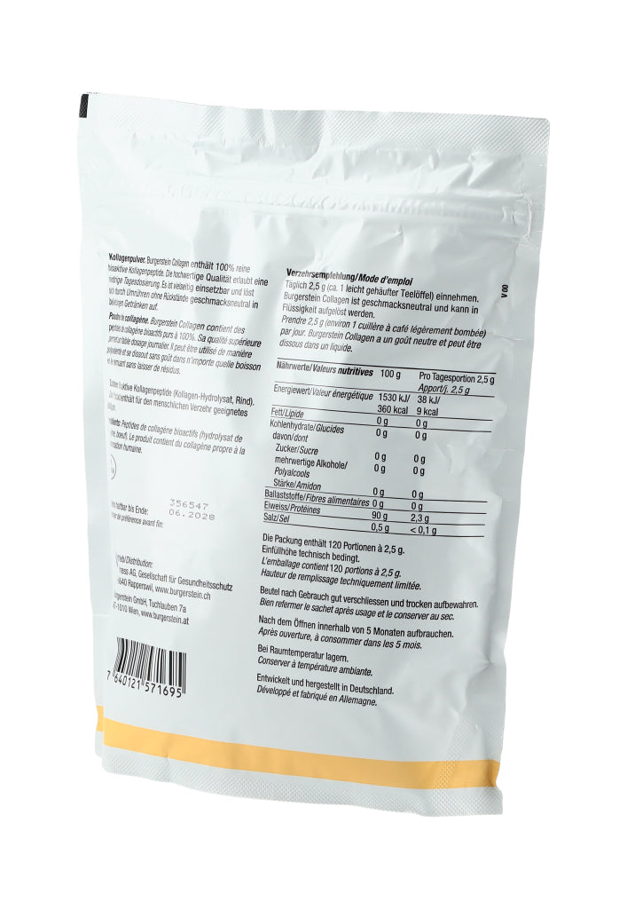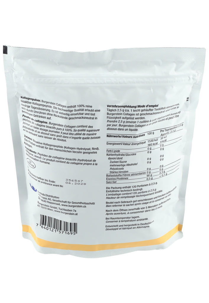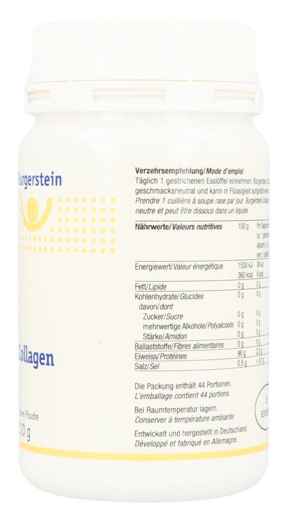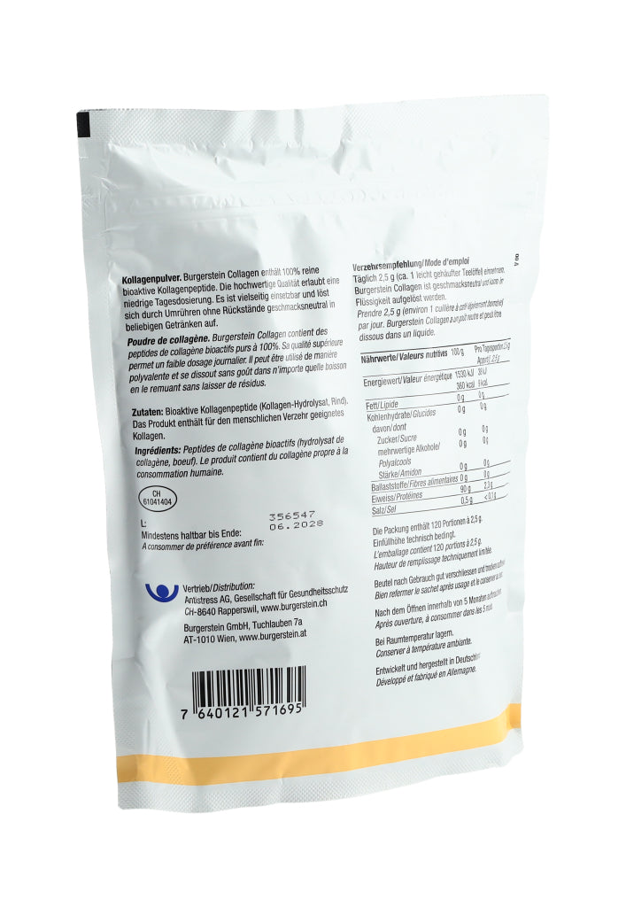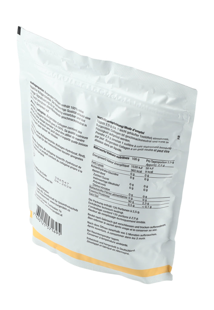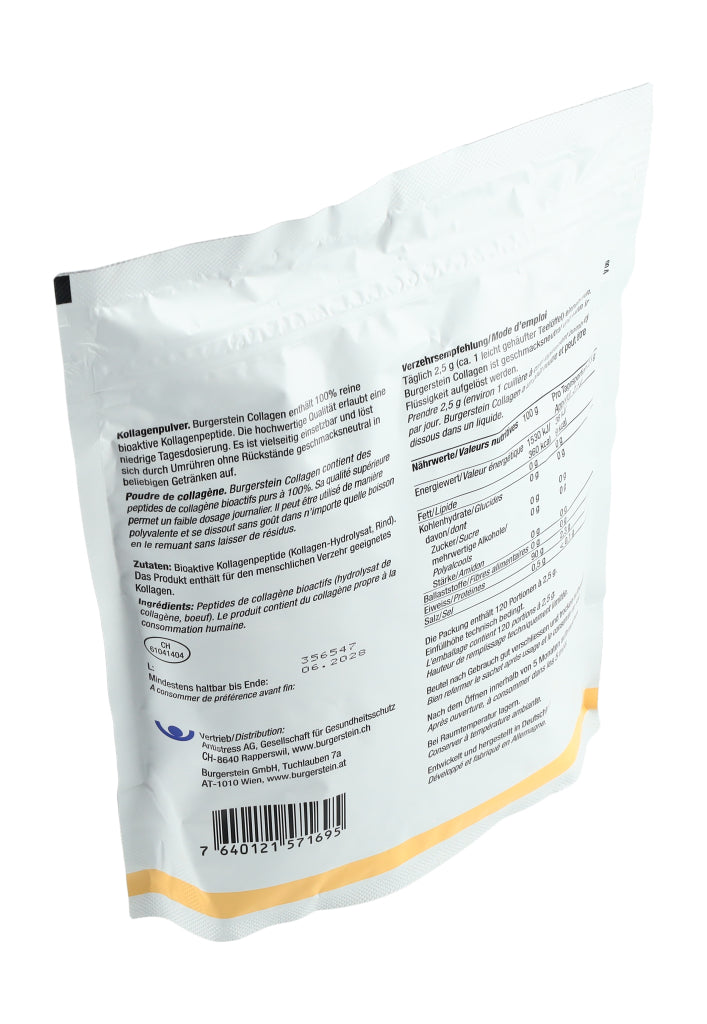 Burgerstein Collagen enthält 100% reine bioaktive Kollagenpeptide. Die hochwertige Qualität erlaubt eine niedrige Tagesdosierung. Es ist vielfältig einsetzbar und löst sich durch Umrühren ohne Rückstände geschmacksneutral in beliebigen Getränken auf.