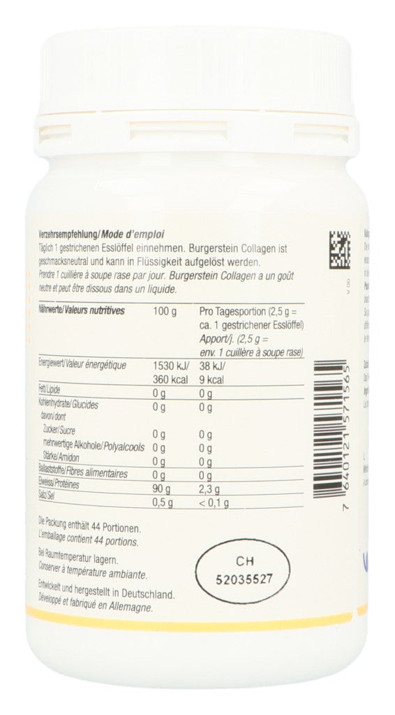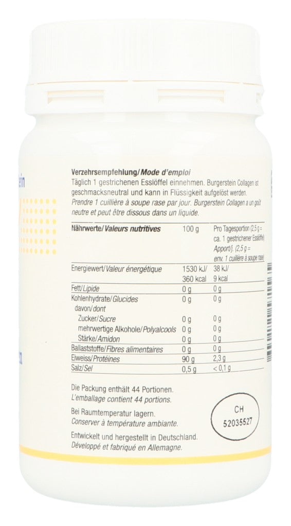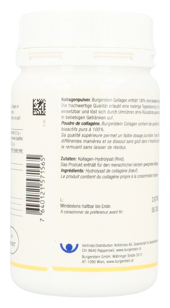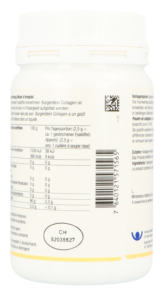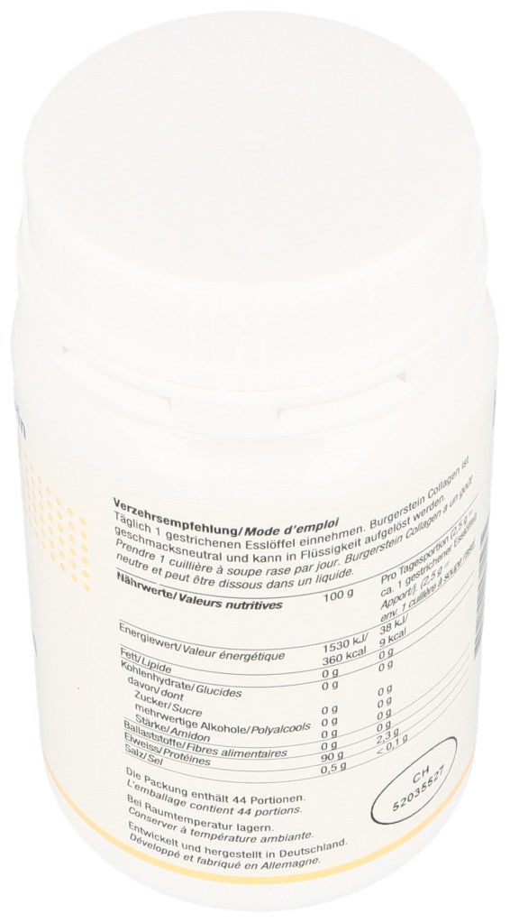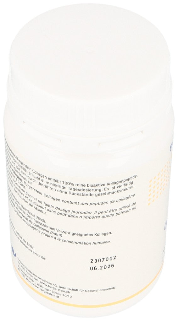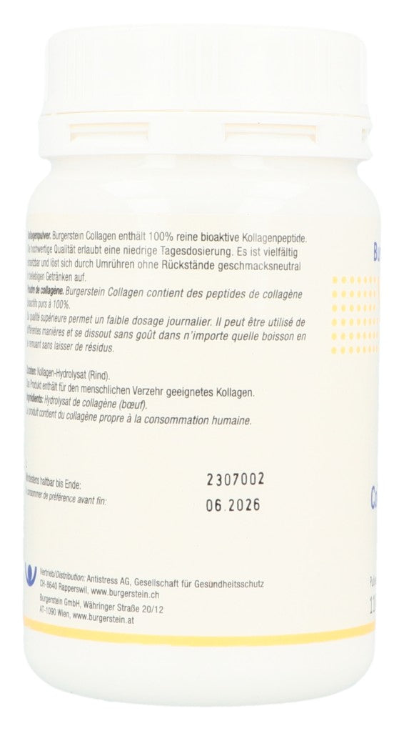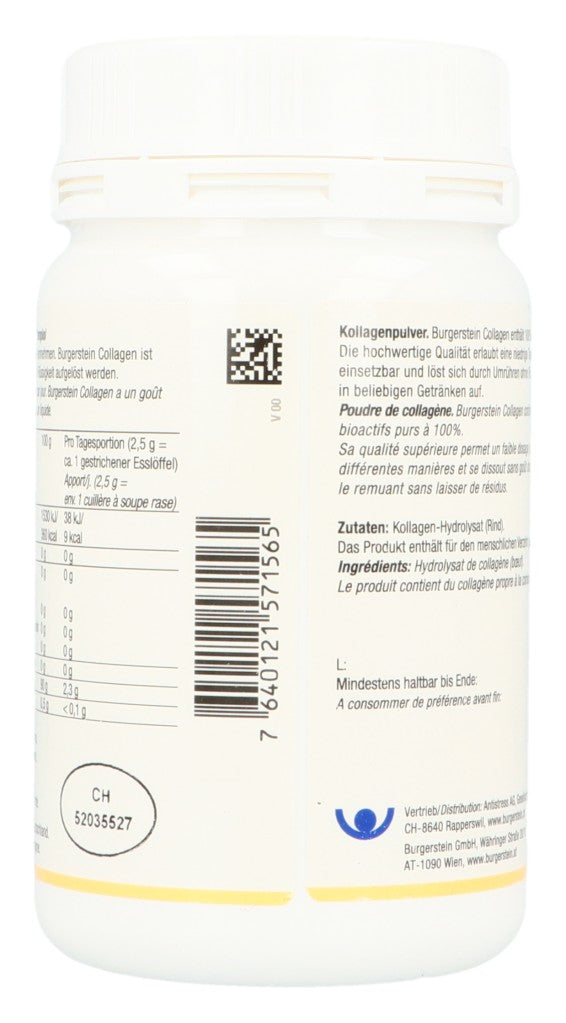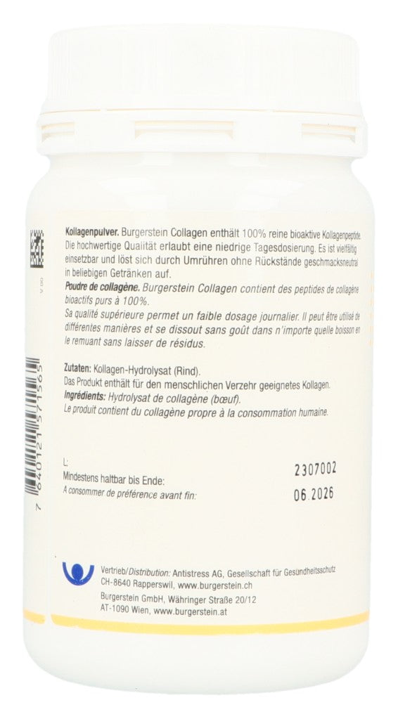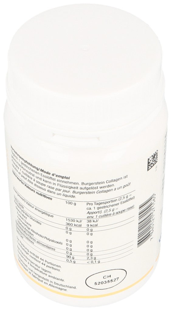 Burgerstein Collagen enthält 100% reine bioaktive Kollagenpeptide. Die hochwertige Qualität erlaubt eine niedrige Tagesdosierung. Es ist vielfältig einsetzbar und löst sich durch Umrühren ohne Rückstände geschmacksneutral in beliebigen Getränken auf.