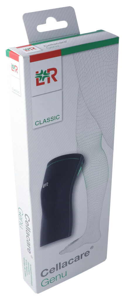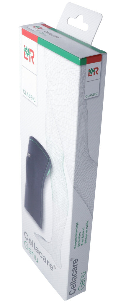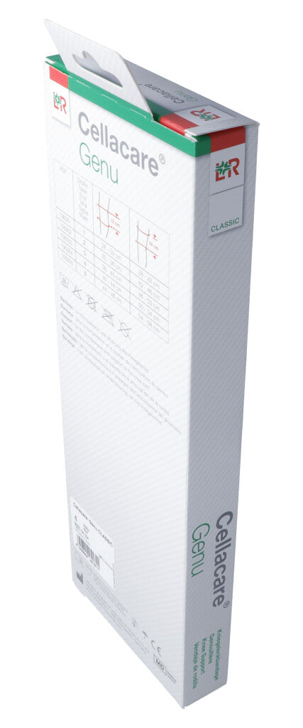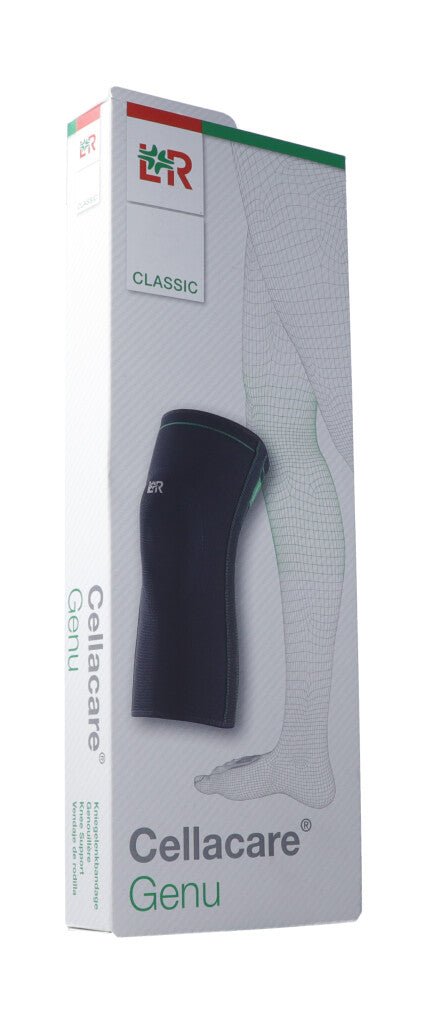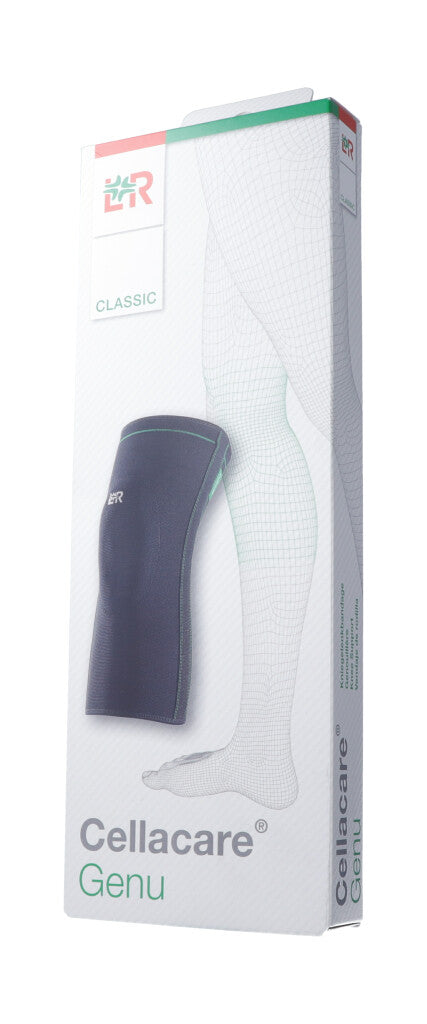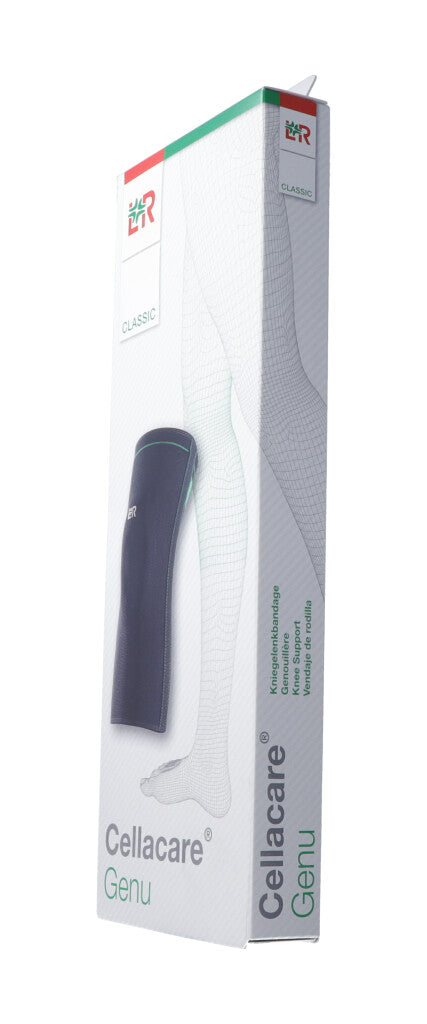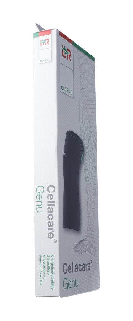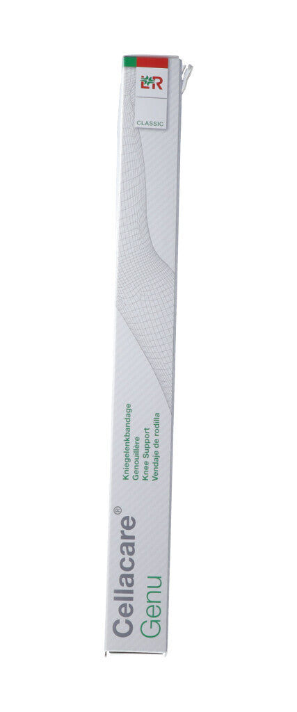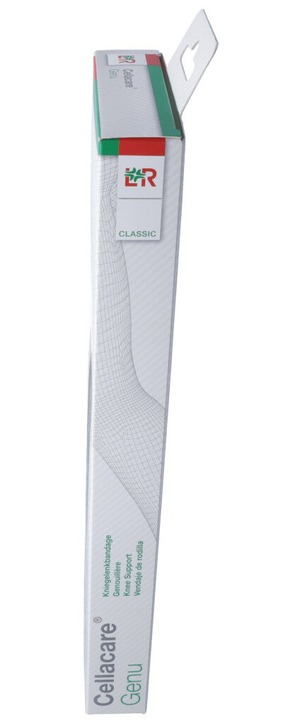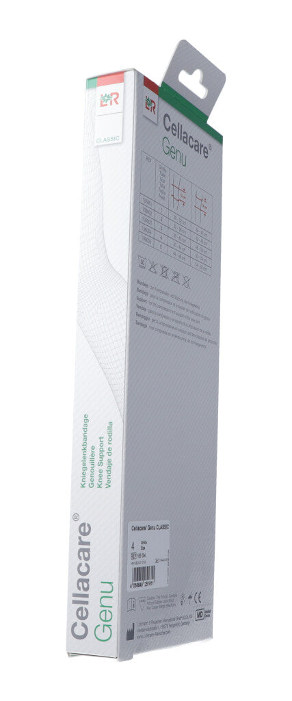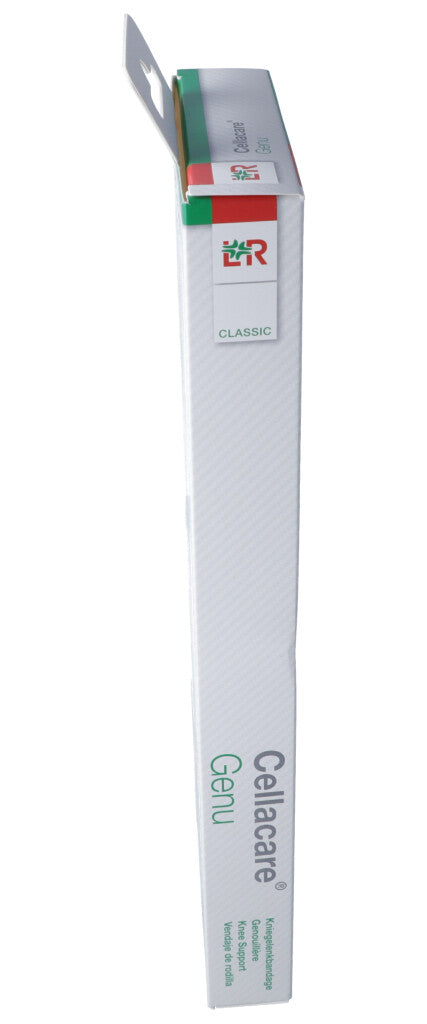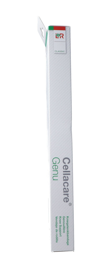 Cellacare Genu Classic ist eine Strickbandage zur Kompression und Stützung des Kniegelenks. gestrickte Bandage mit Kompressionswirkung intermittierender Massageeffekt rechts wie links tragbar Produktnutzen Bewährtes Funktionsprinzip kompressives Gestrick (Kompressionsklasse 2) verbessert die Propriozeption integrierte seitliche Federstäbe Massageeffektintegrierte Ringpelotte sorgt für intermittierende Massagewirkung bei Bewegung und wirkt druckverteilend  ProduktzusammensetzungElastodien, Baumwolle, Polyamid, Elasthan, Polyurethan, Silikon, Stahl, Polyester Positionsnummer im Hilfsmittelverzeichnis05.04.01.0125(Angaben zur Rezeptierung und Erstattung gelten nur in Deutschland) Ausführungen rechts wie links tragbar Farbe: schwarz/grün