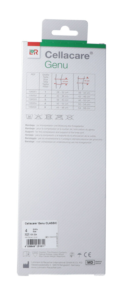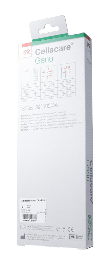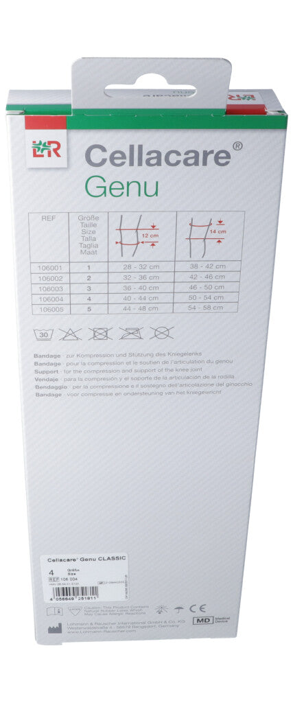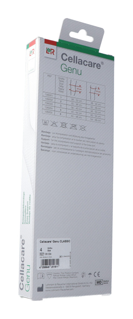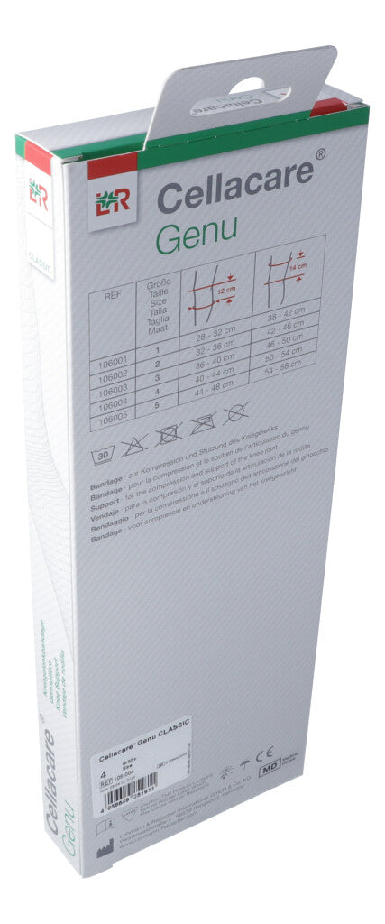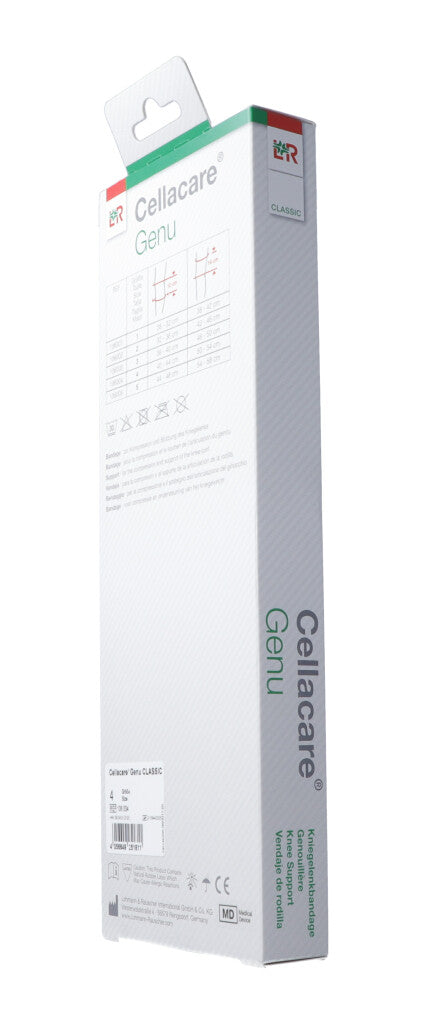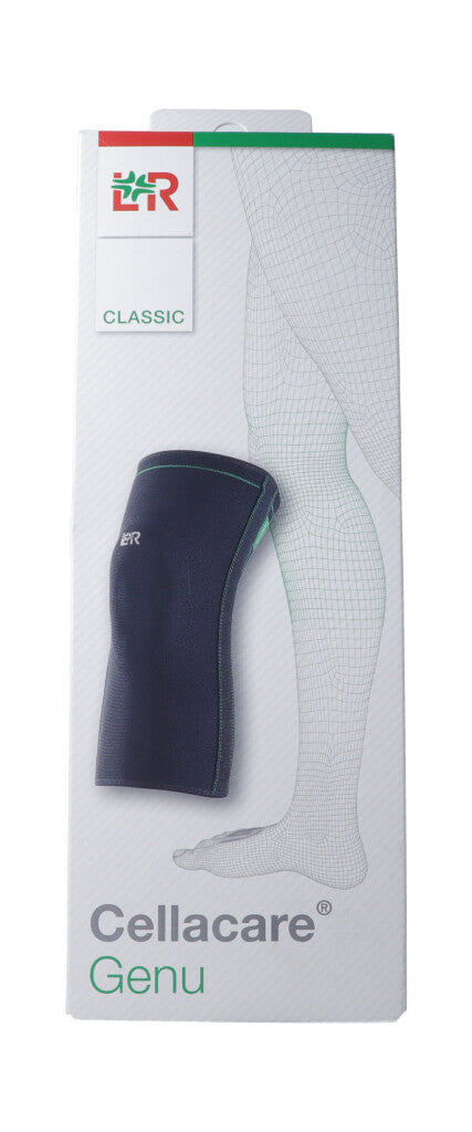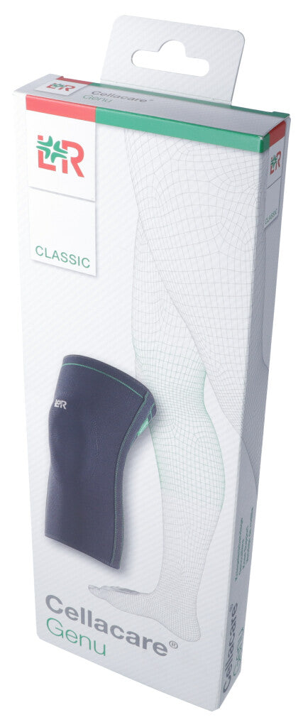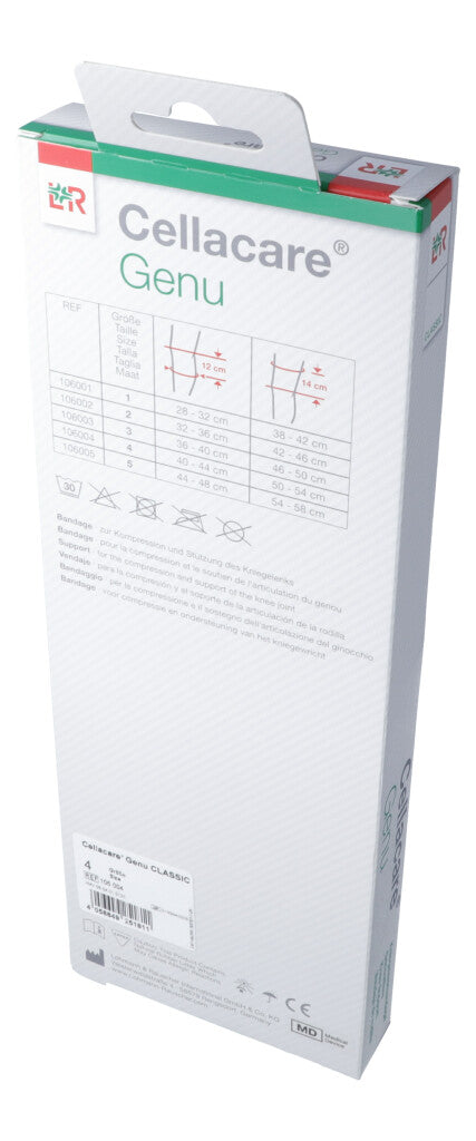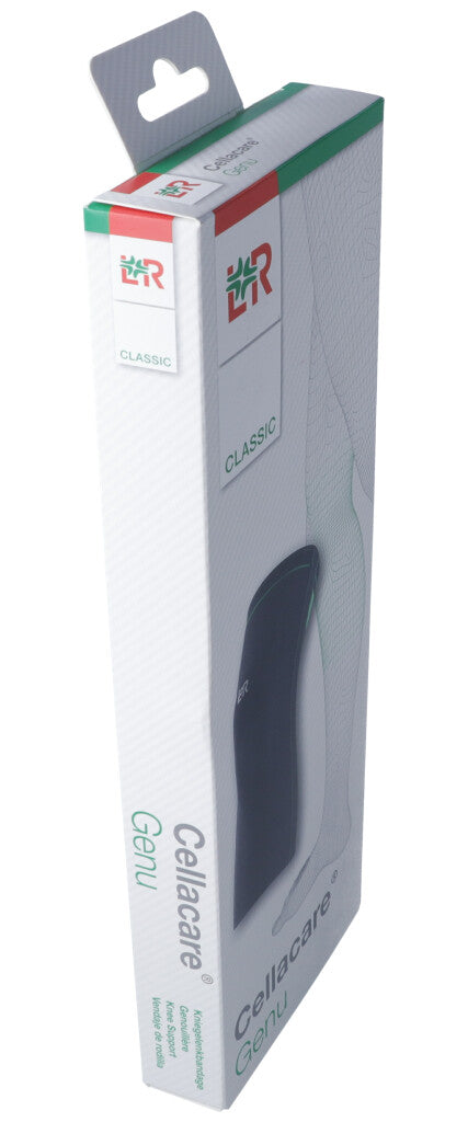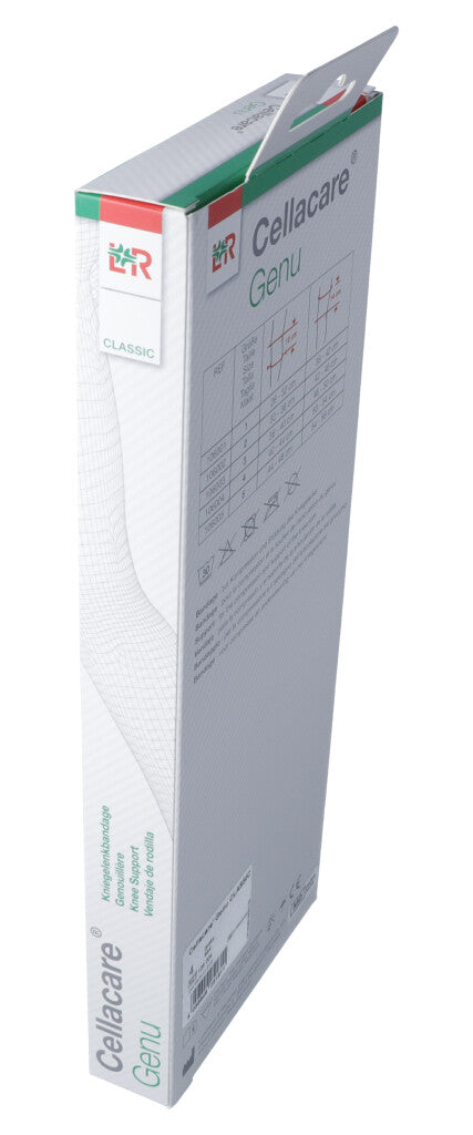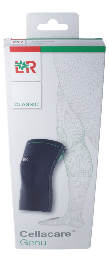 Cellacare Genu Classic ist eine Strickbandage zur Kompression und Stützung des Kniegelenks. gestrickte Bandage mit Kompressionswirkung intermittierender Massageeffekt rechts wie links tragbar Produktnutzen Bewährtes Funktionsprinzip kompressives Gestrick (Kompressionsklasse 2) verbessert die Propriozeption integrierte seitliche Federstäbe Massageeffektintegrierte Ringpelotte sorgt für intermittierende Massagewirkung bei Bewegung und wirkt druckverteilend  ProduktzusammensetzungElastodien, Baumwolle, Polyamid, Elasthan, Polyurethan, Silikon, Stahl, Polyester Positionsnummer im Hilfsmittelverzeichnis05.04.01.0125(Angaben zur Rezeptierung und Erstattung gelten nur in Deutschland) Ausführungen rechts wie links tragbar Farbe: schwarz/grün