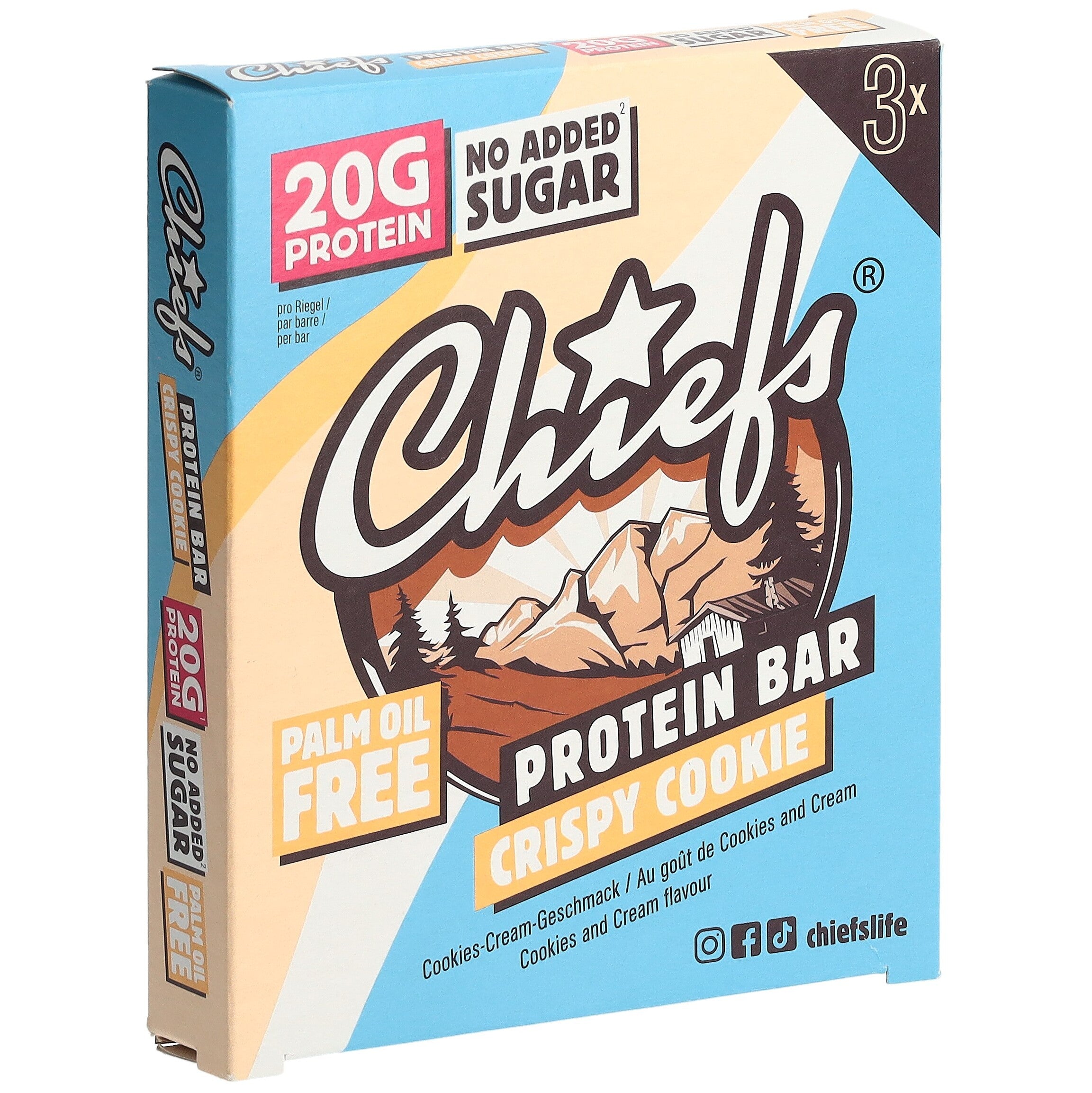 Proteinriegel überzogen mit Vollmilchschokolade, mit 9 % Crispies, mit Süßungsmitteln. Cookies-Cream-Geschmack.